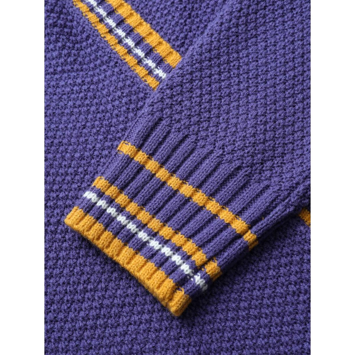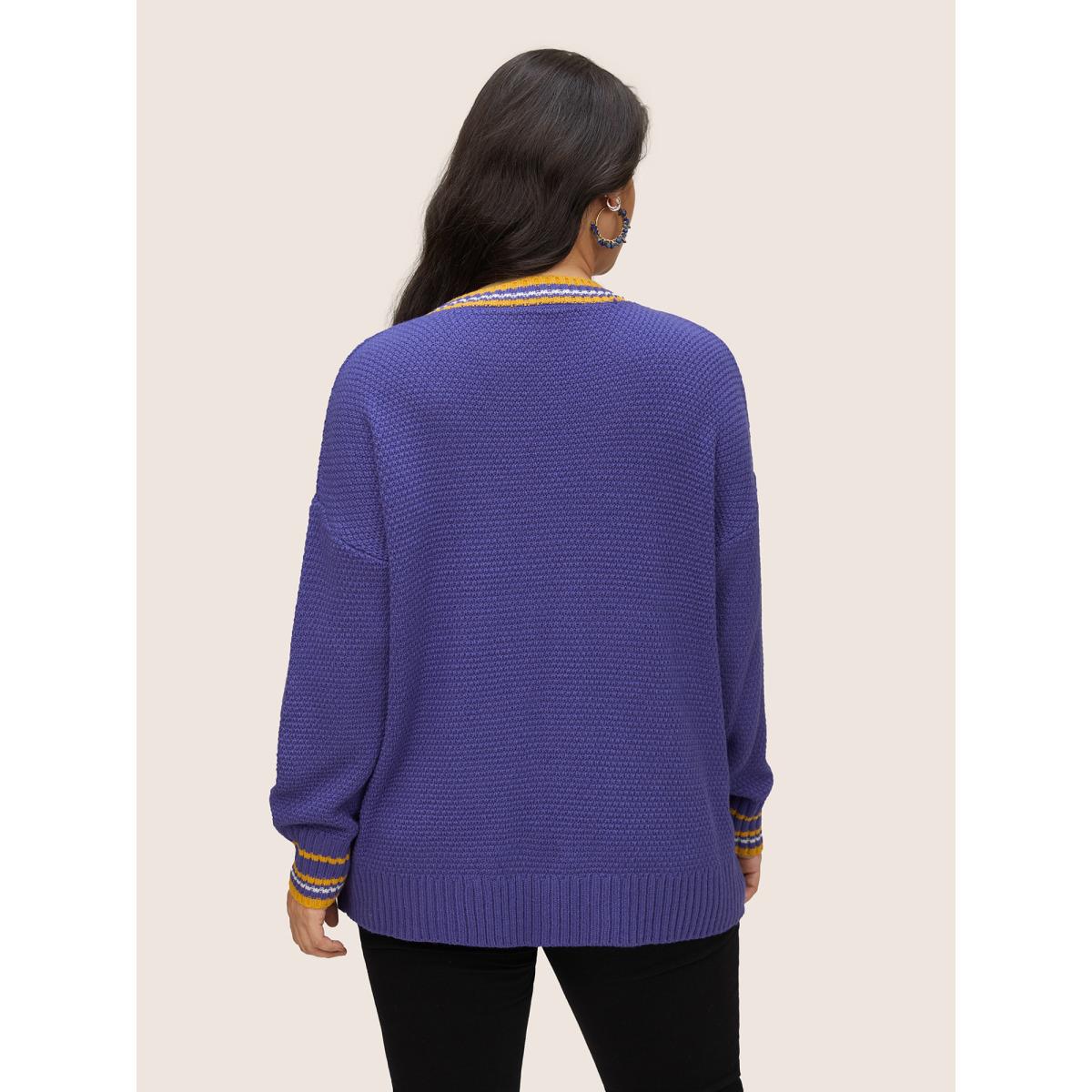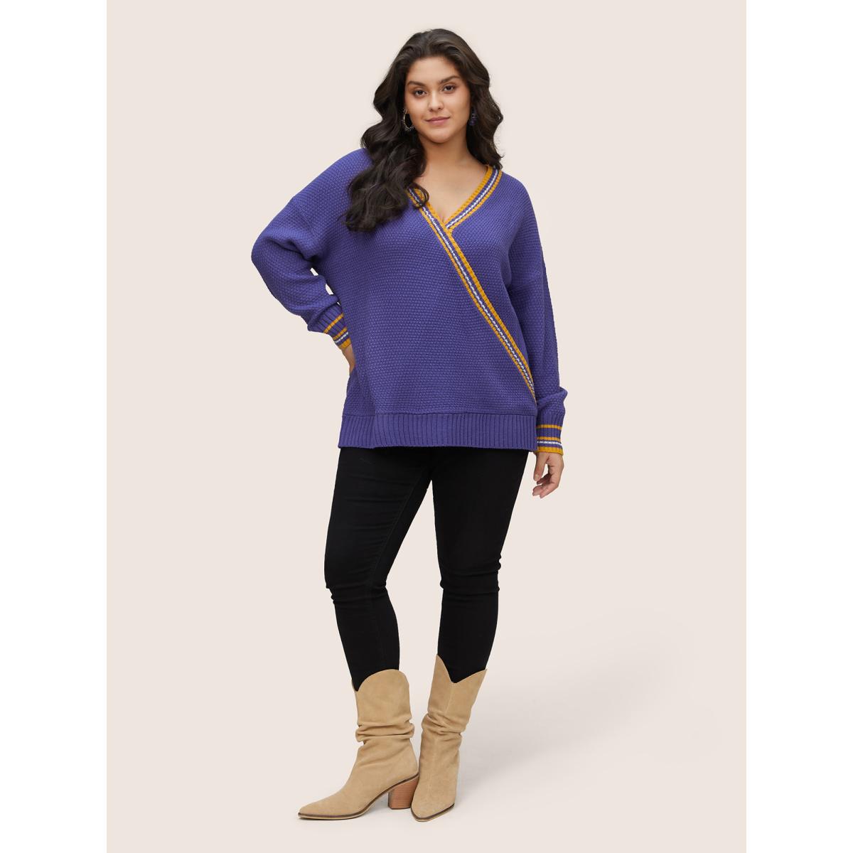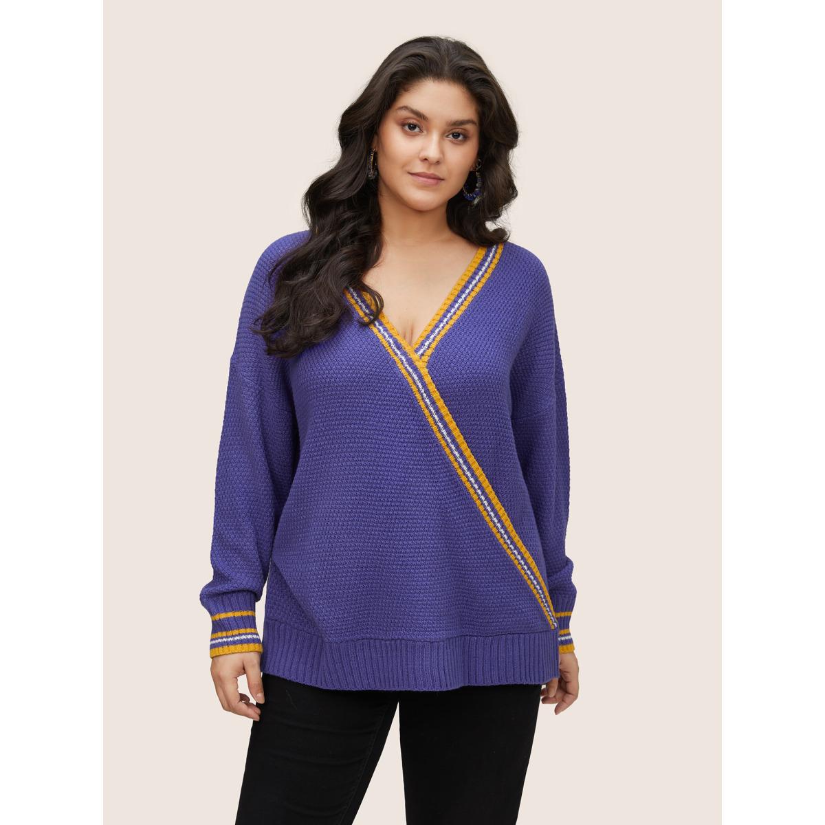 Plus Size Striped Contrast Wrap Knit Pullover Blackcurrant Women Casual Loose Long Sleeve V-neck Dailywear Pullovers BloomChic 14-16/1X