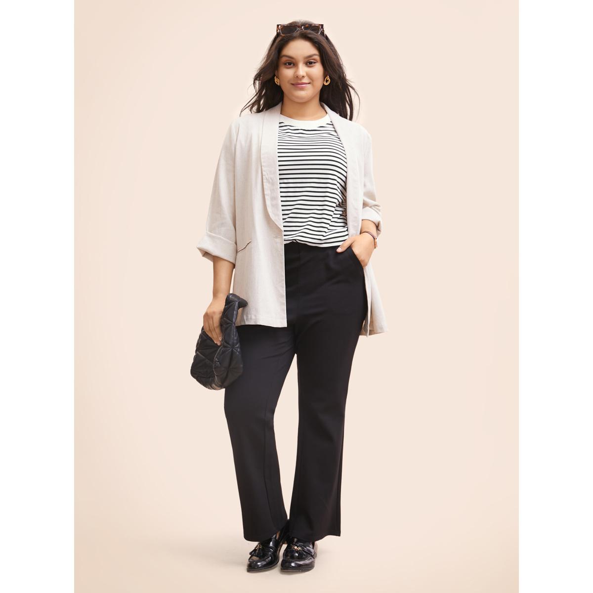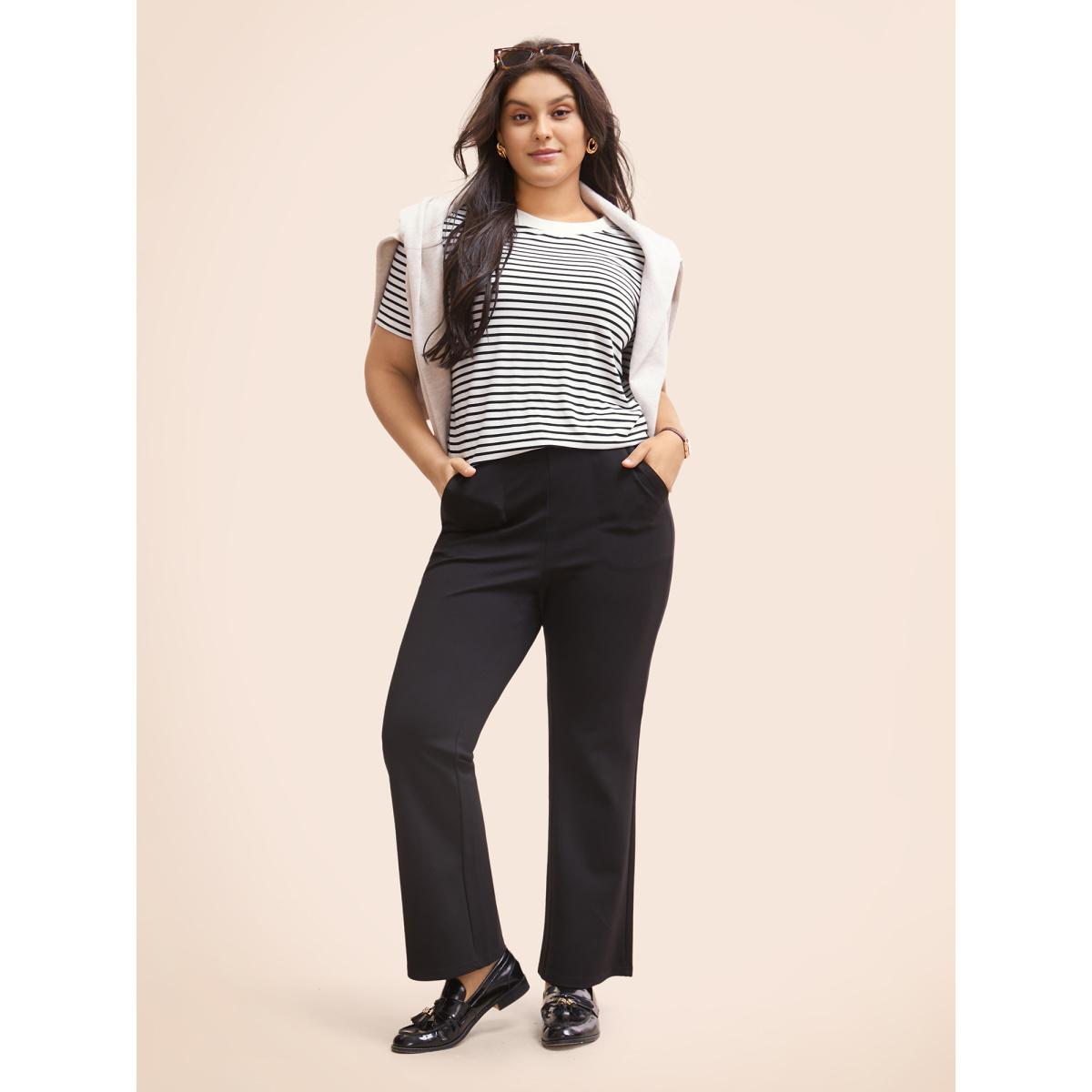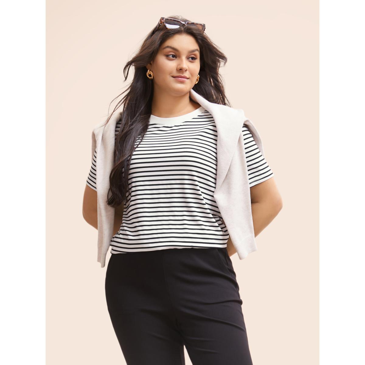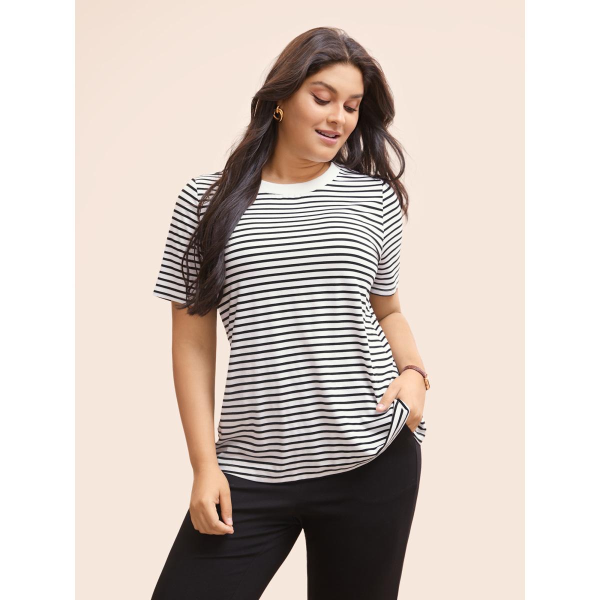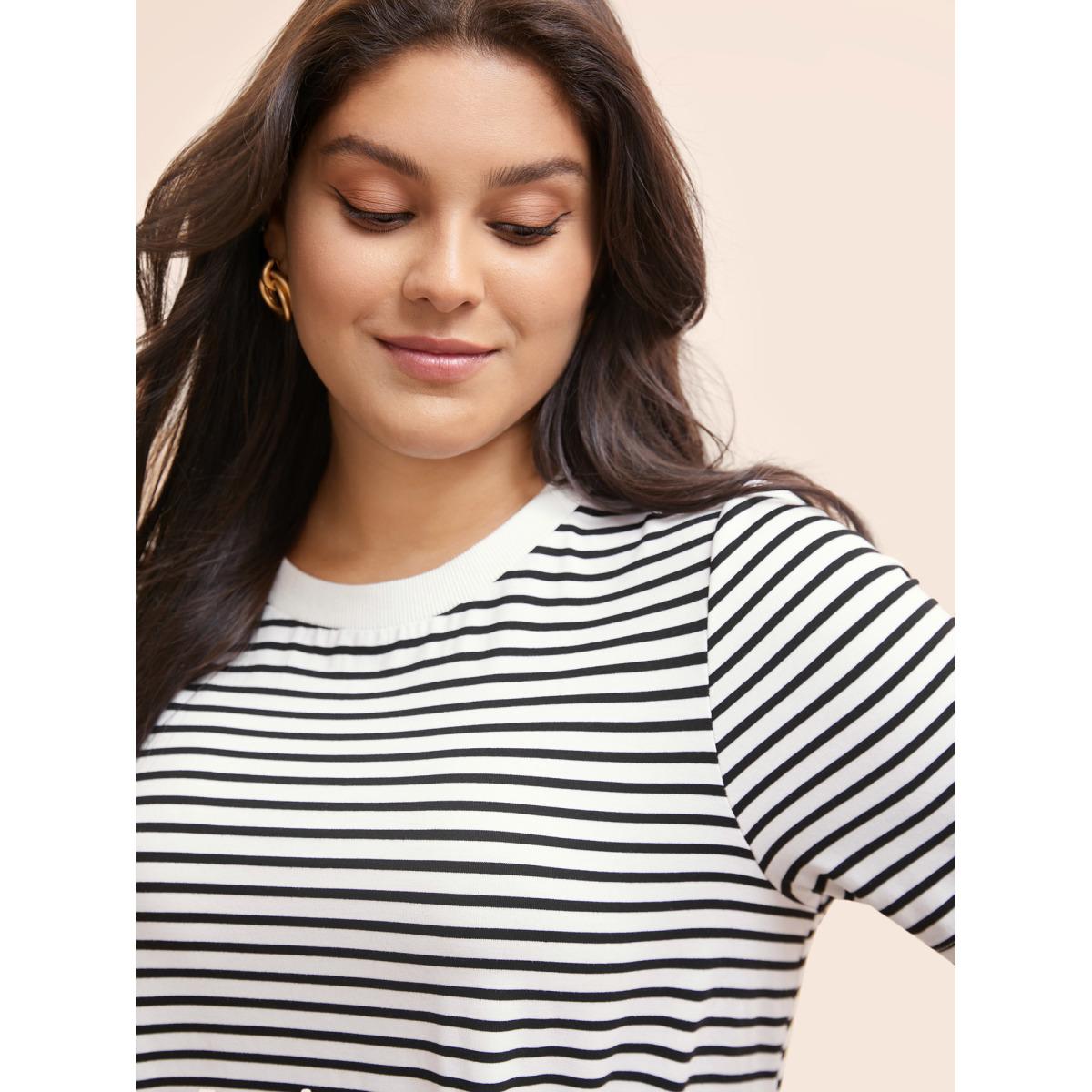 Plus Size Striped Crew Neck Rib Knit T-shirt Originalwhite Women Work From Home Contrast Round Neck Work T-shirts BloomChic 14-16/1X