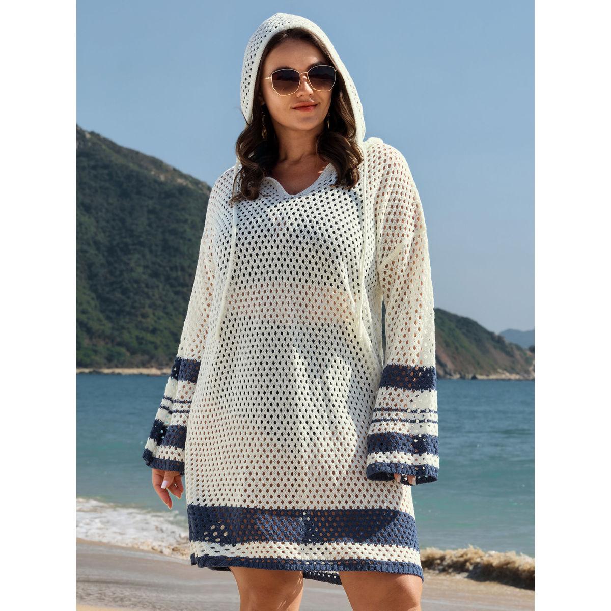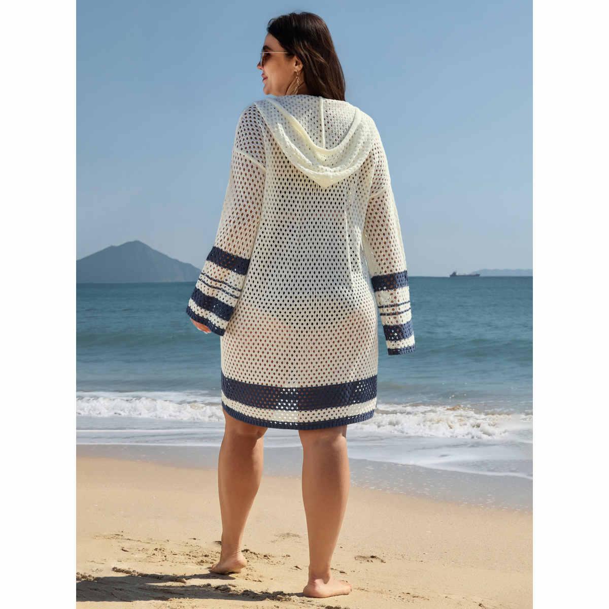 Plus Size Striped Cut-Out Hooded Swim Cover-Up Women's Swimwear Originalwhite Resort Loose Contrast Curve Swim Cover Ups BloomChic 12/L