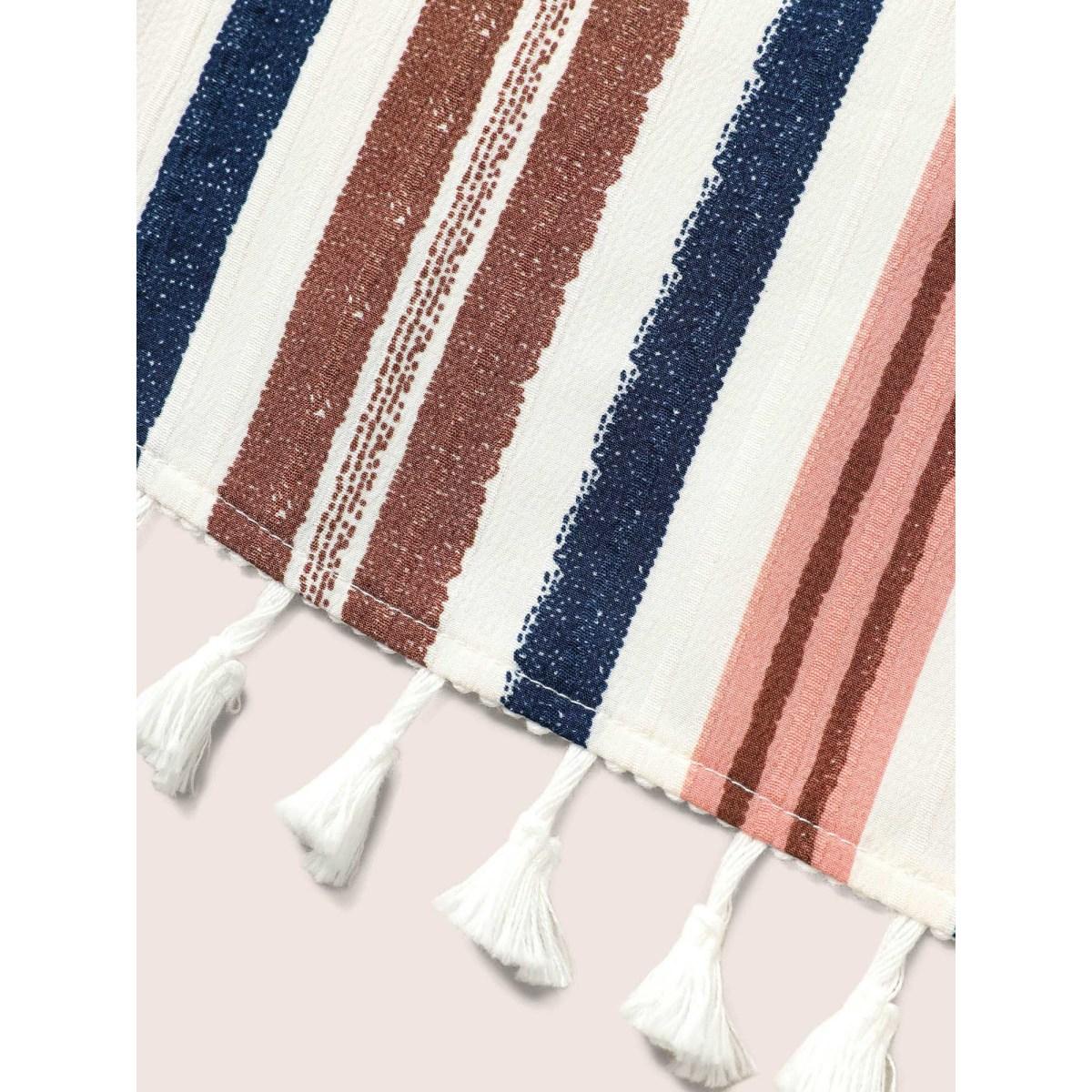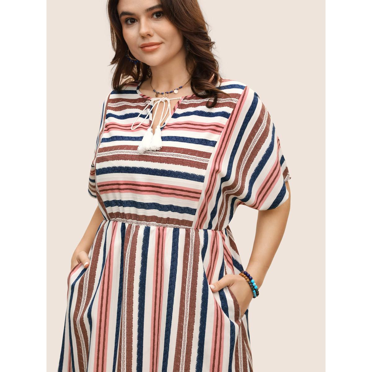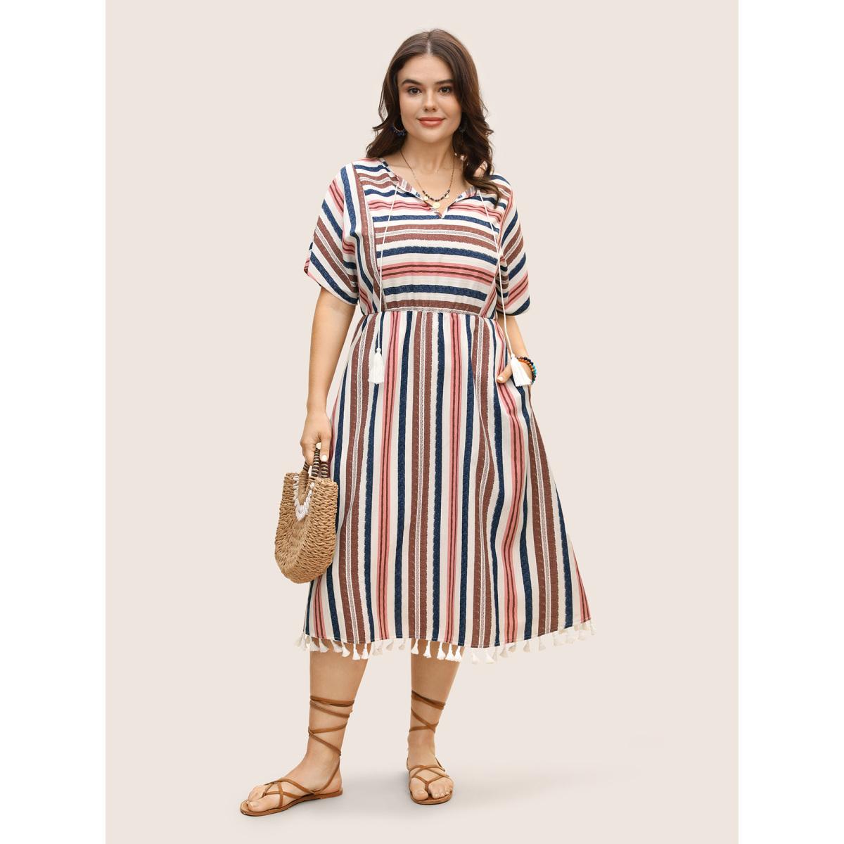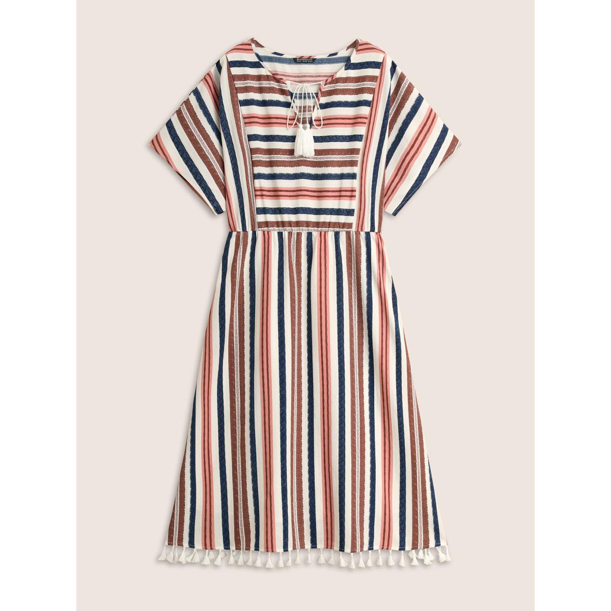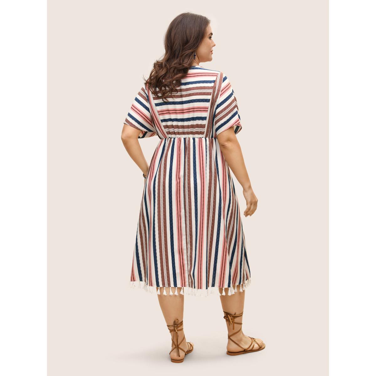 Plus Size Striped Elastic Waist Tassel Trim Gathered Dress Originalwhite Women Resort Flat collar with V-notch Short sleeve Curvy BloomChic 10/M
