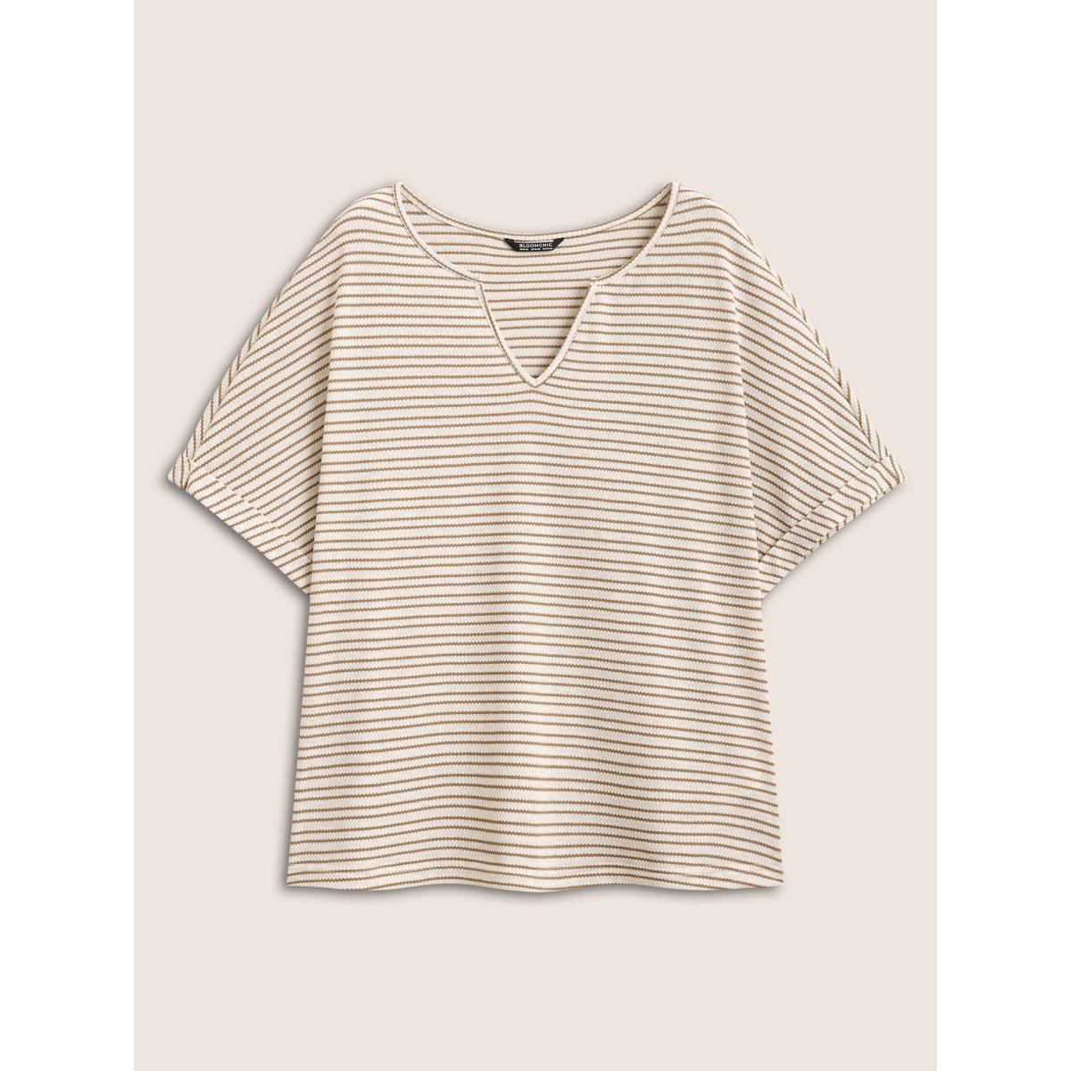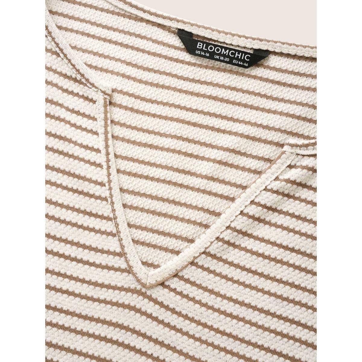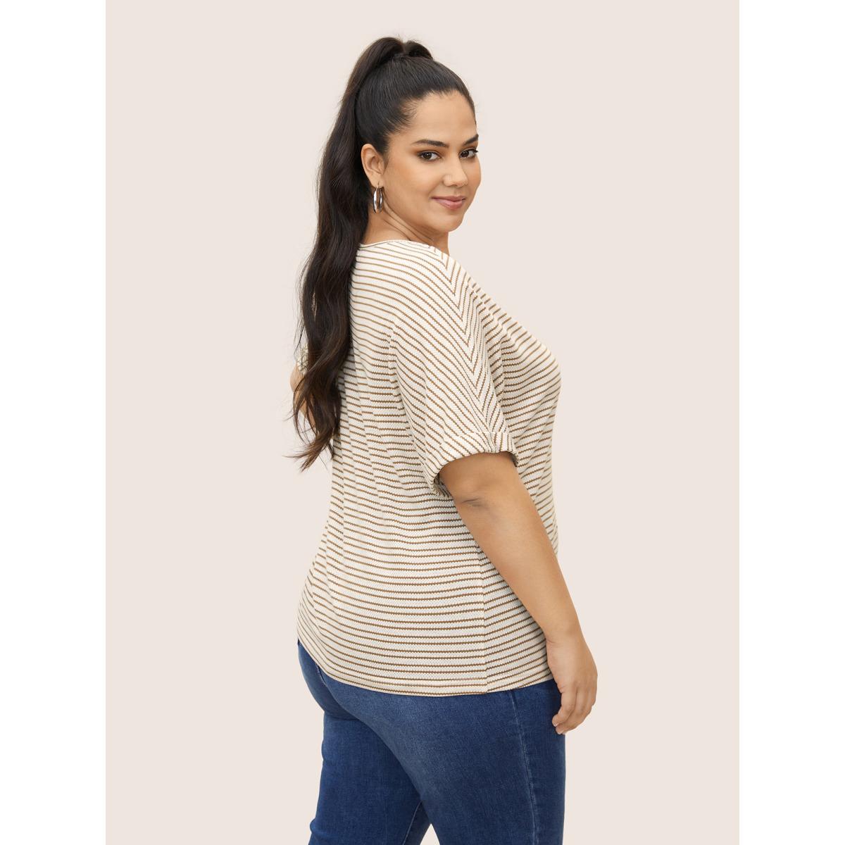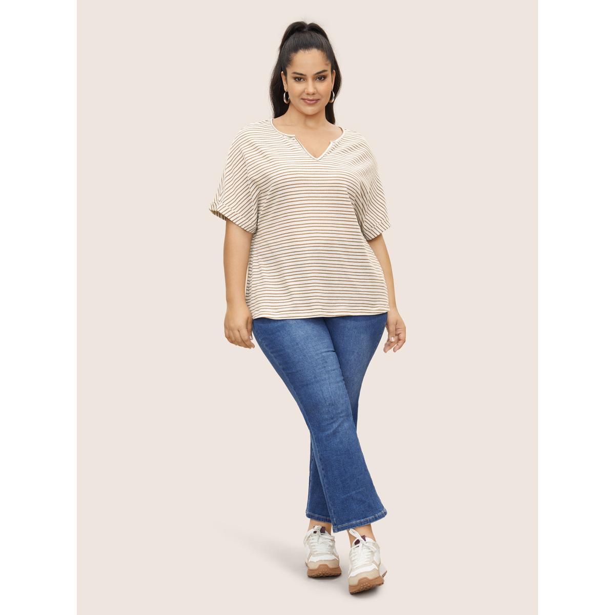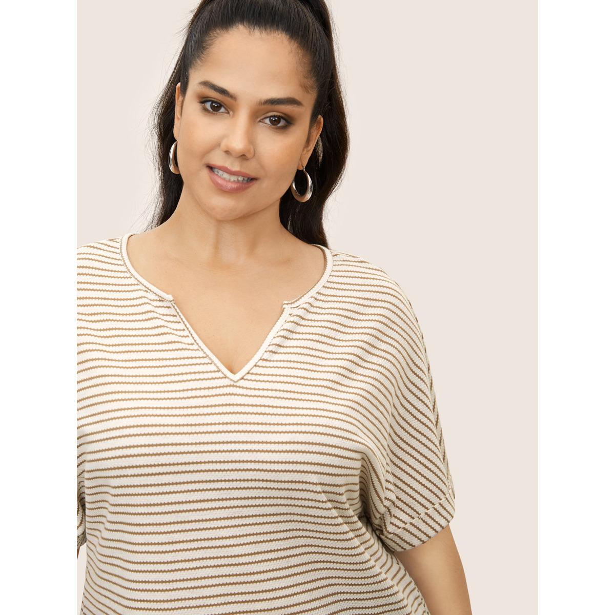 Plus Size Striped Flat Collar With V Notch Cuffed Sleeve T-shirt Tan Women Casual Contrast Flat collar with V-notch Everyday T-shirts BloomChic 18-20/2X