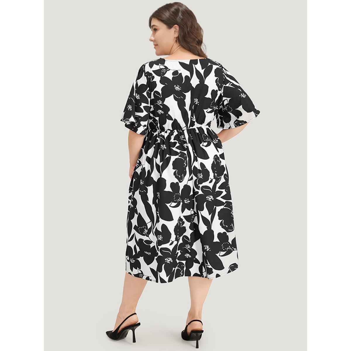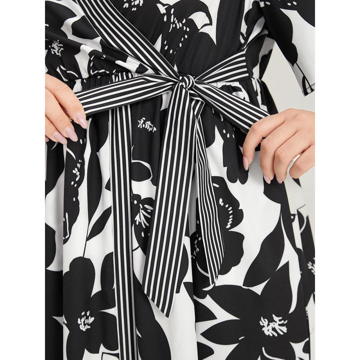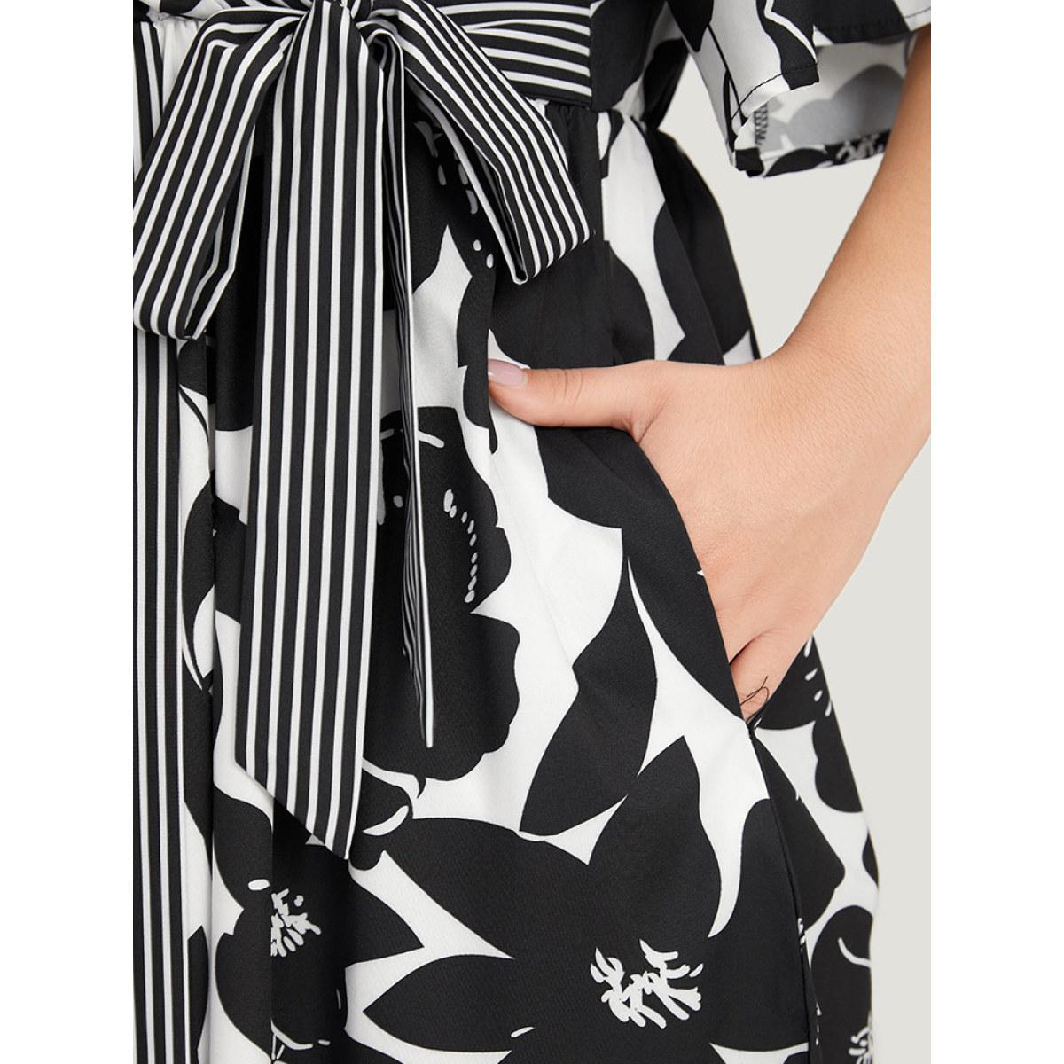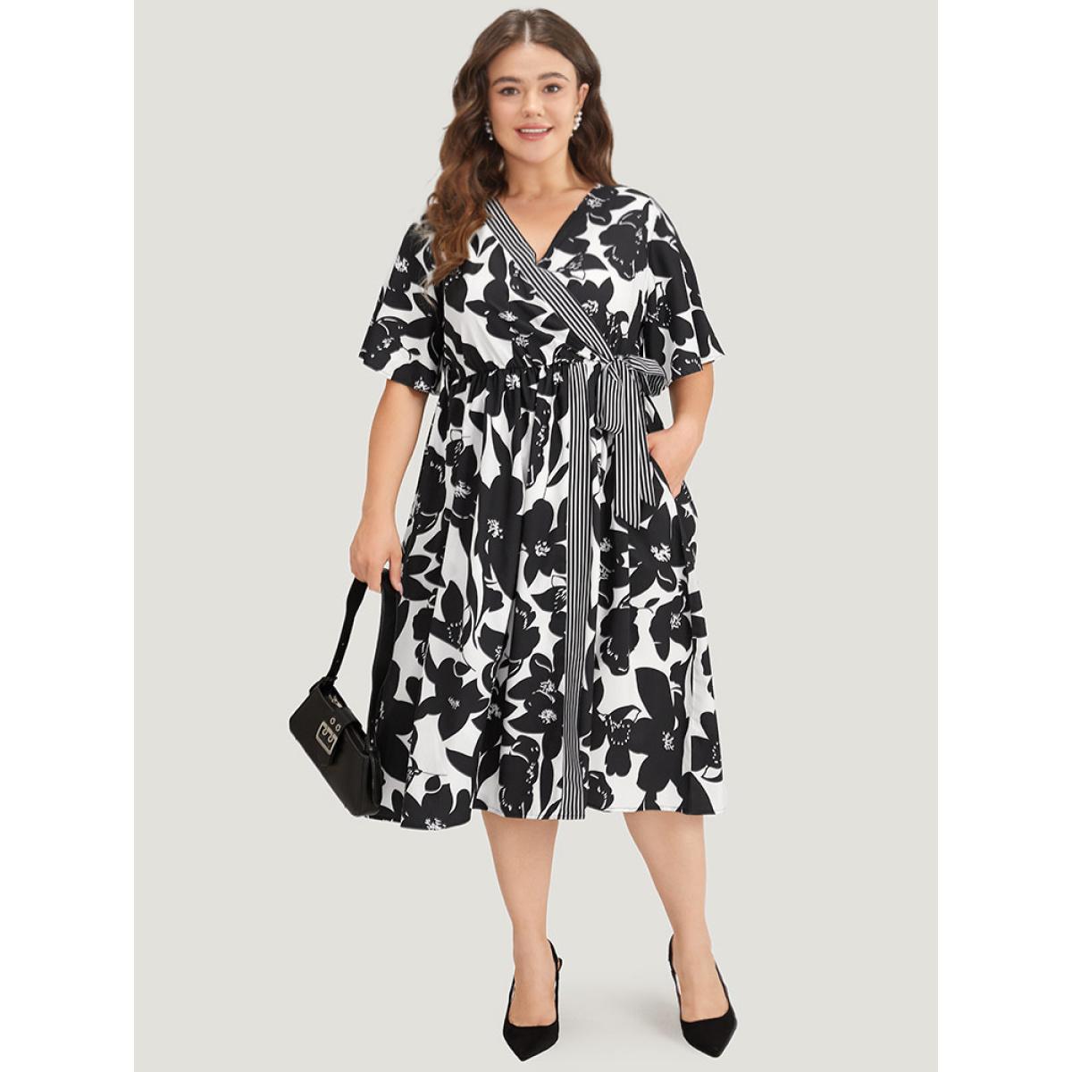 Plus Size Striped & Floral Print Pocket Bowknot Patchwork Dress White Women Office Printed V-neck Short sleeve Curvy Midi Dress BloomChic 28/5X