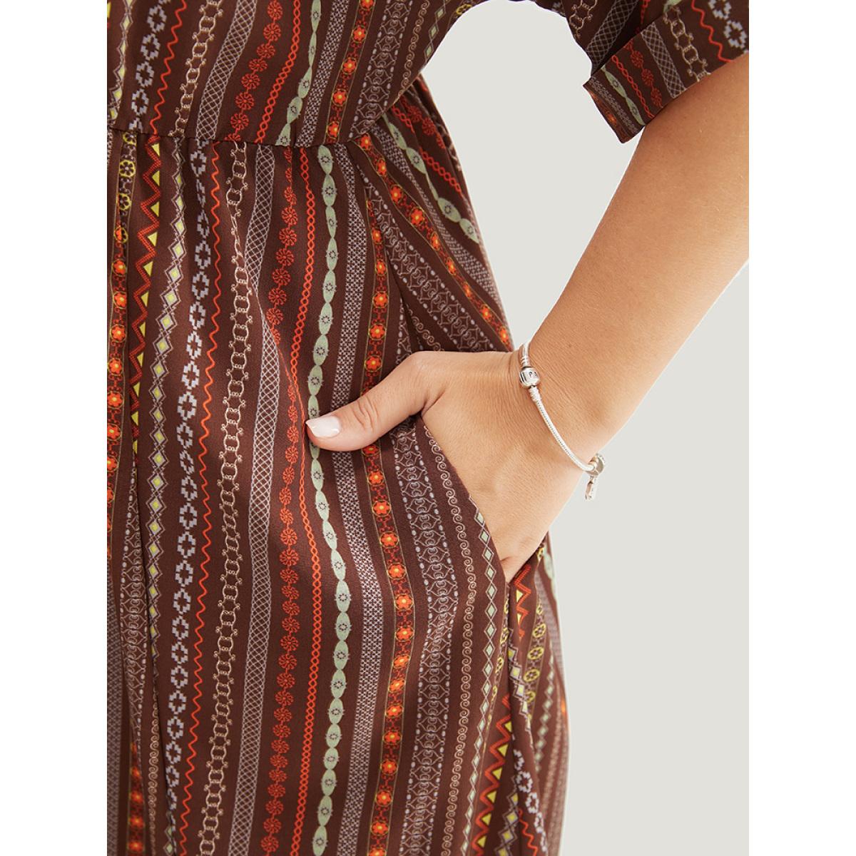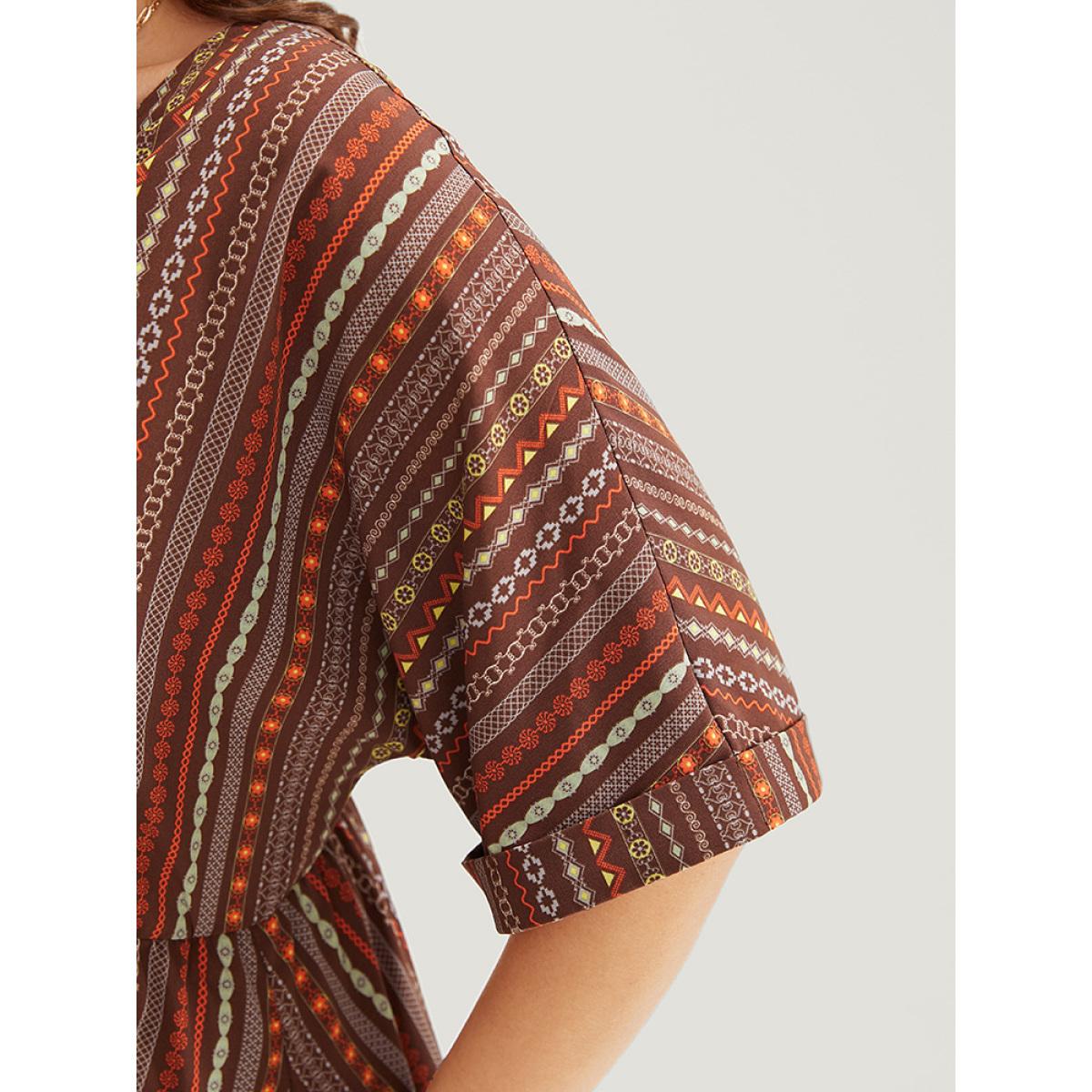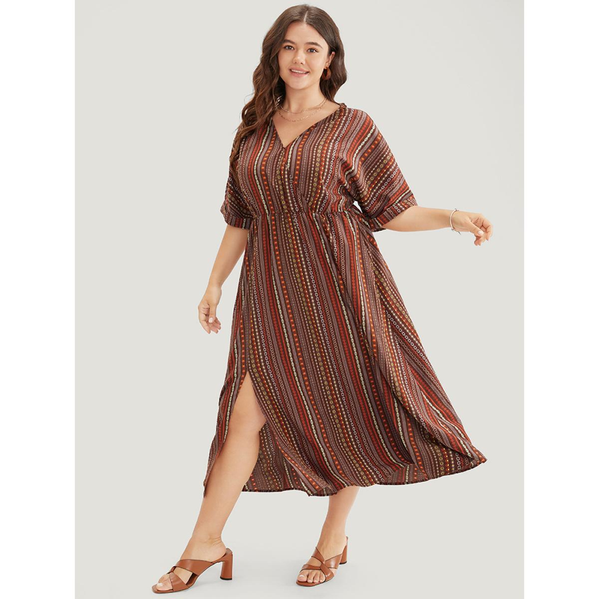Plus Size Striped Geometric Dolman Sleeve Pocket Split Surplice Neck Ruffle Dress Brown Women Vacation Pocket Cold Shoulder Short sleeve Curvy Midi Dress BloomChic 22-24/3X