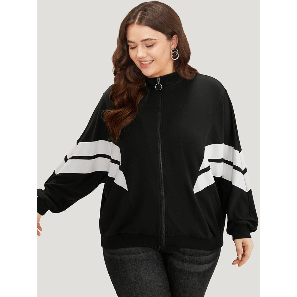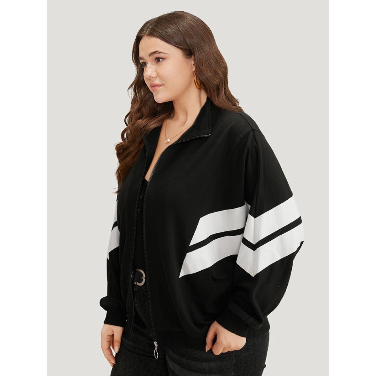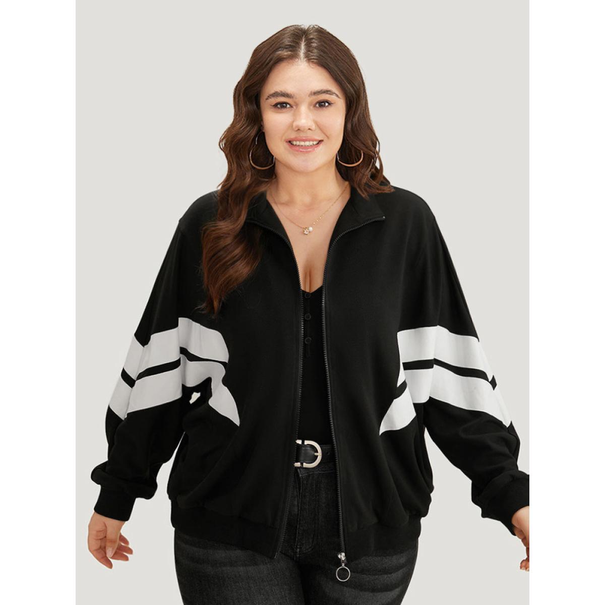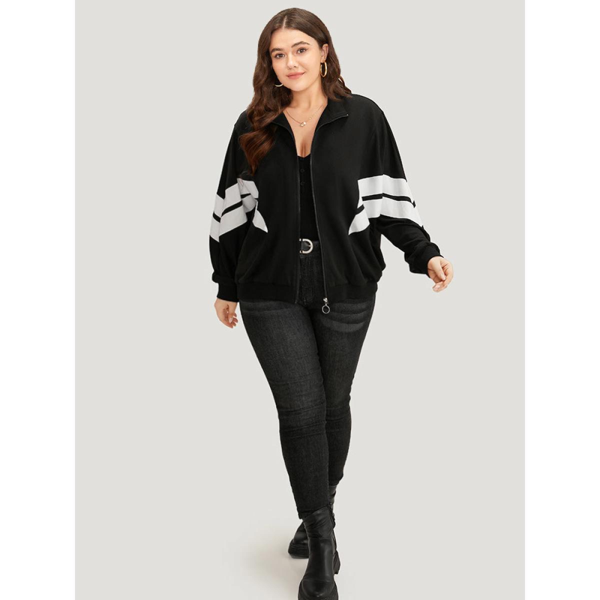Plus Size Striped Geometric Mock Neck Zipper Jacket Women Black Contrast Everyday Jackets BloomChic 10/M