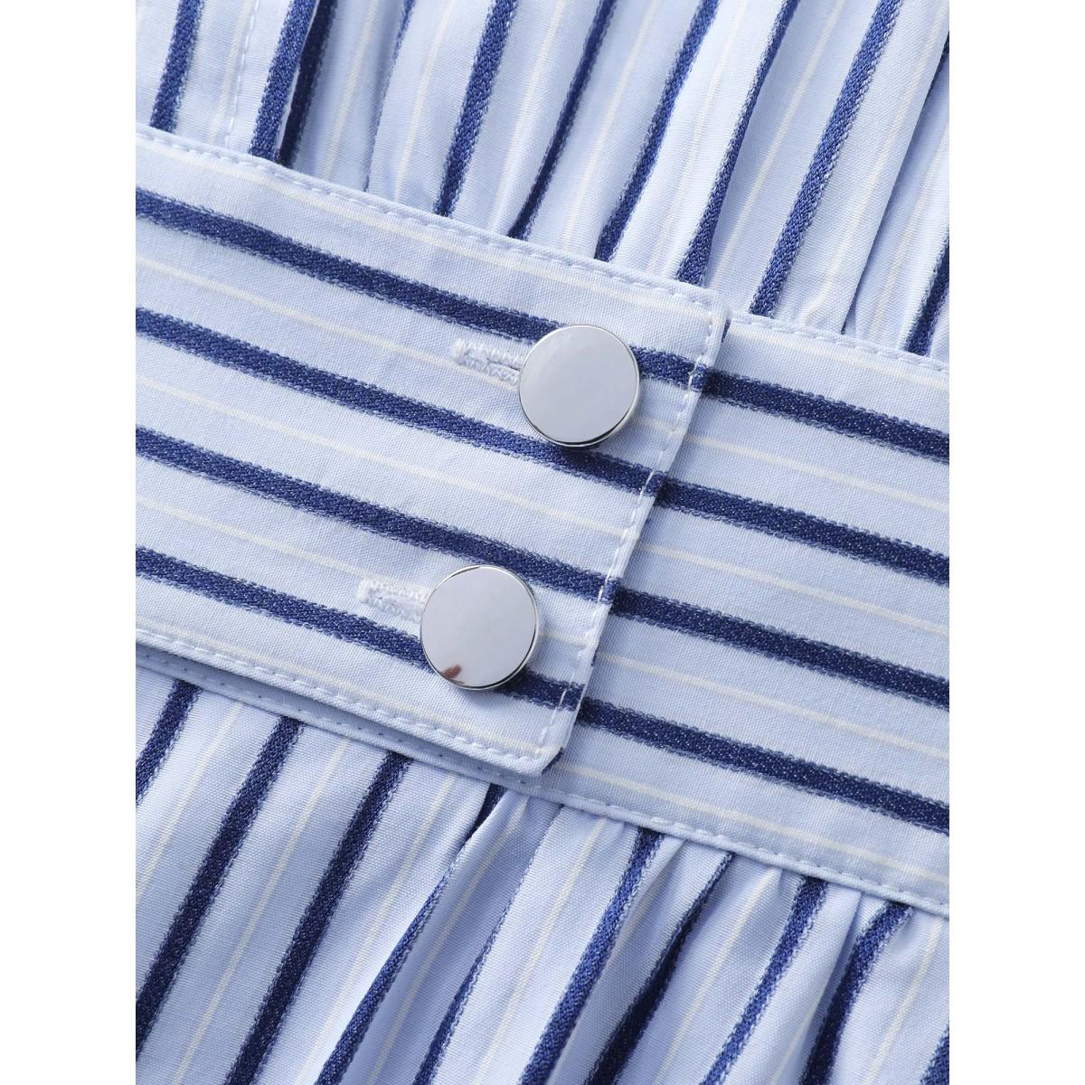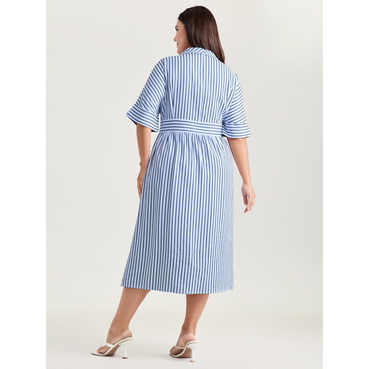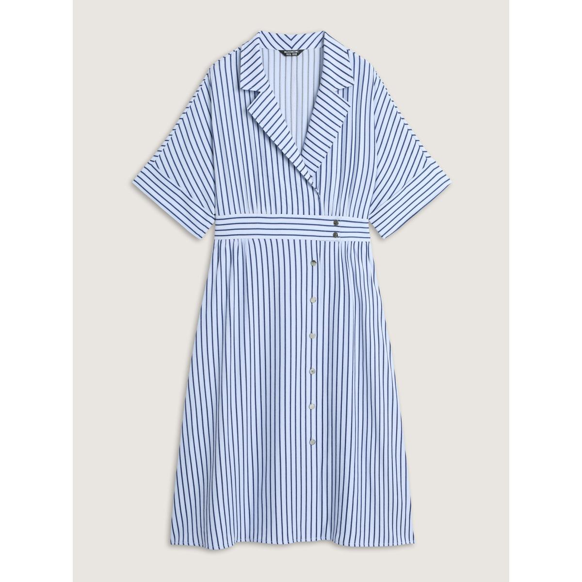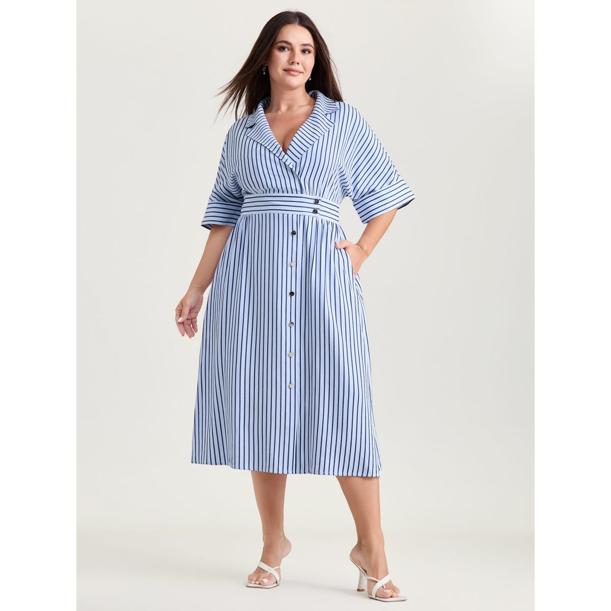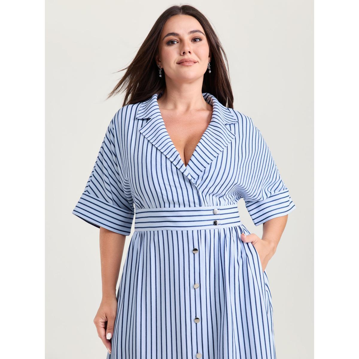 Plus Size Striped Notched Lapel Collar Midi Dress LightBlue Women Office Button Suit Collar Half Sleeve Curvy BloomChic 18-20/2X