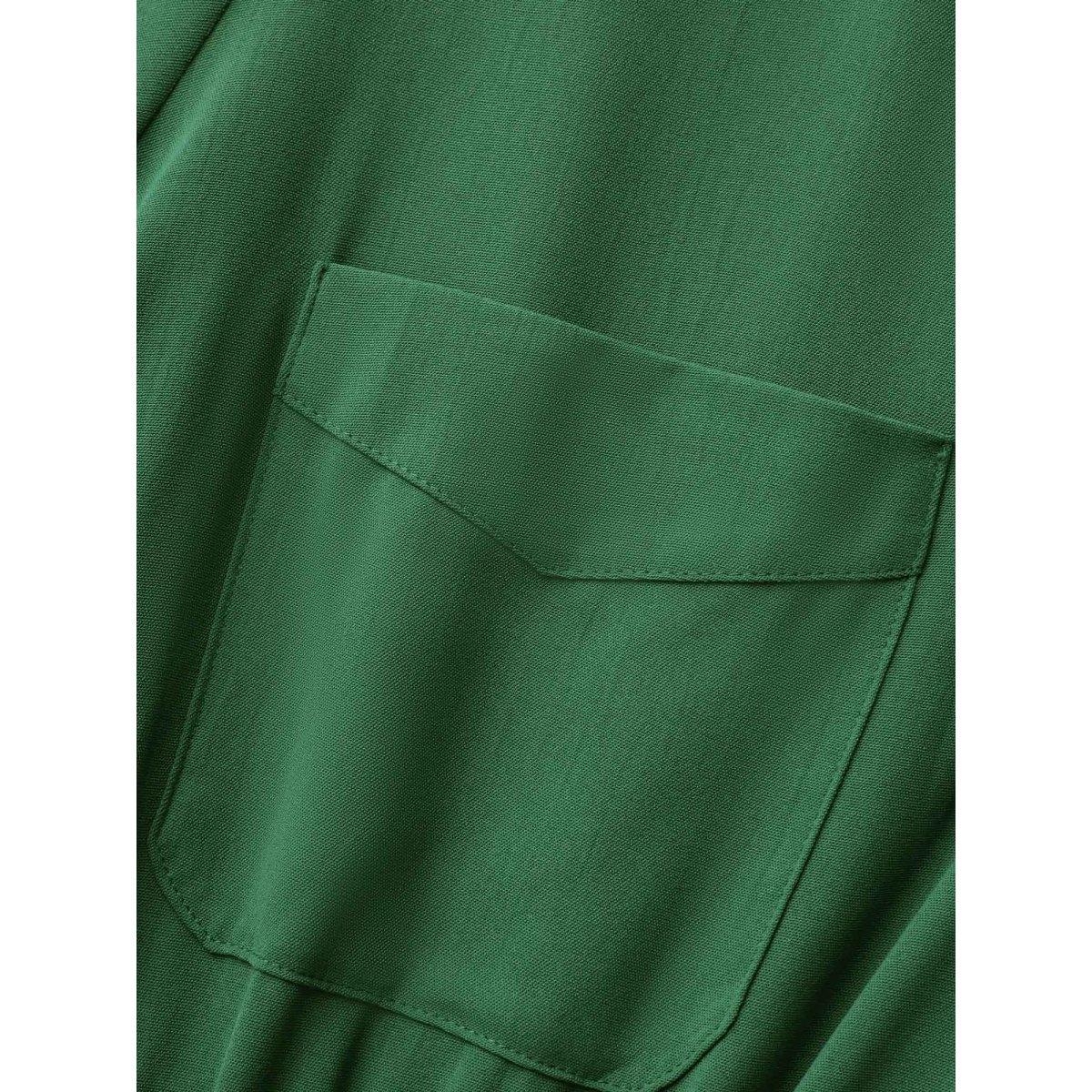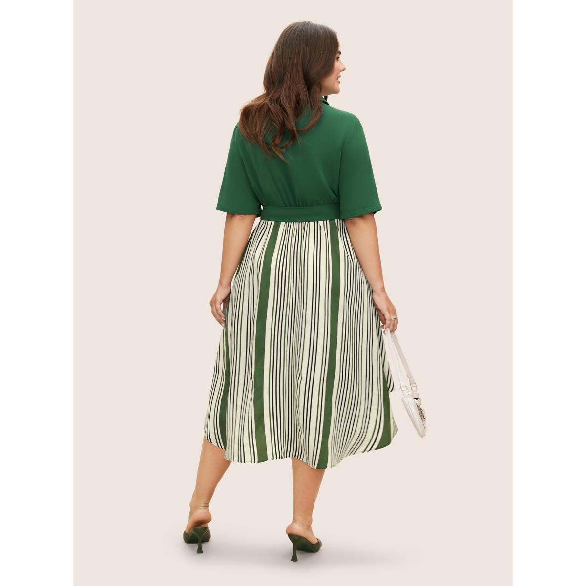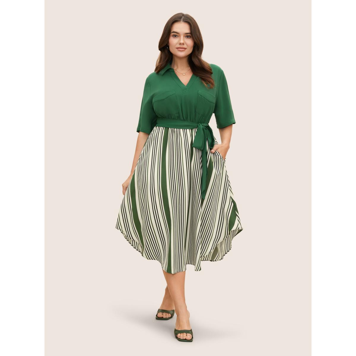 Plus Size Striped Patchwork Belted Patched Pocket Dress Truegreen Women At the Office Belted Shirt collar Half Sleeve Curvy BloomChic 28/5X