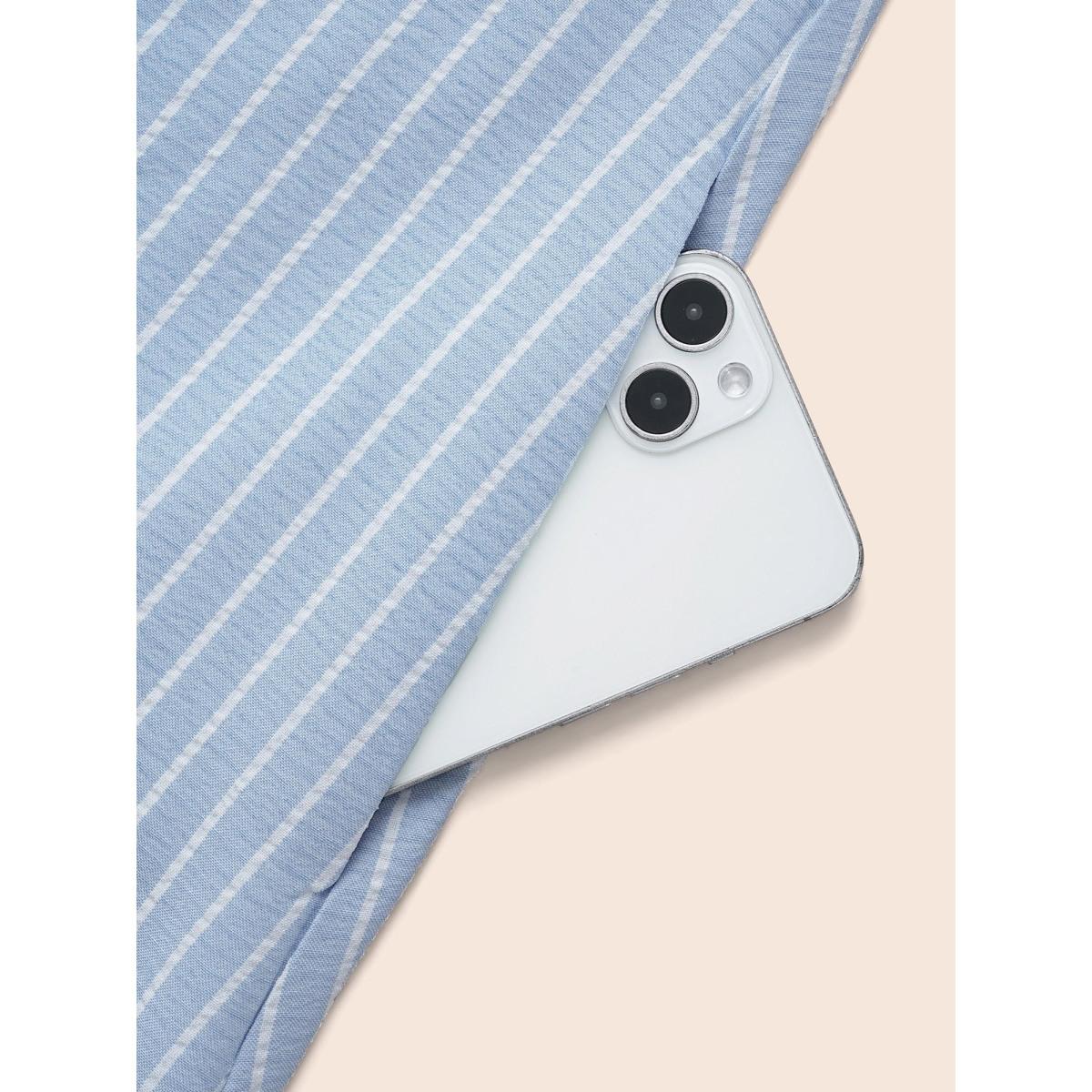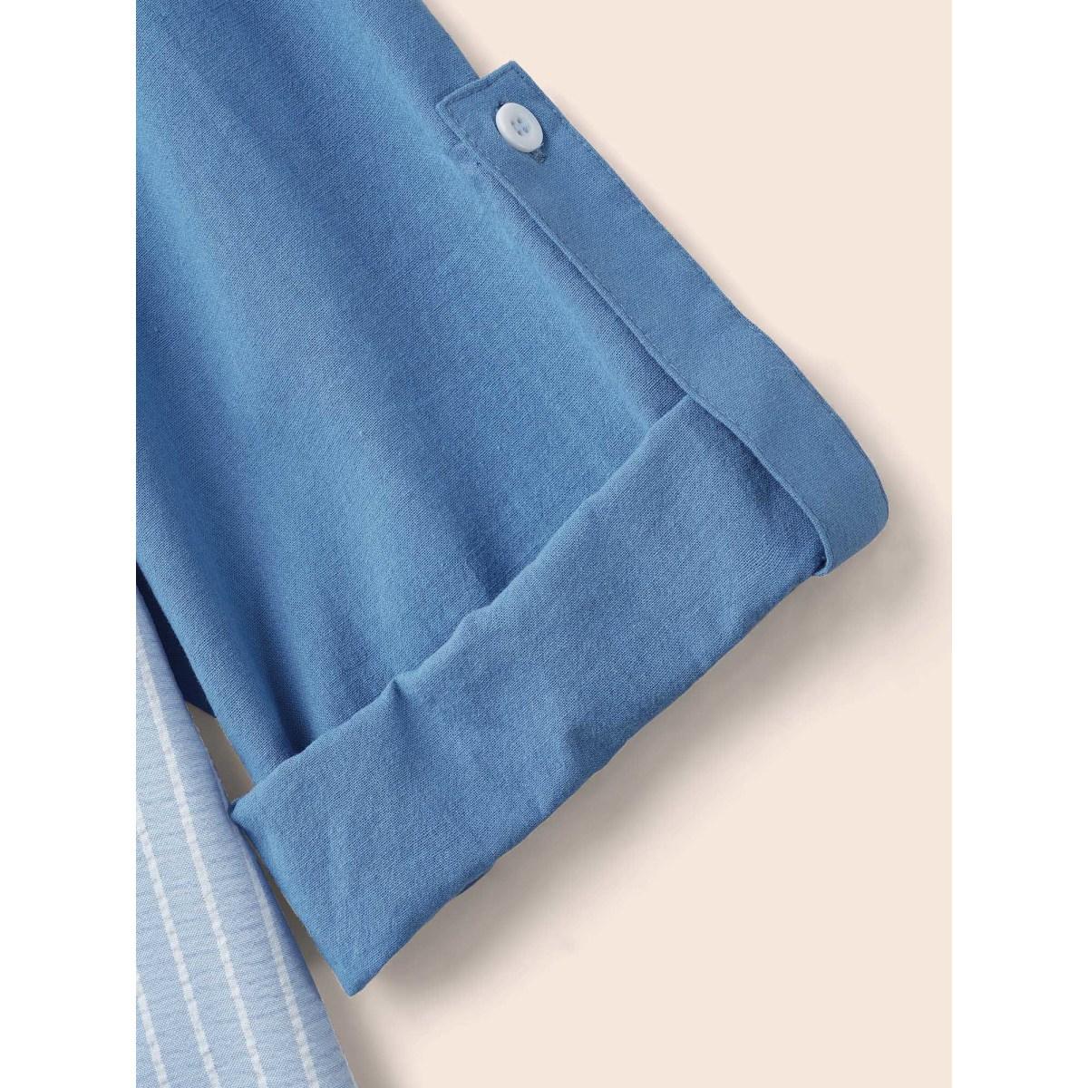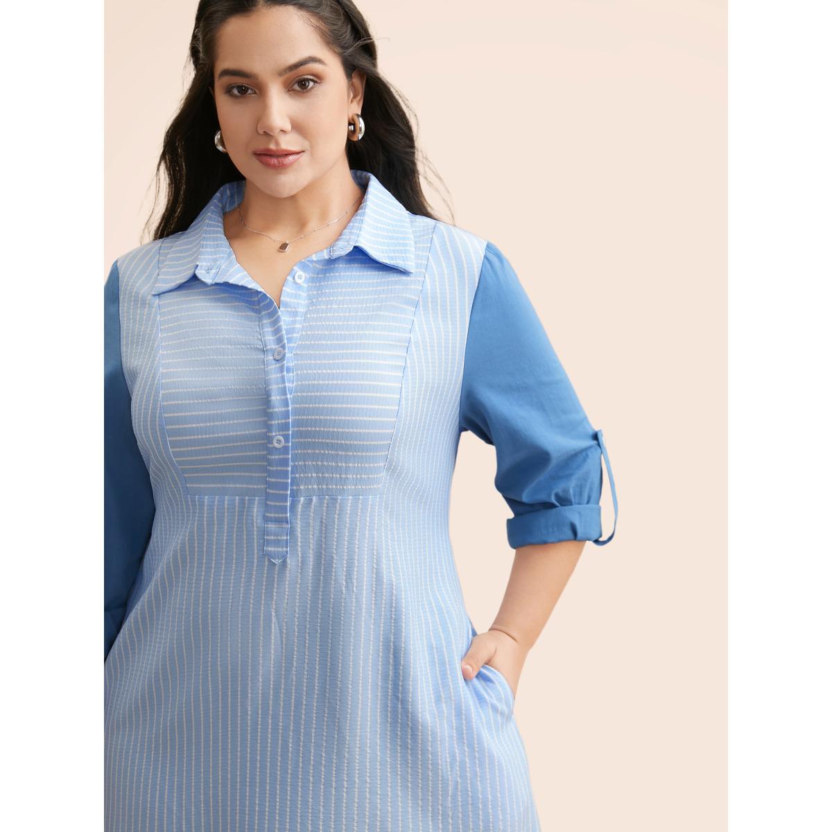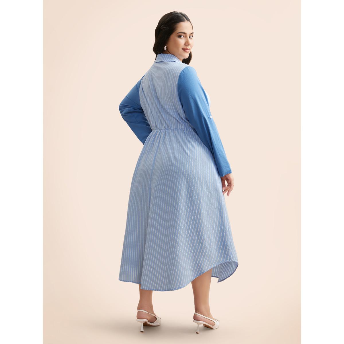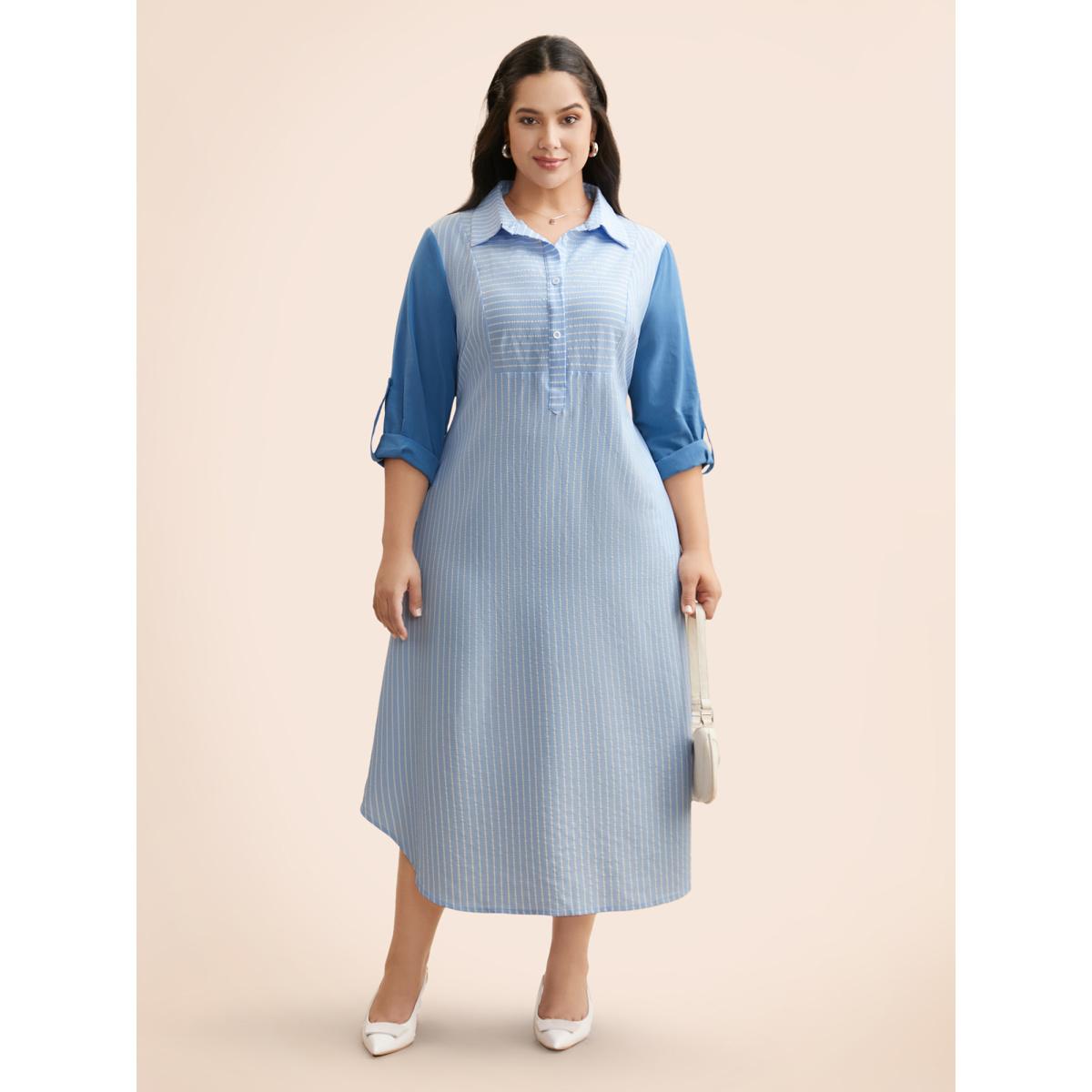 Plus Size Striped Patchwork Contrast Tab Sleeve Dress Skyblue Women Office Patchwork Shirt collar Long Sleeve Curvy BloomChic 18-20/2X