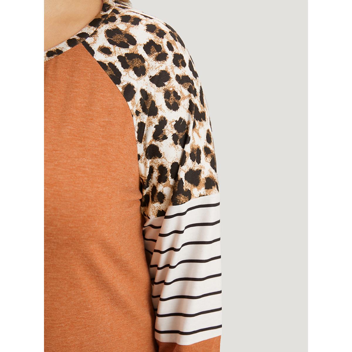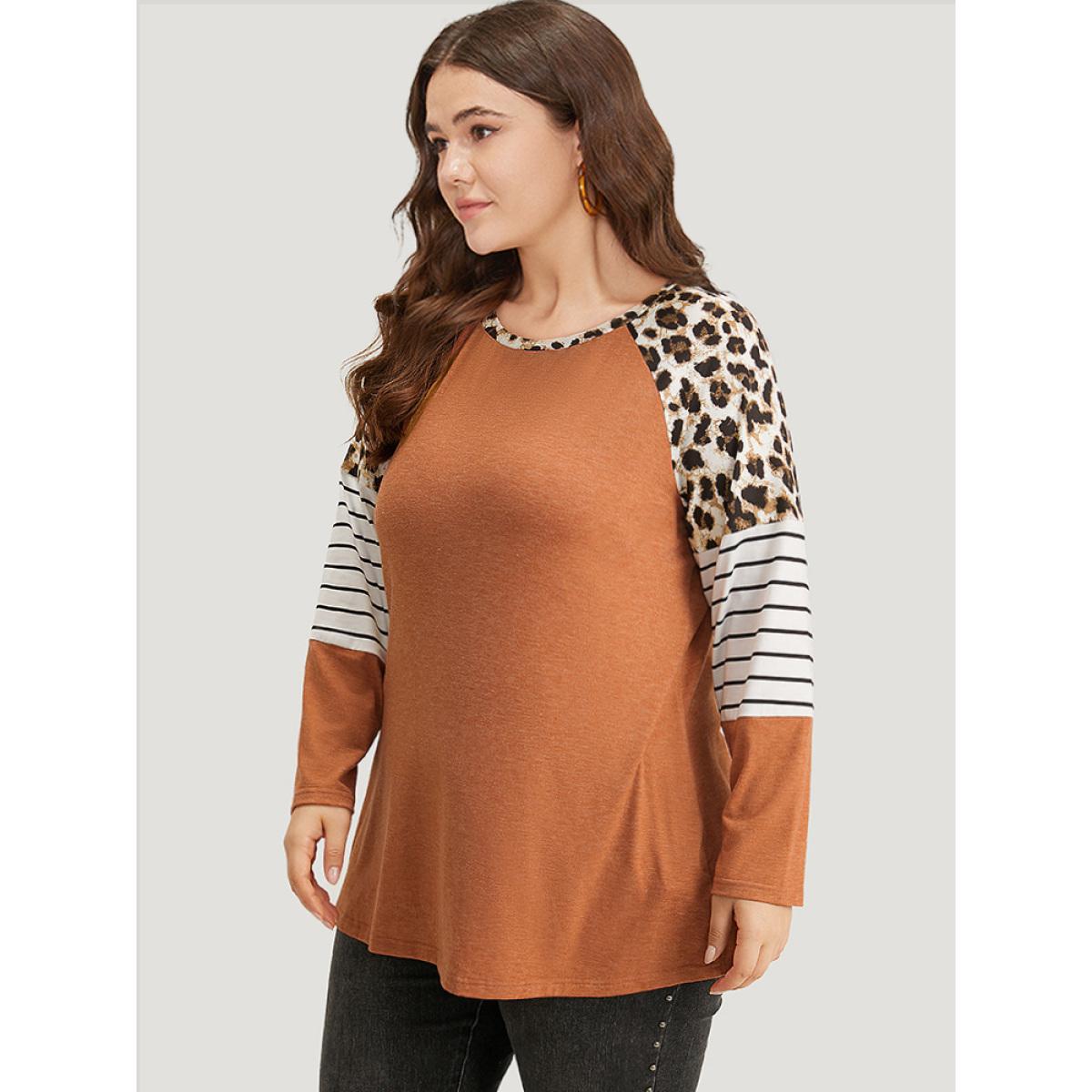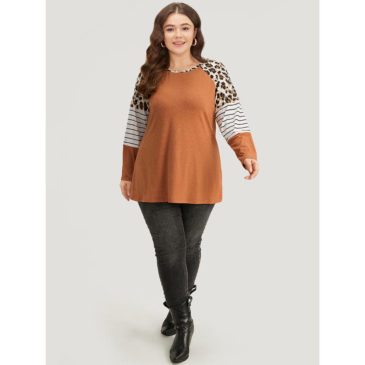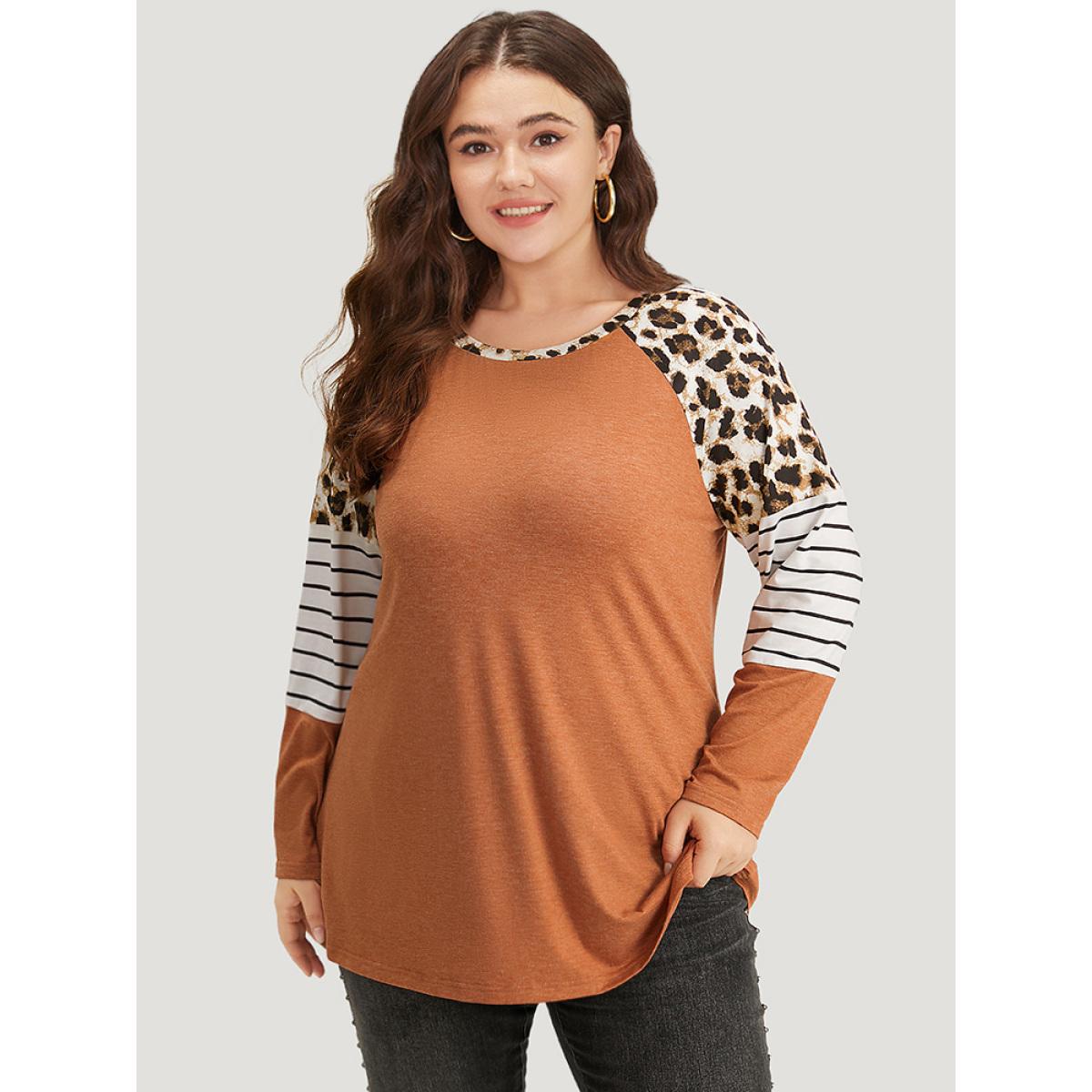 Plus Size Striped Patchwork Leopard Print Crew Neck T-shirt Chocolate Women Casual Contrast Leopard Round Neck Dailywear T-shirts BloomChic 30/6X
