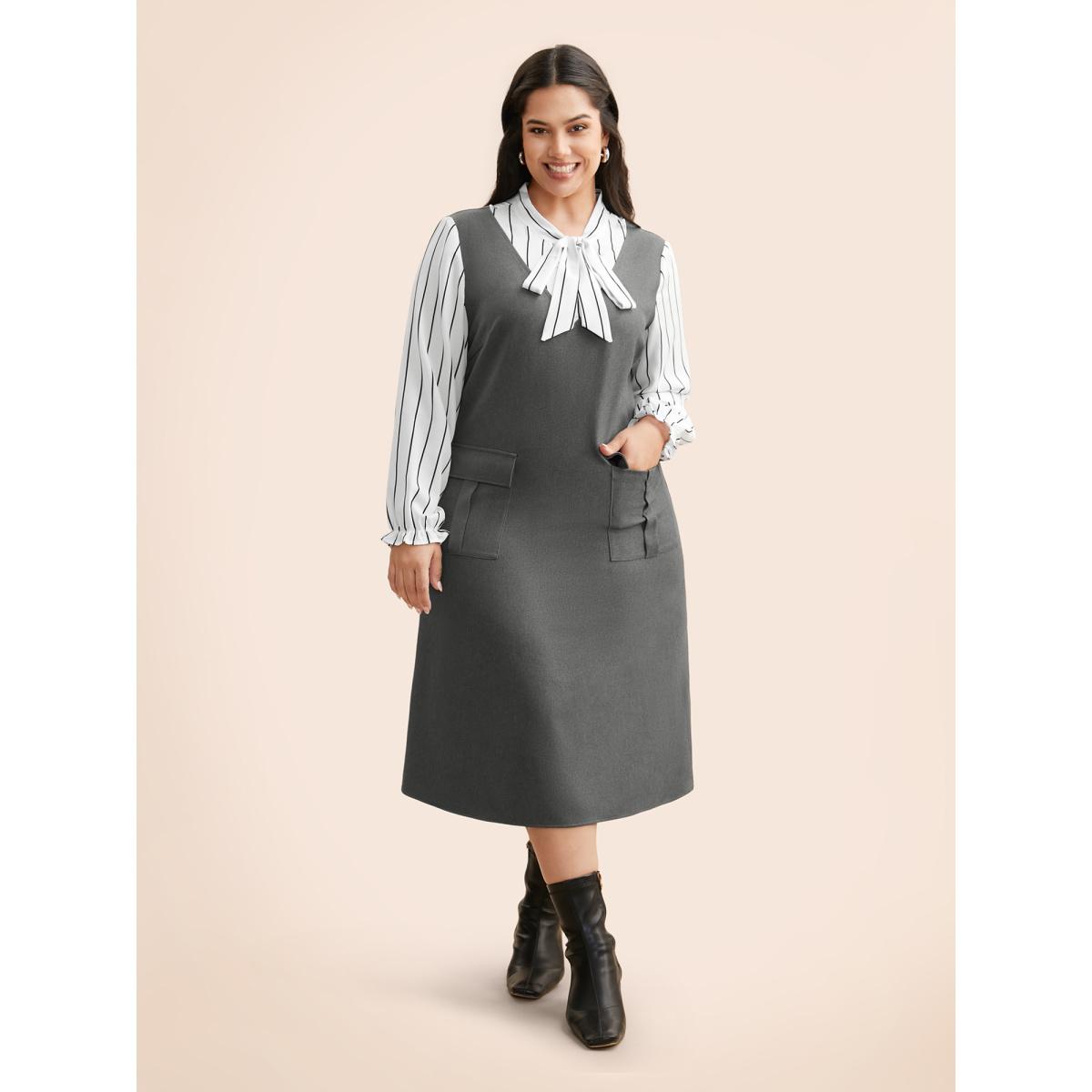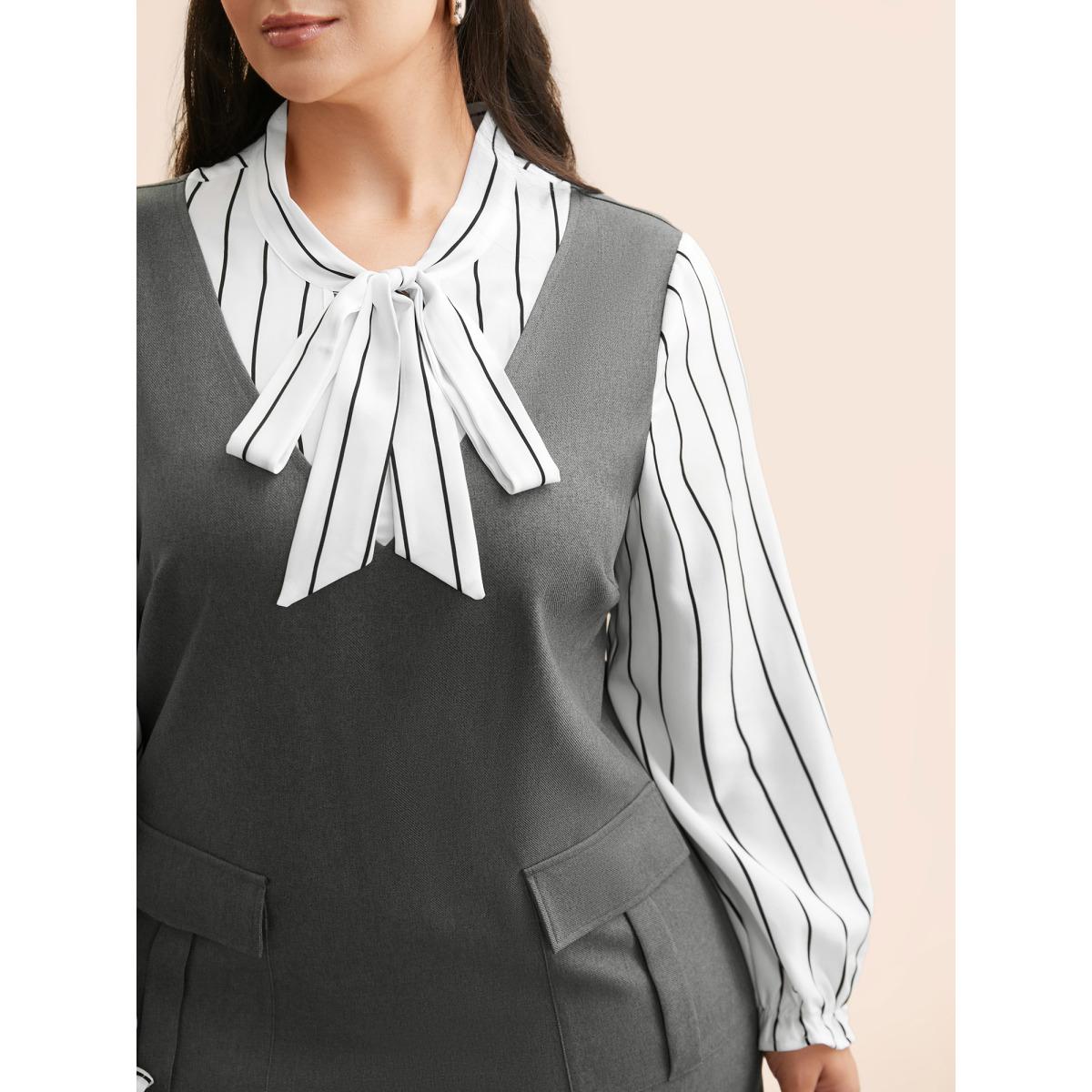 Plus Size Striped Patchwork Ribbon Tied Collar Dress DimGray Women At the Office Tie knot Ribbon-tied collar Long Sleeve Curvy BloomChic 14-16/1X