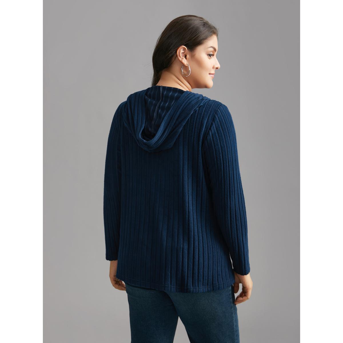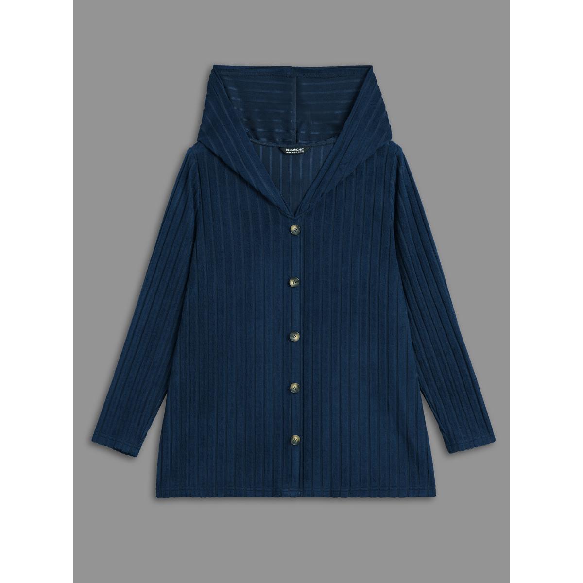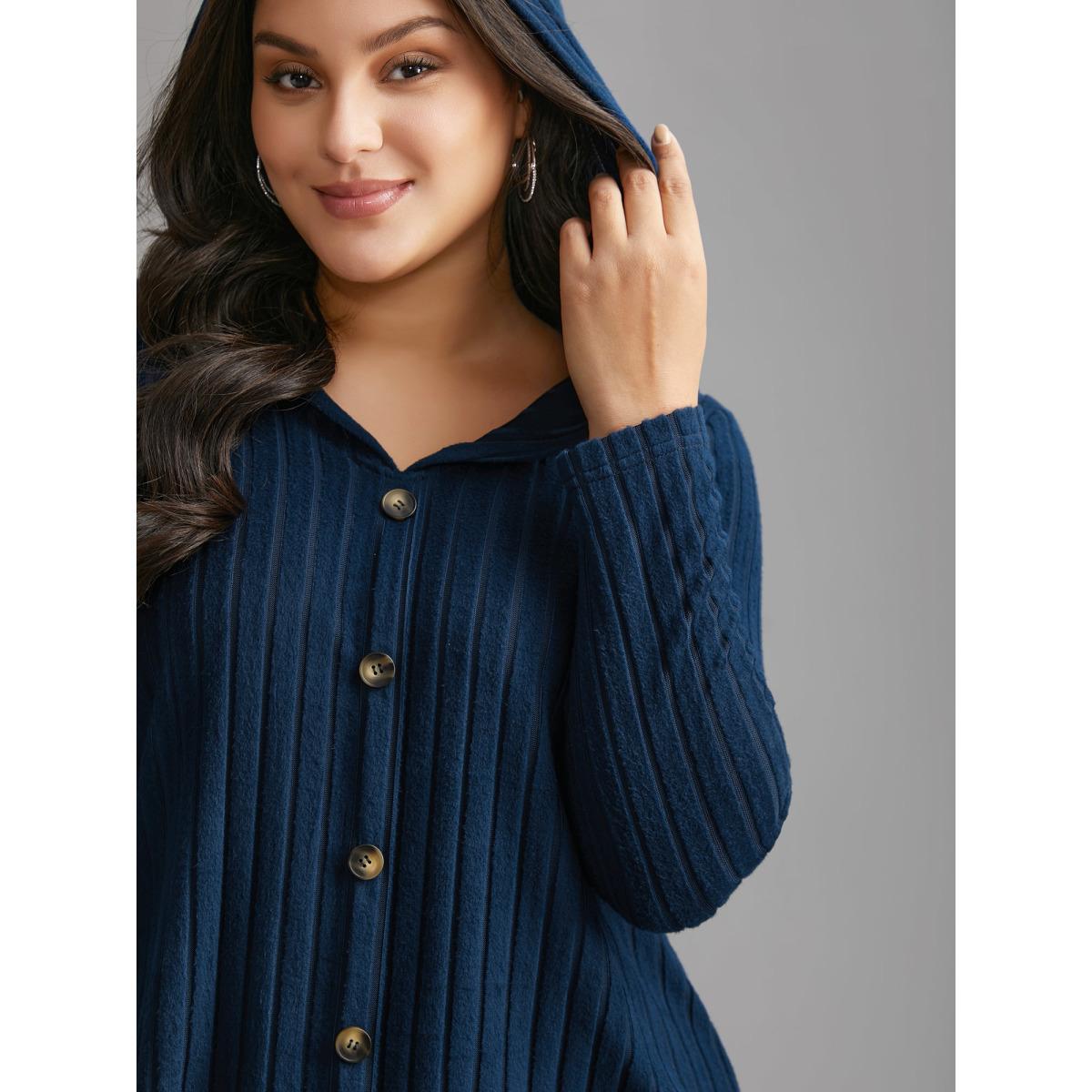 Plus Size Striped Pit Button Front Hooded T-shirt DarkBlue Women Casual Texture Hooded Everyday T-shirts BloomChic 12/L Product Image