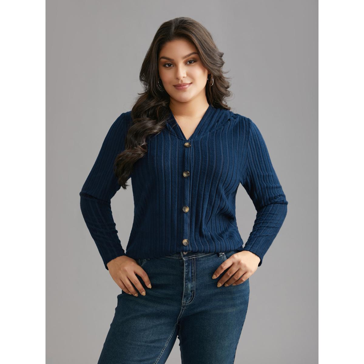 Plus Size Striped Pit Button Front Hooded T-shirt DarkBlue Women Casual Texture Hooded Everyday T-shirts BloomChic 12/L