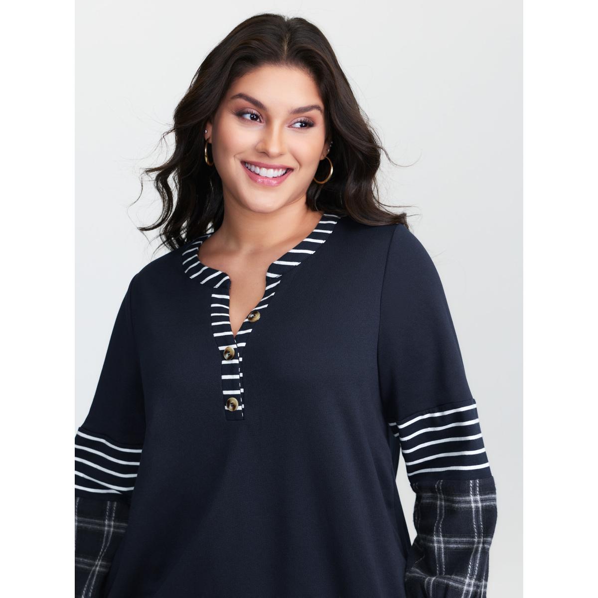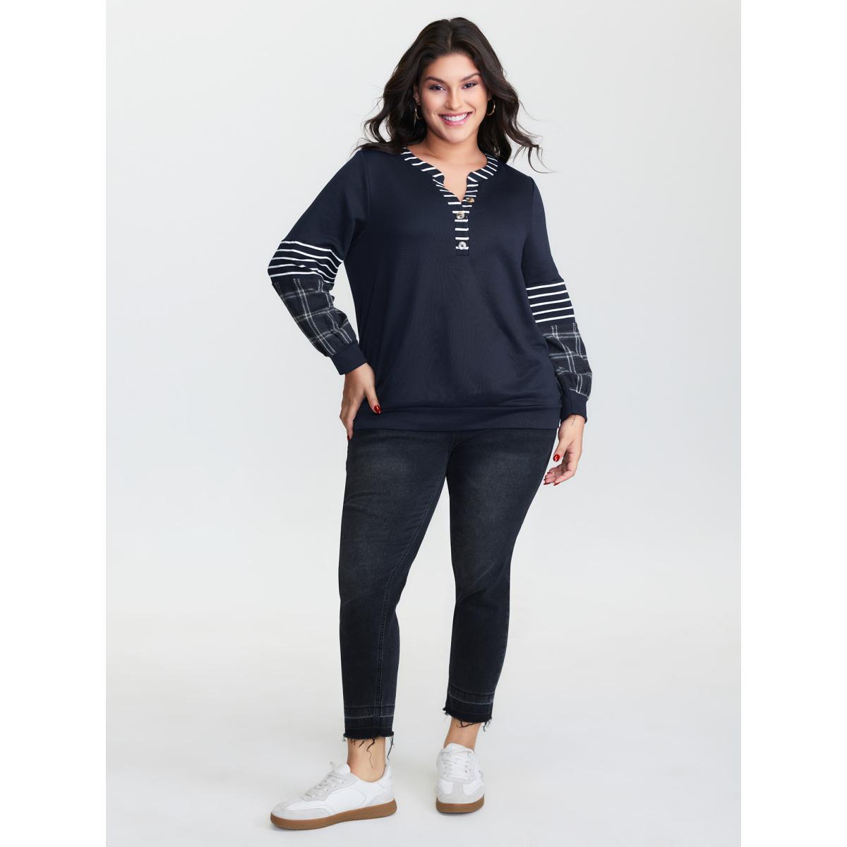 Plus Size Striped Plaid Split Neckline Sweatshirt Women Midnight Leisure Contrast Flat collar with V-notch Casual Sweatshirts BloomChic 26/4X