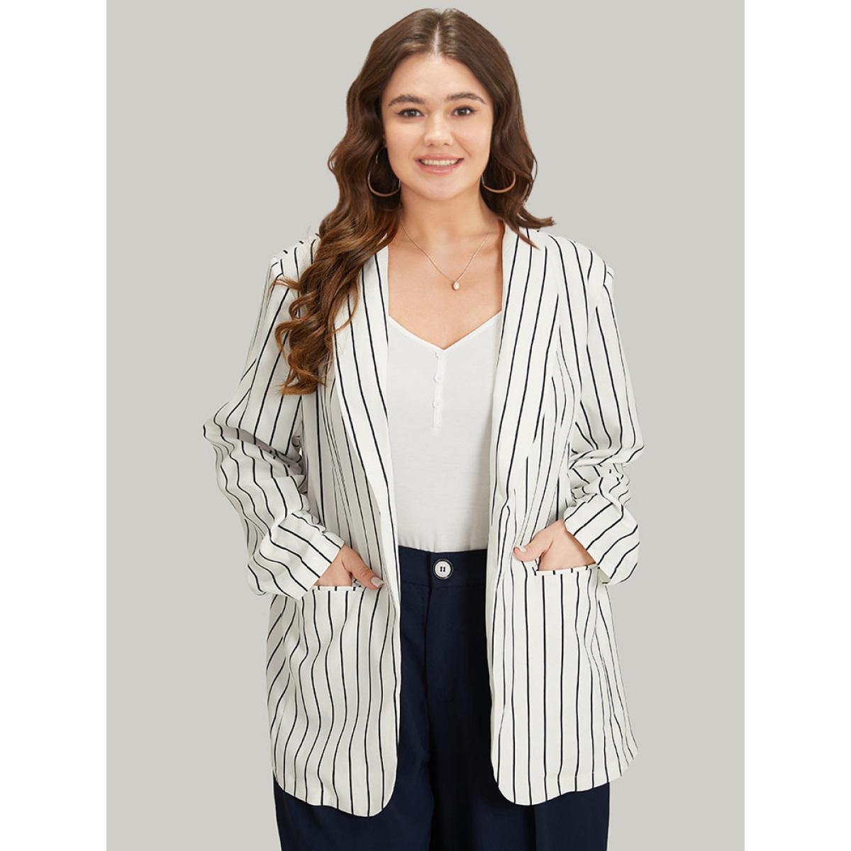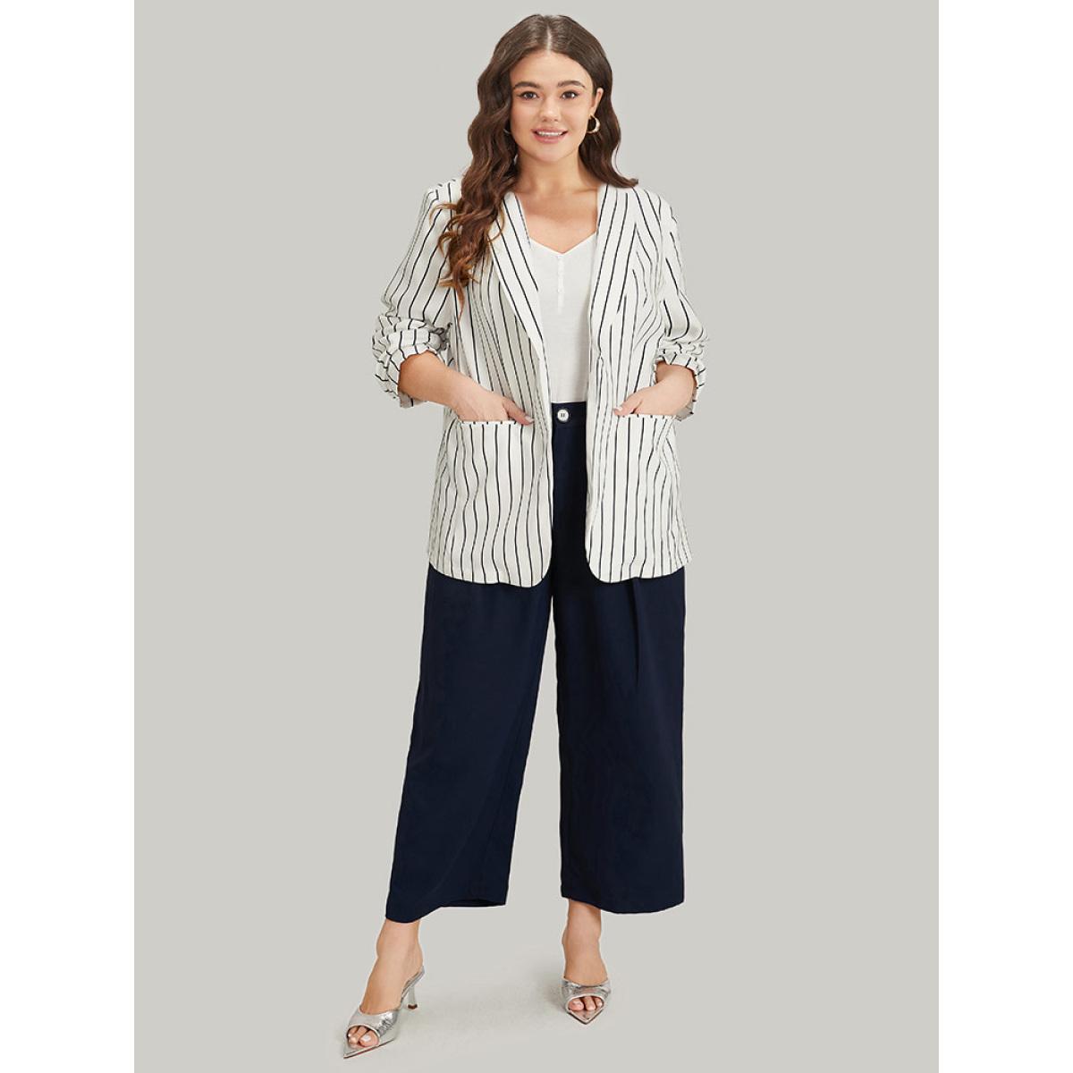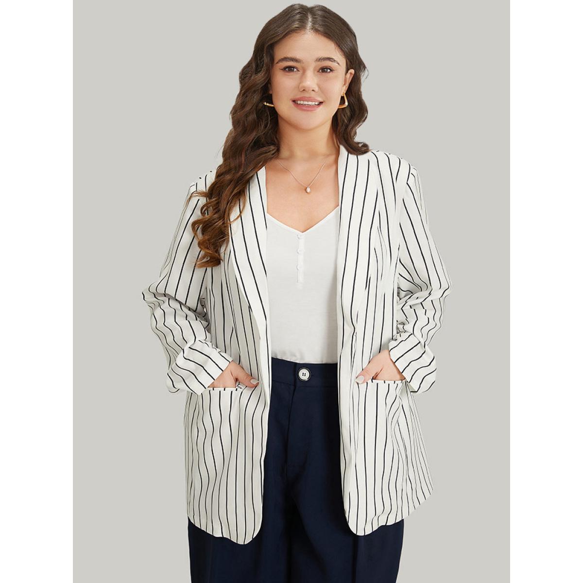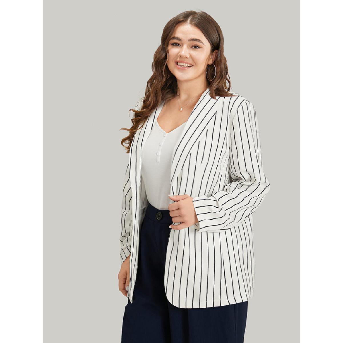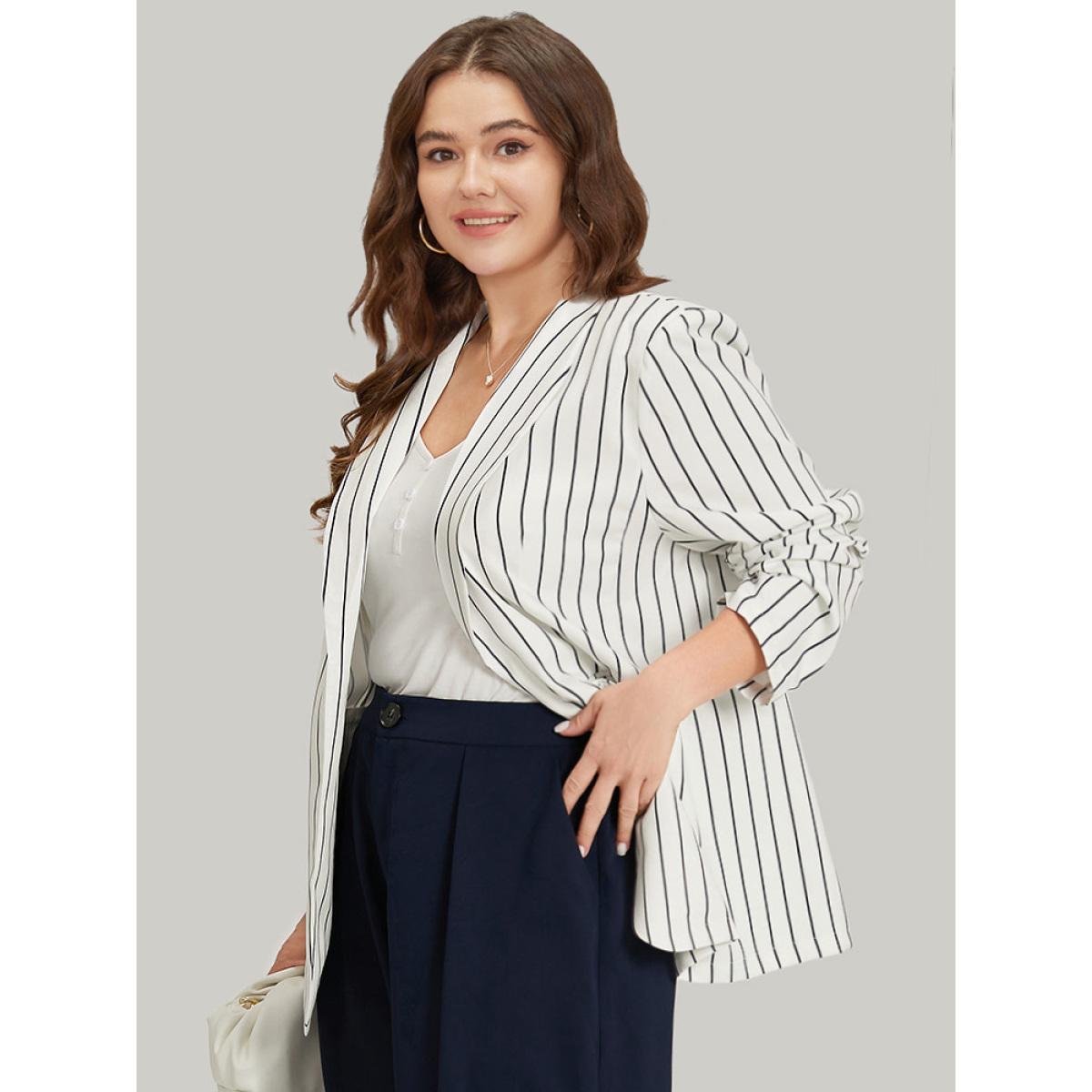 Plus Size Striped Pocket Gathered Lapel Collar Blazer White Women Work Striped Gathered Sleeve Long Sleeve Lapel Collar 18-20/2X Pocket Office Blazers BloomChic
