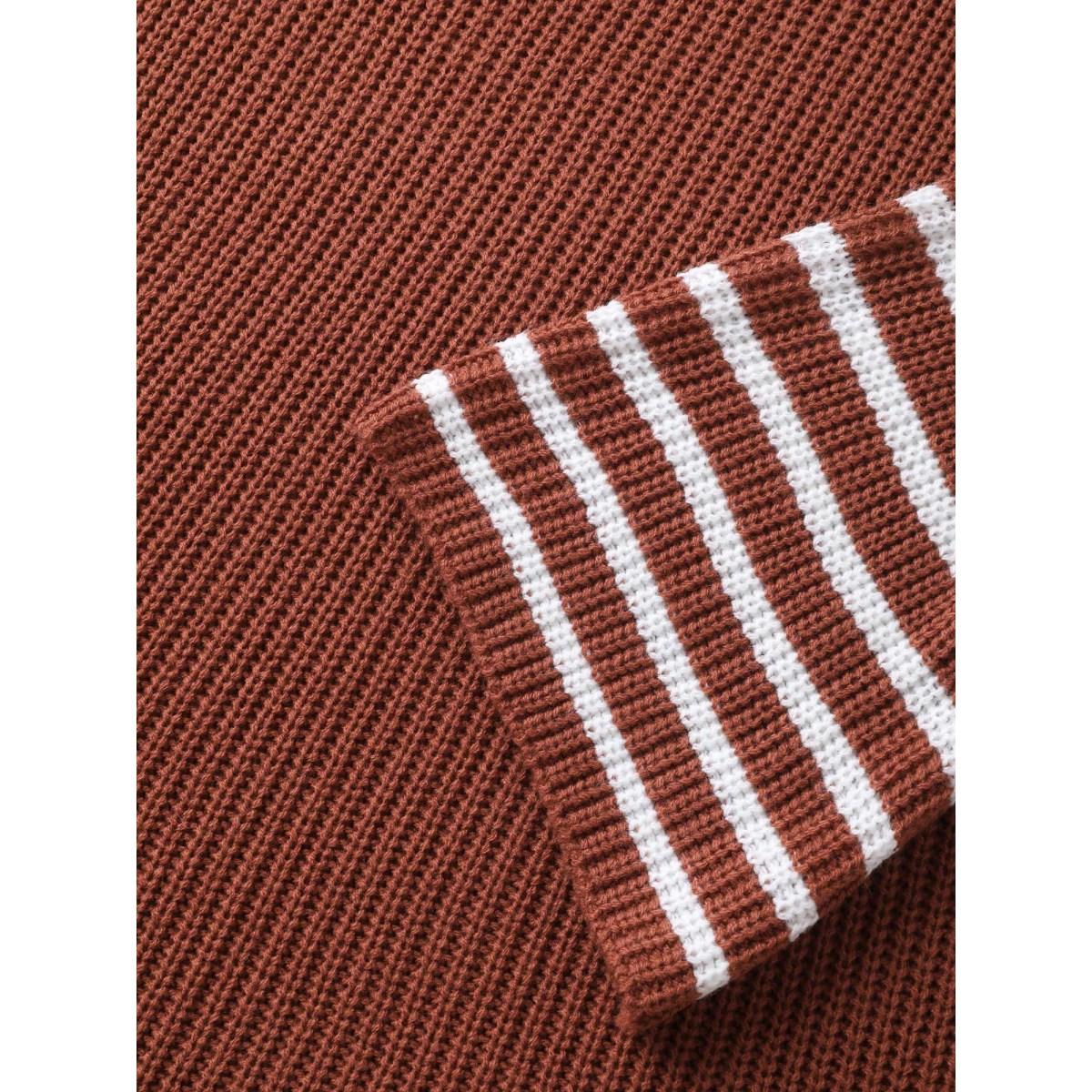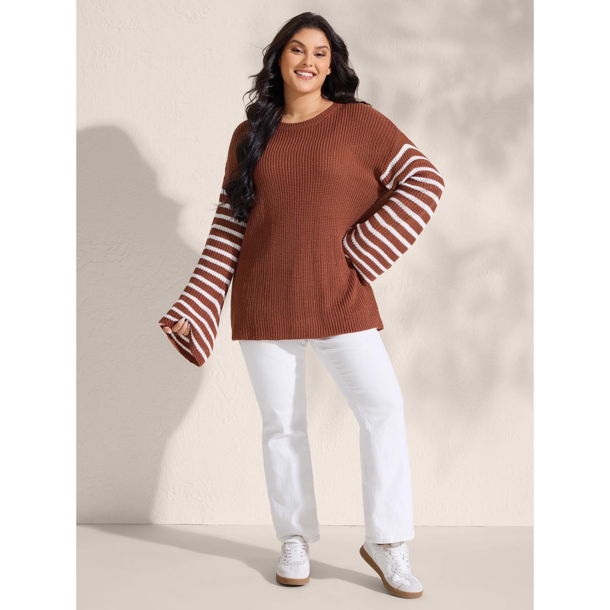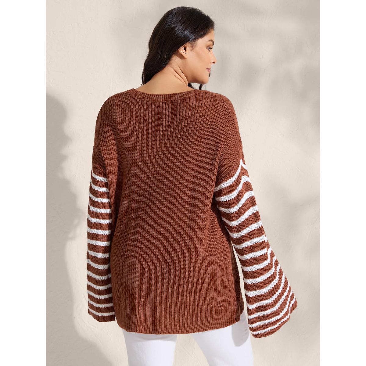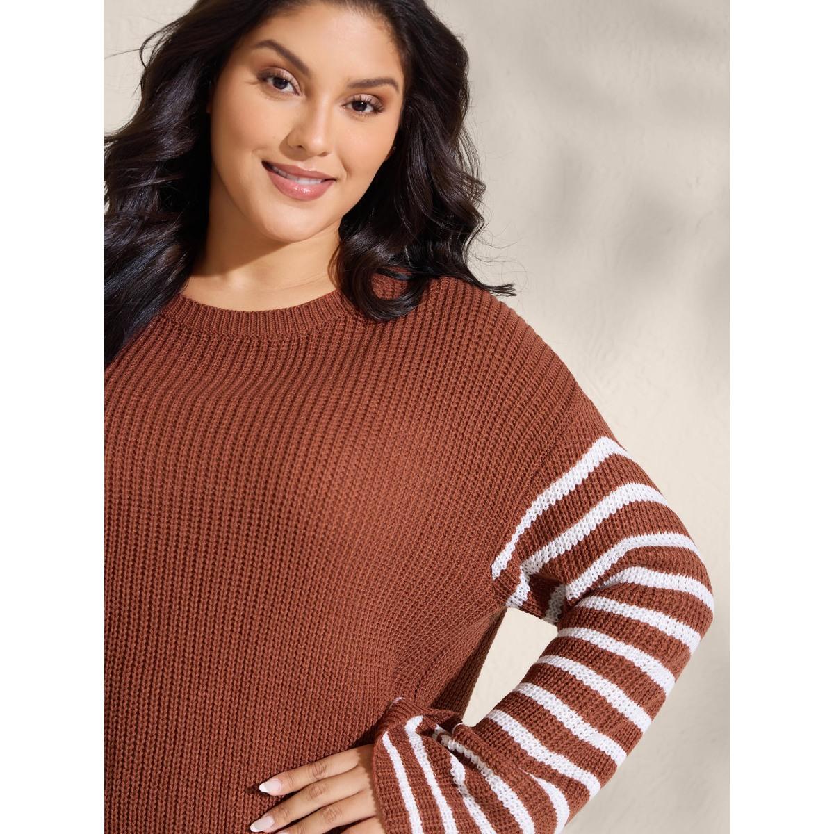 Plus Size Striped Print Textured Drop Shoulder Pullover Yellowishbrown Women Leisure Loose Long Sleeve Round Neck Casual Pullovers BloomChic 12/L