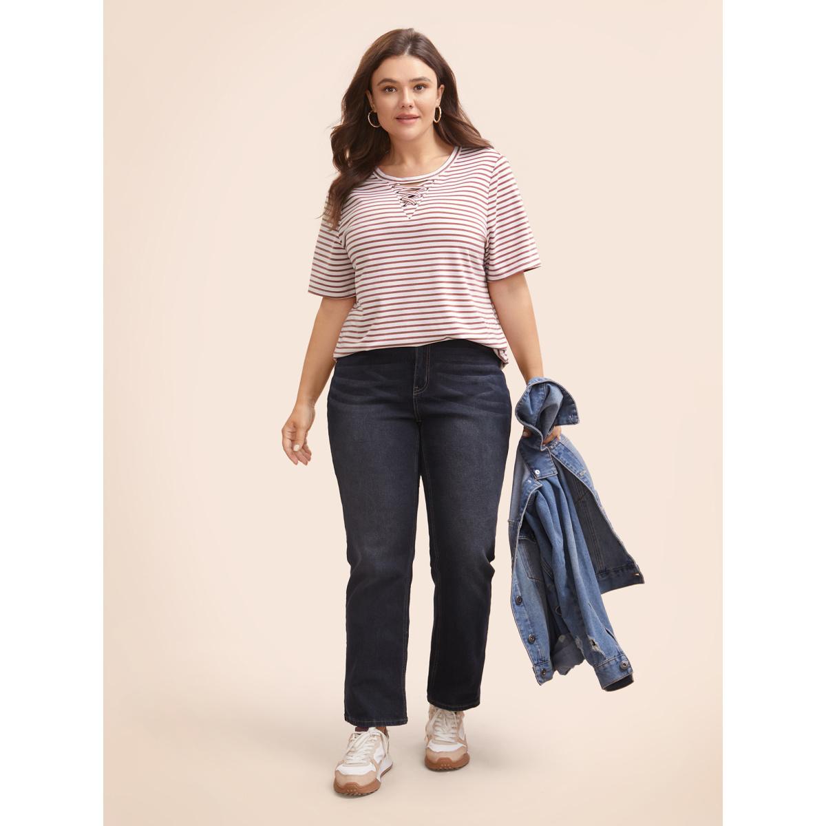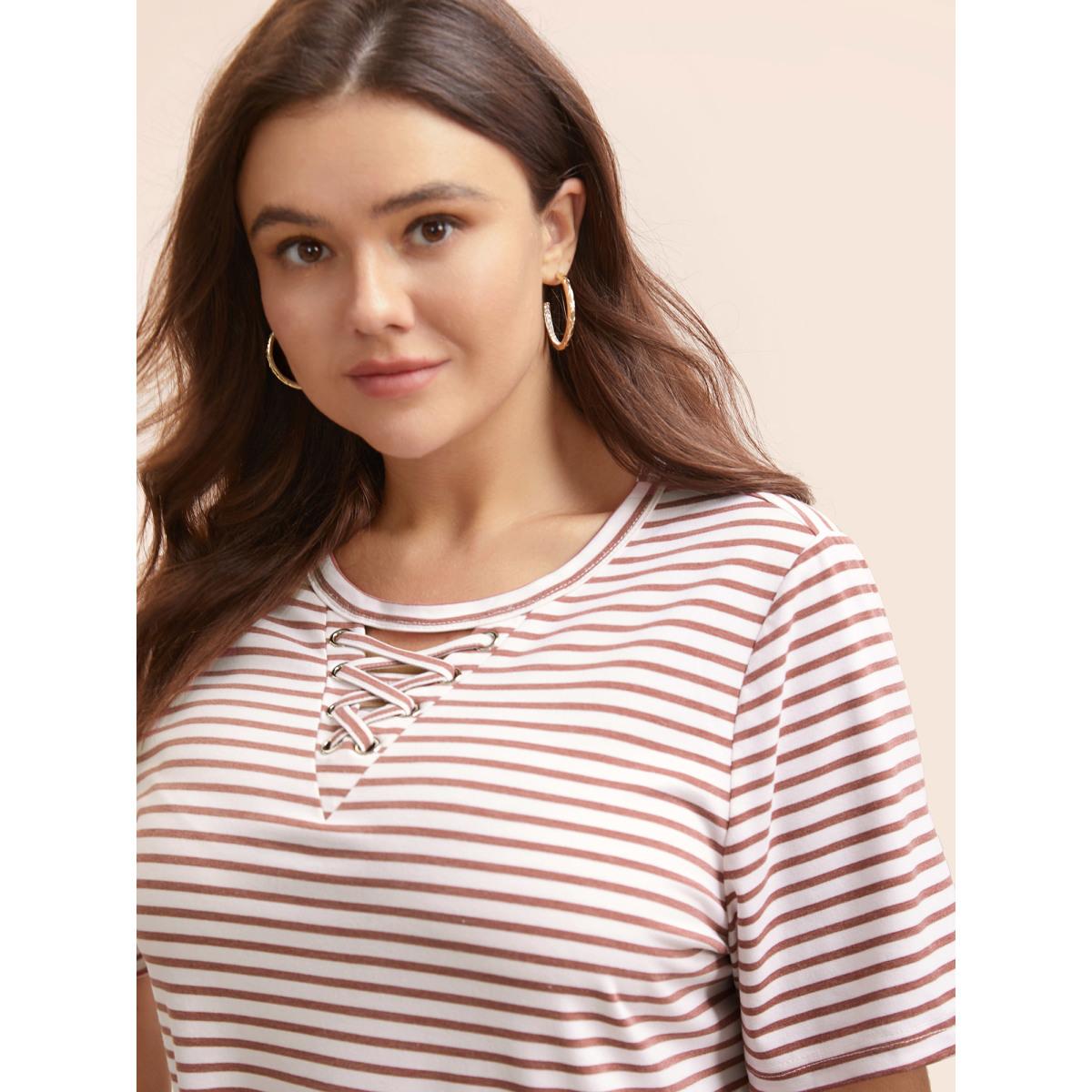 Plus Size Striped Round Neck Crisscross T-shirt DustyPink Women Casual Eyelet Round Neck Everyday T-shirts BloomChic 14-16/1X Product Image