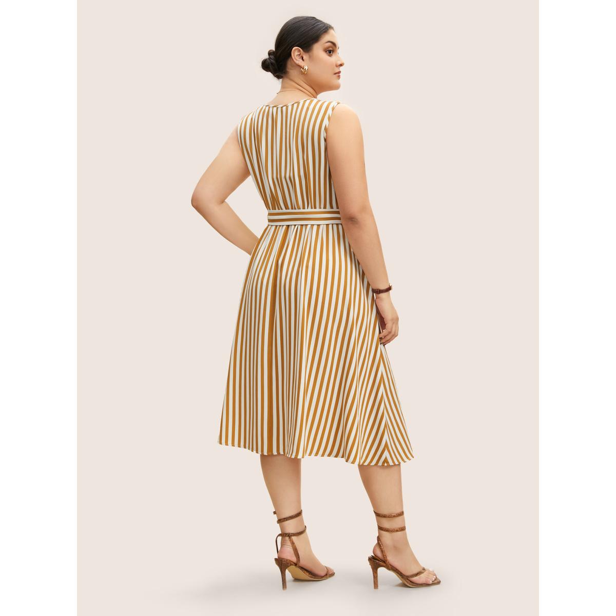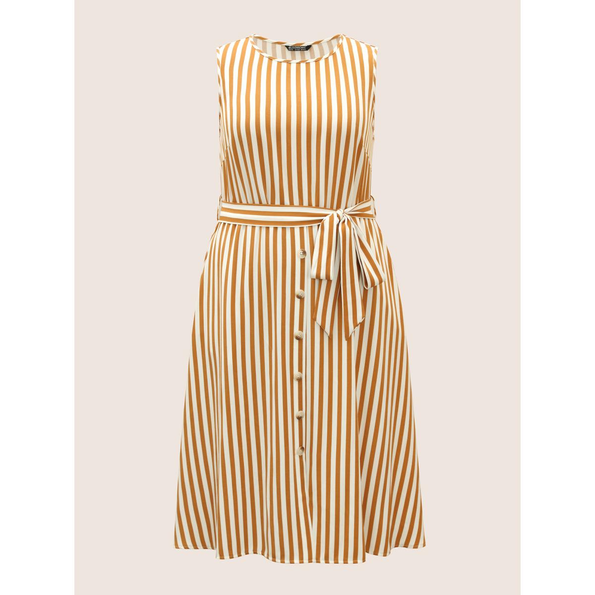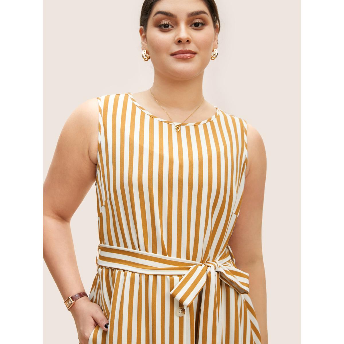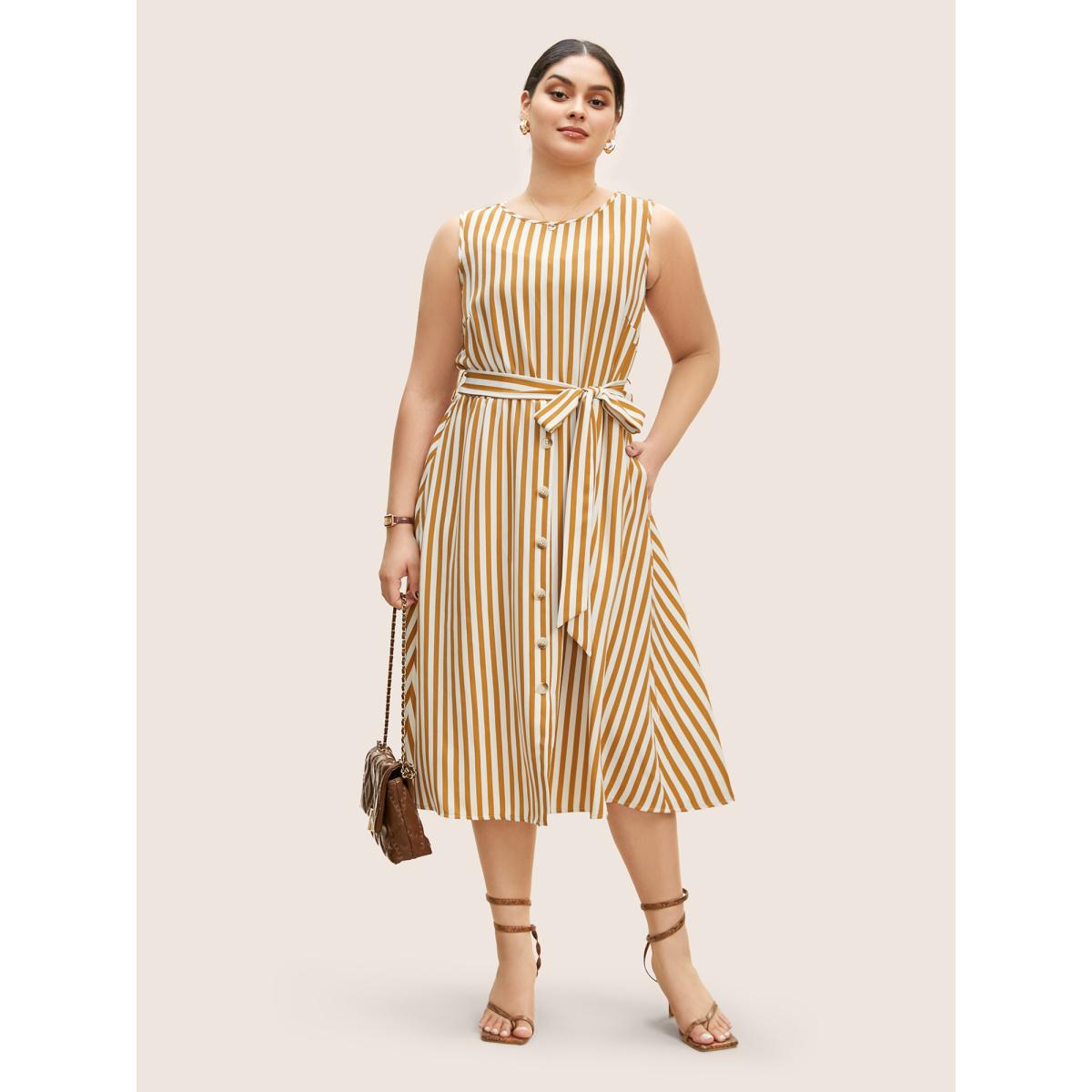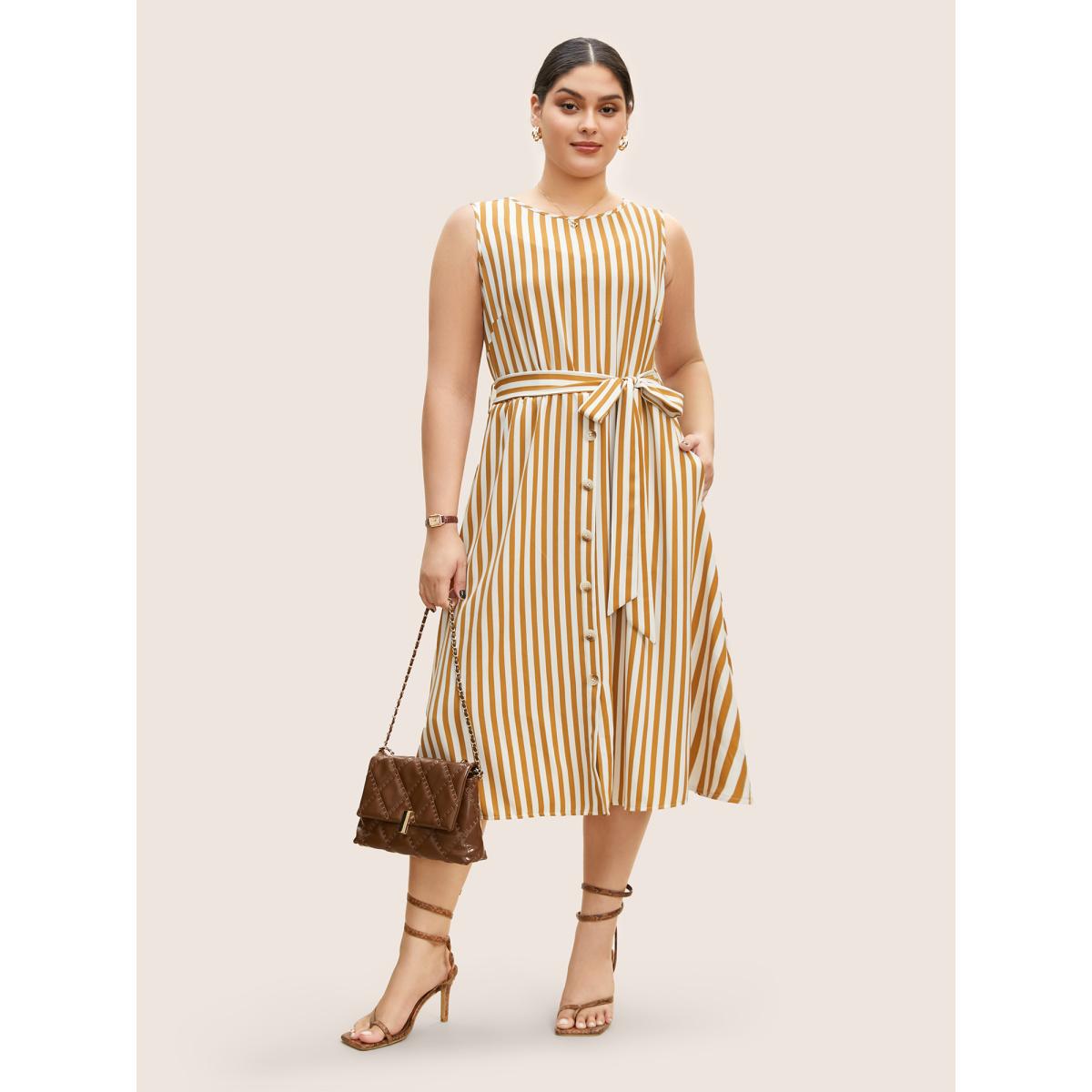 Plus Size Striped Sleeveless Button Detail Belted Midi Dress Wheat Women Work From Home Belted Round Neck Sleeveless Curvy BloomChic 30/6X