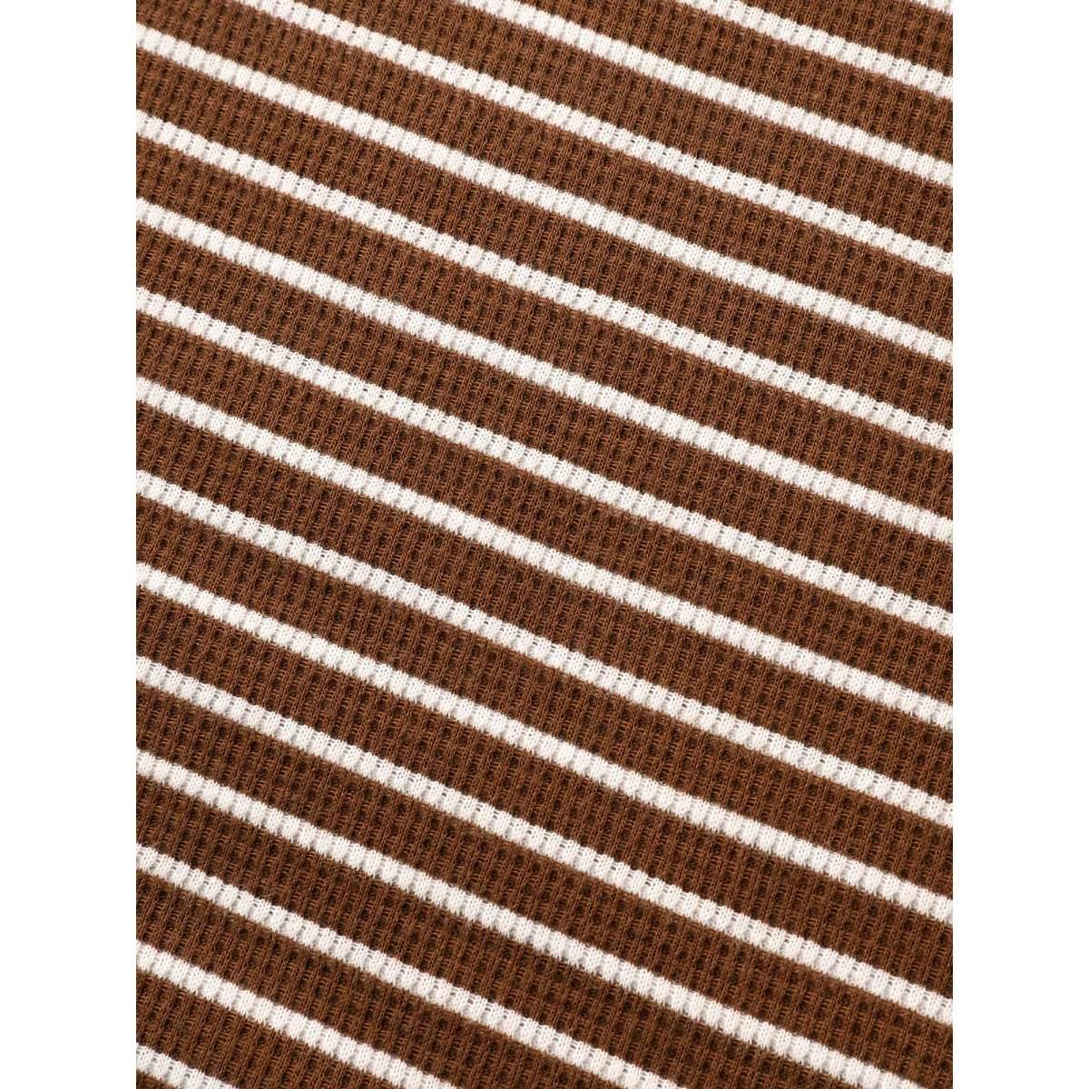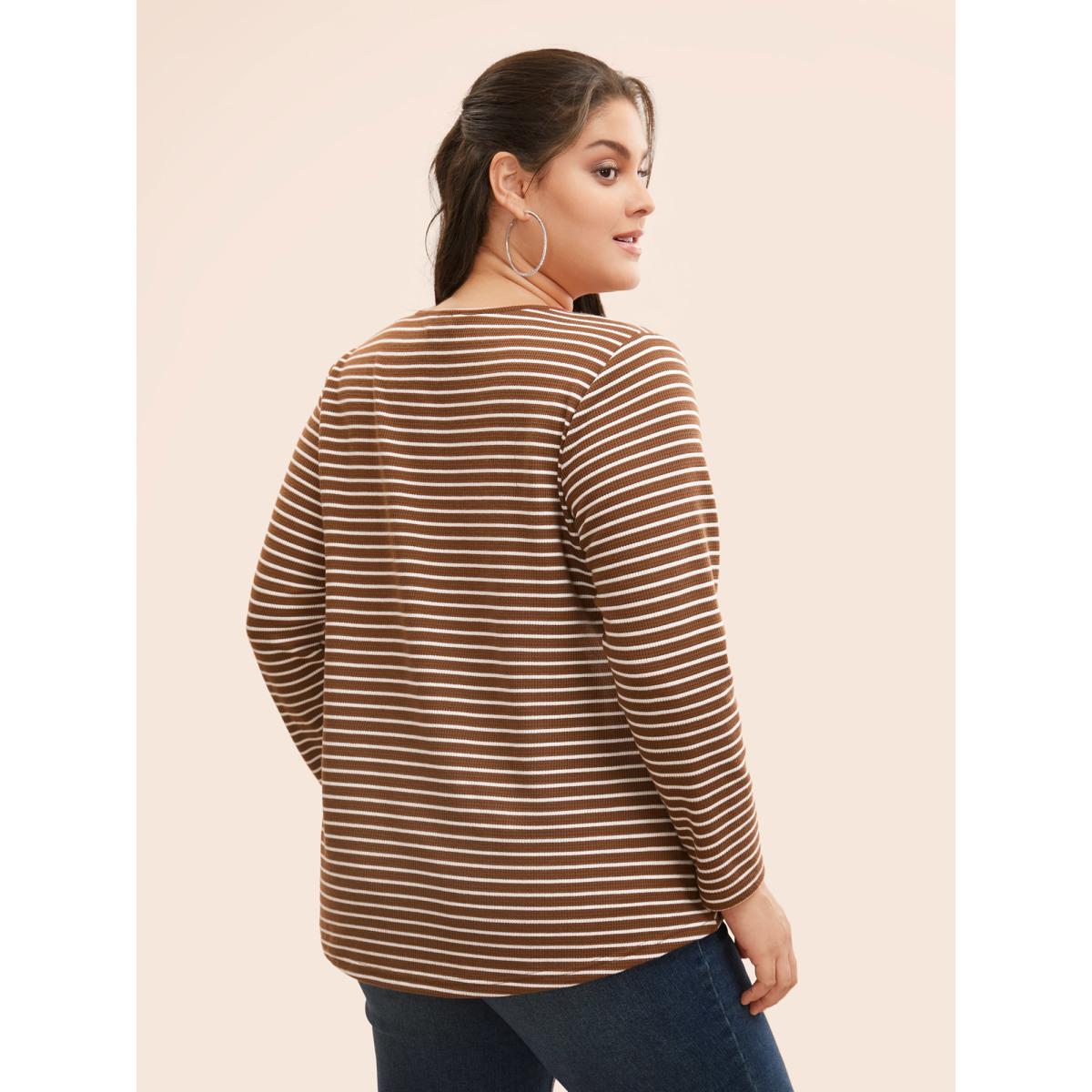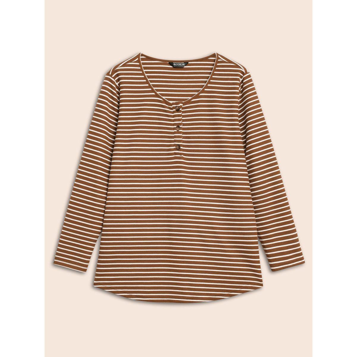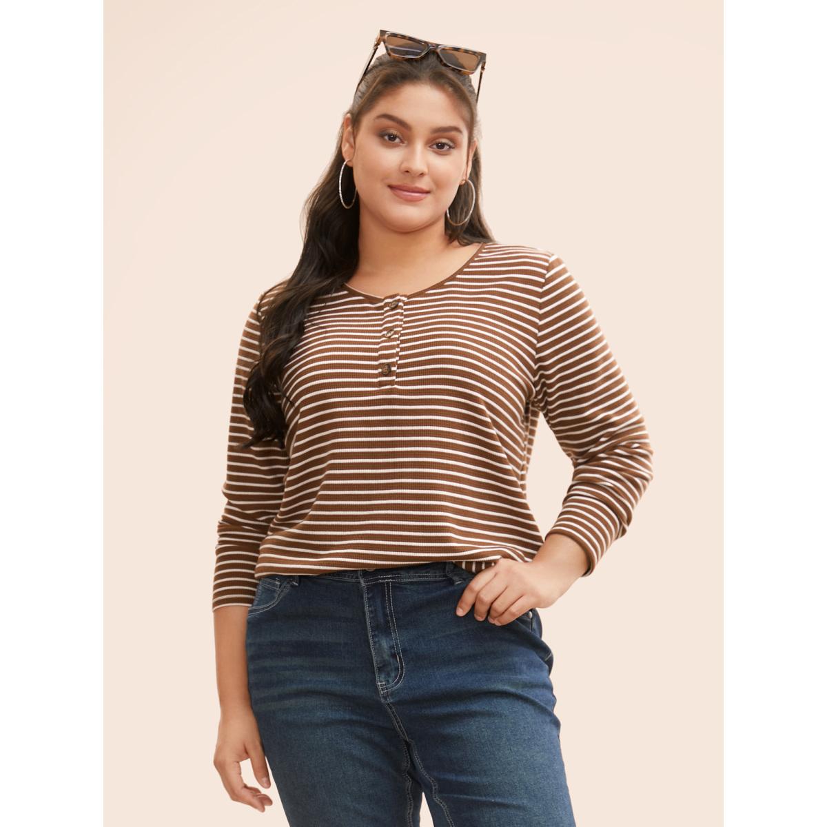 Plus Size Striped Textured Button Up T-shirt Browncoffeecolor Women Casual Button Round Neck Everyday T-shirts BloomChic 18-20/2X