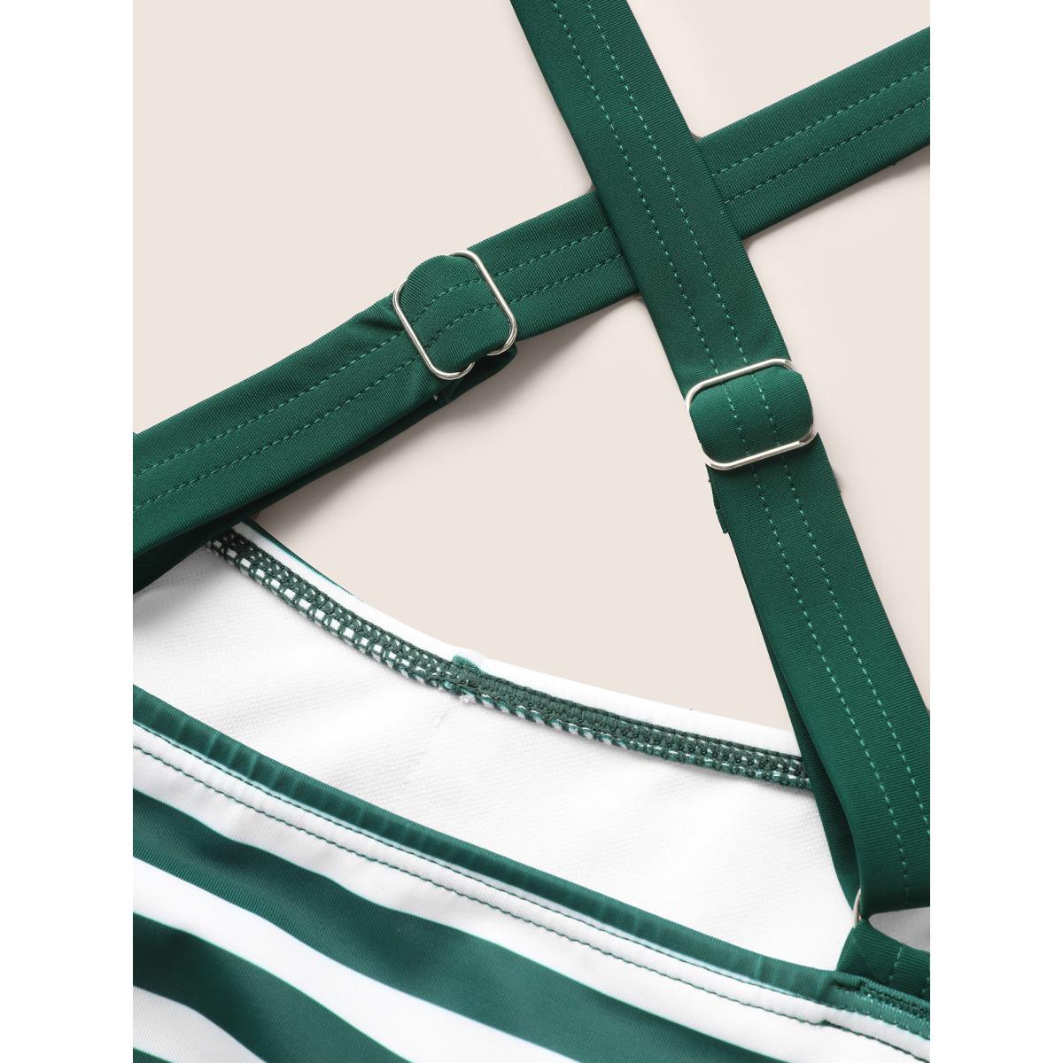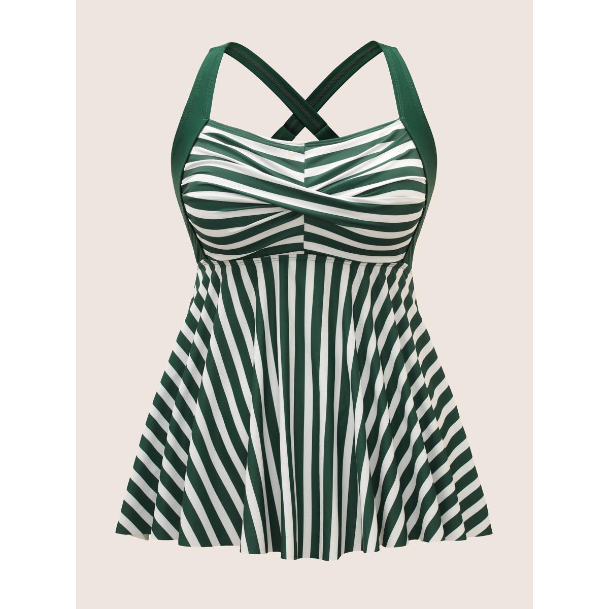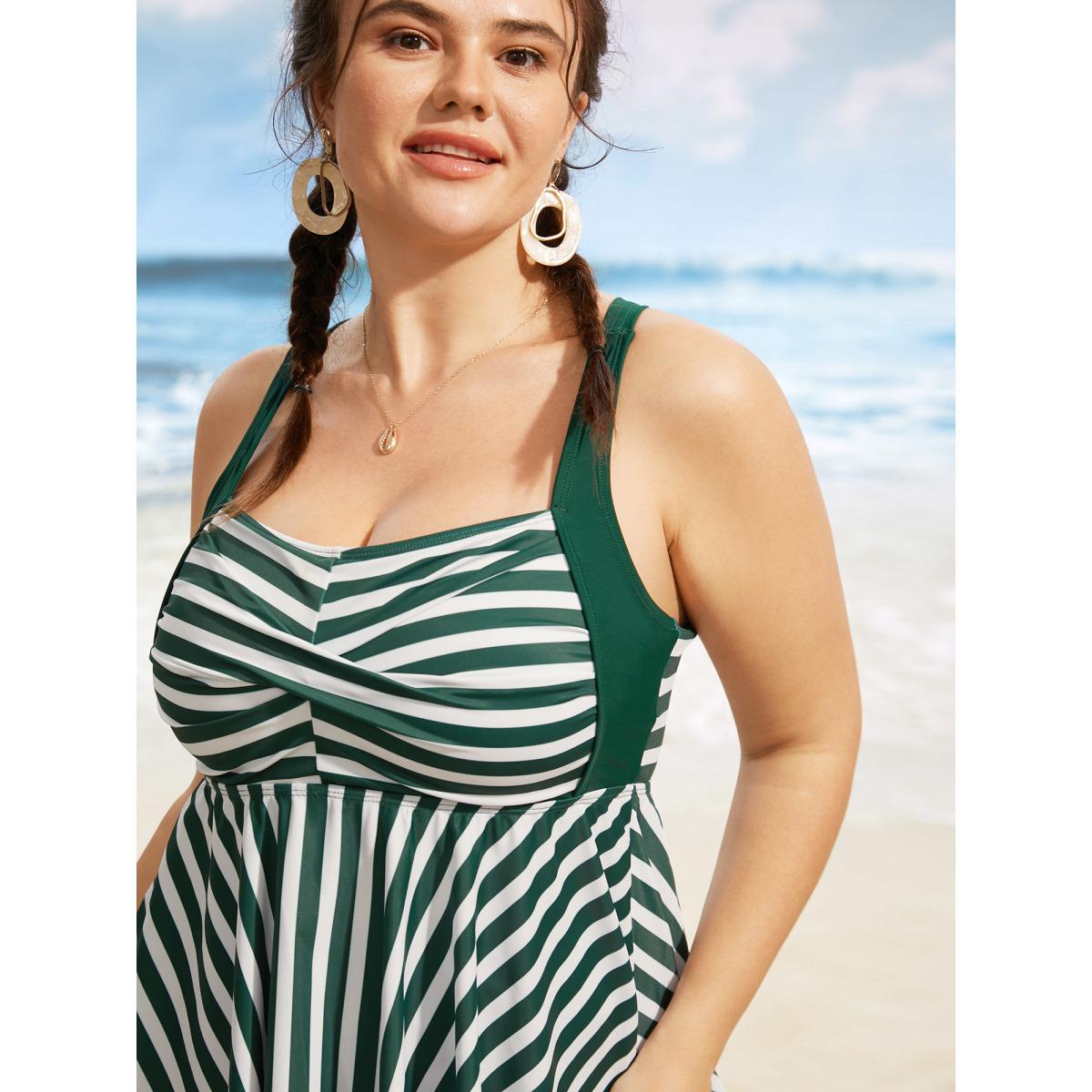 Plus Size Striped Twist Front Patchwork Gathered Swim Top Women's Swimwear DarkGreen Beach Twist High stretch Bodycon Heart neckline Curve Swim Tops BloomChic 12/L