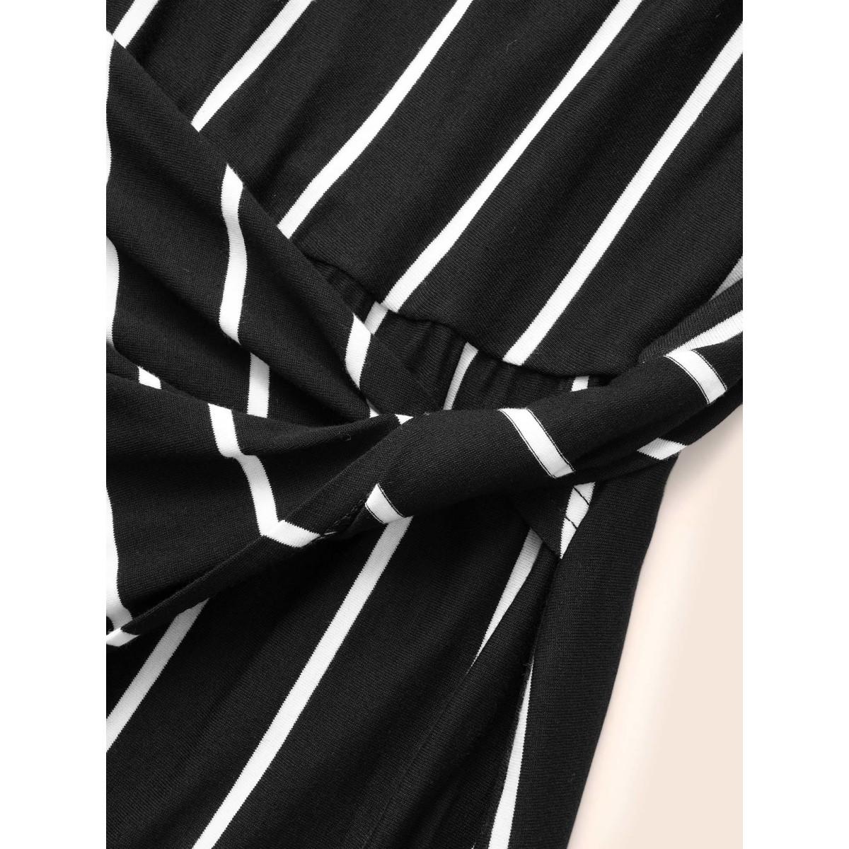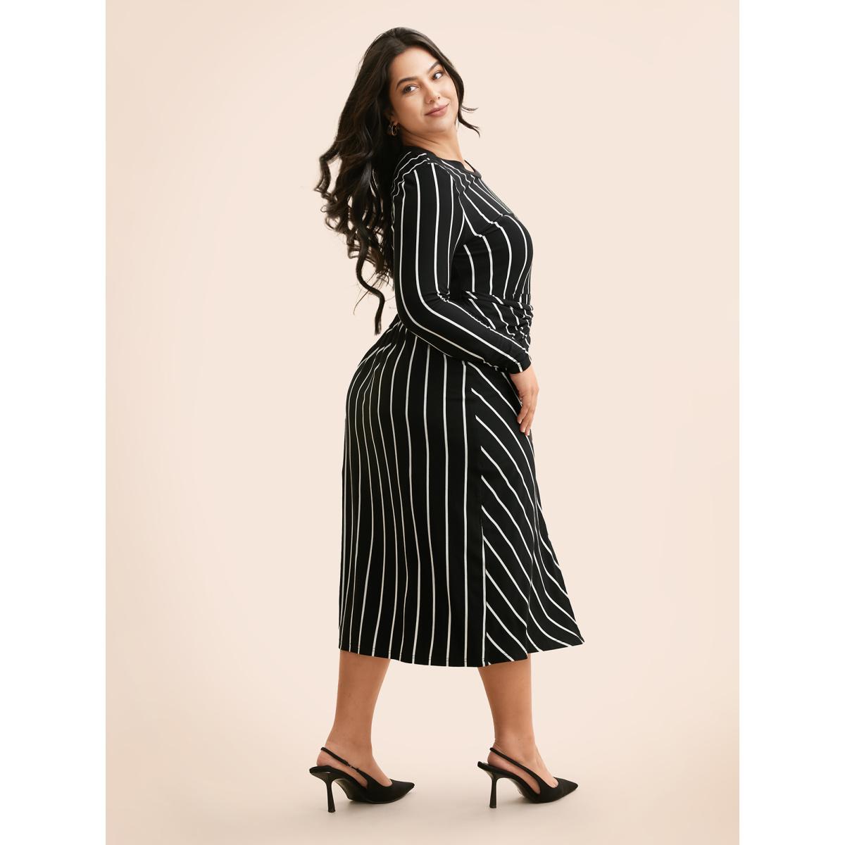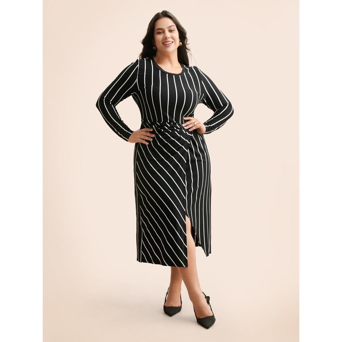 Plus Size Striped Twist Front Split Hem Dress Black Women Elegant Twist Round Neck Long Sleeve Curvy BloomChic 26/4X