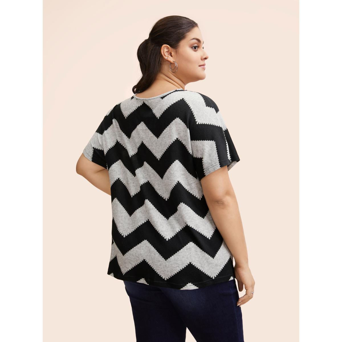 Plus Size Striped Zipper Batwing Sleeve T-shirt Black Women Casual Zipper Striped V-neck Dailywear T-shirts BloomChic 30/6X