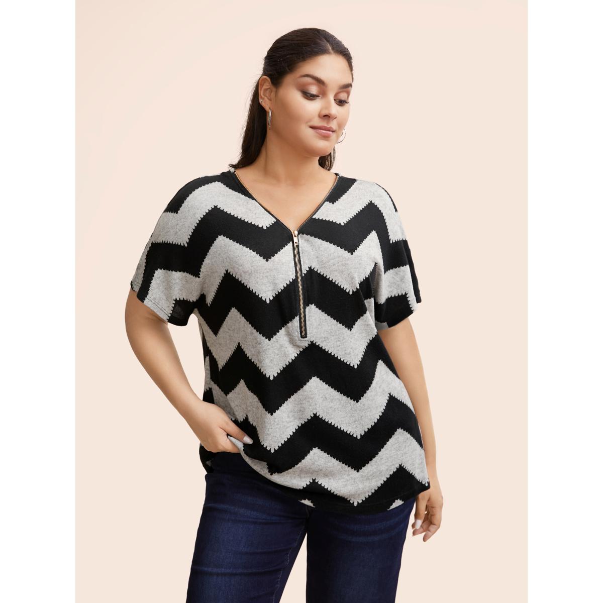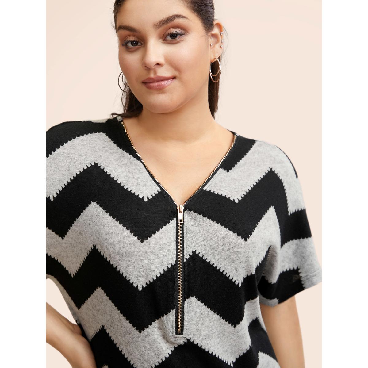Plus Size Striped Zipper Batwing Sleeve T-shirt Black Women Casual Zipper Striped V-neck Dailywear T-shirts BloomChic 30/6X Product Image