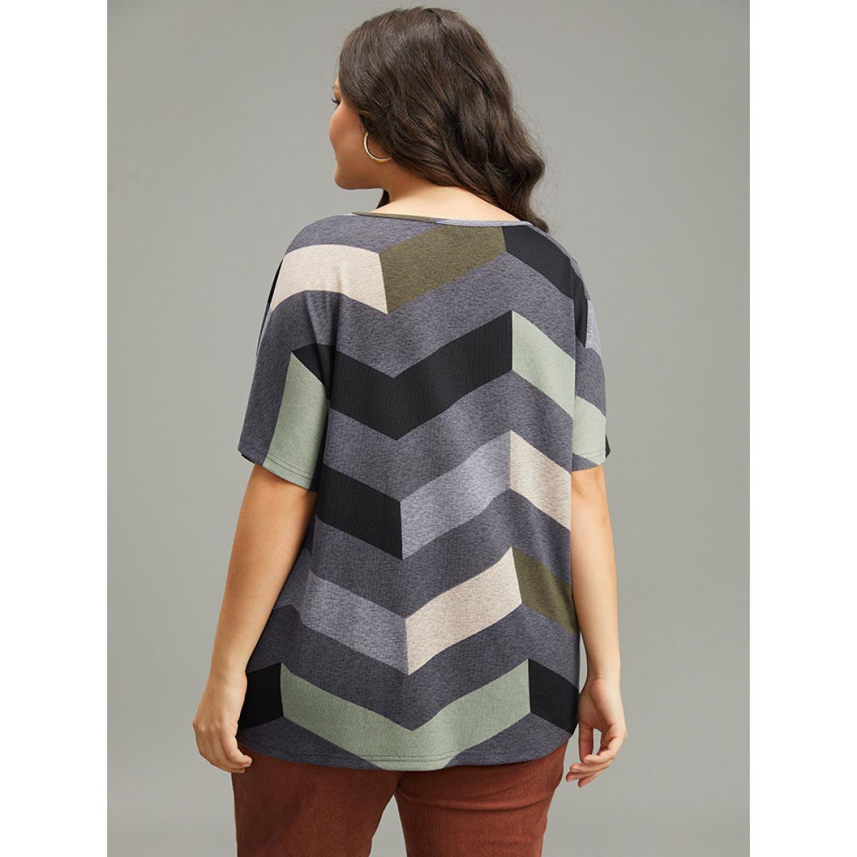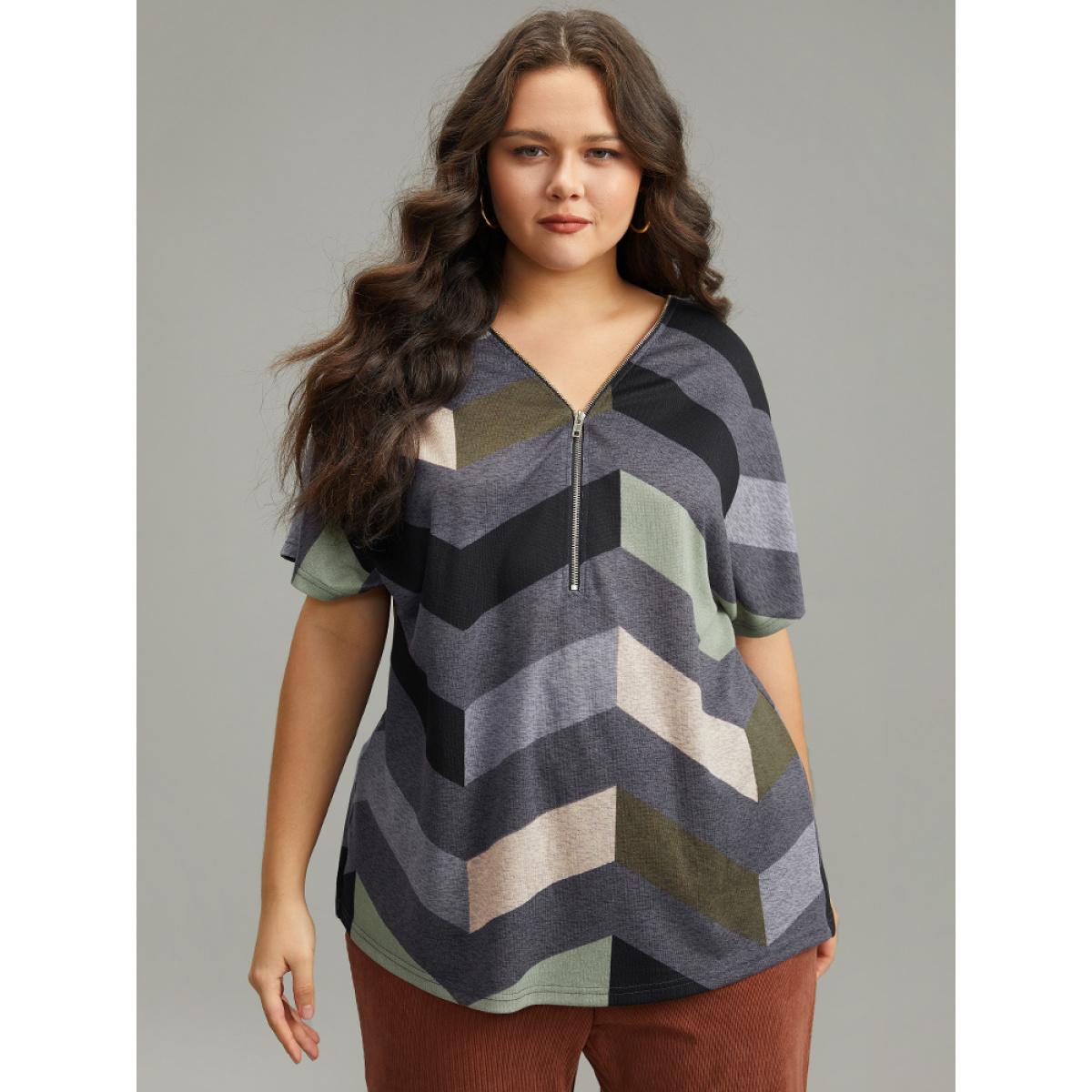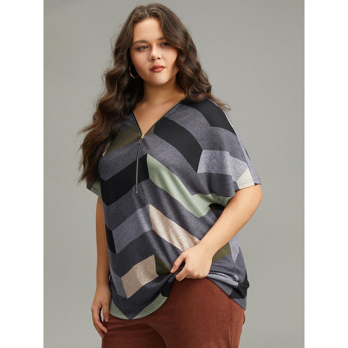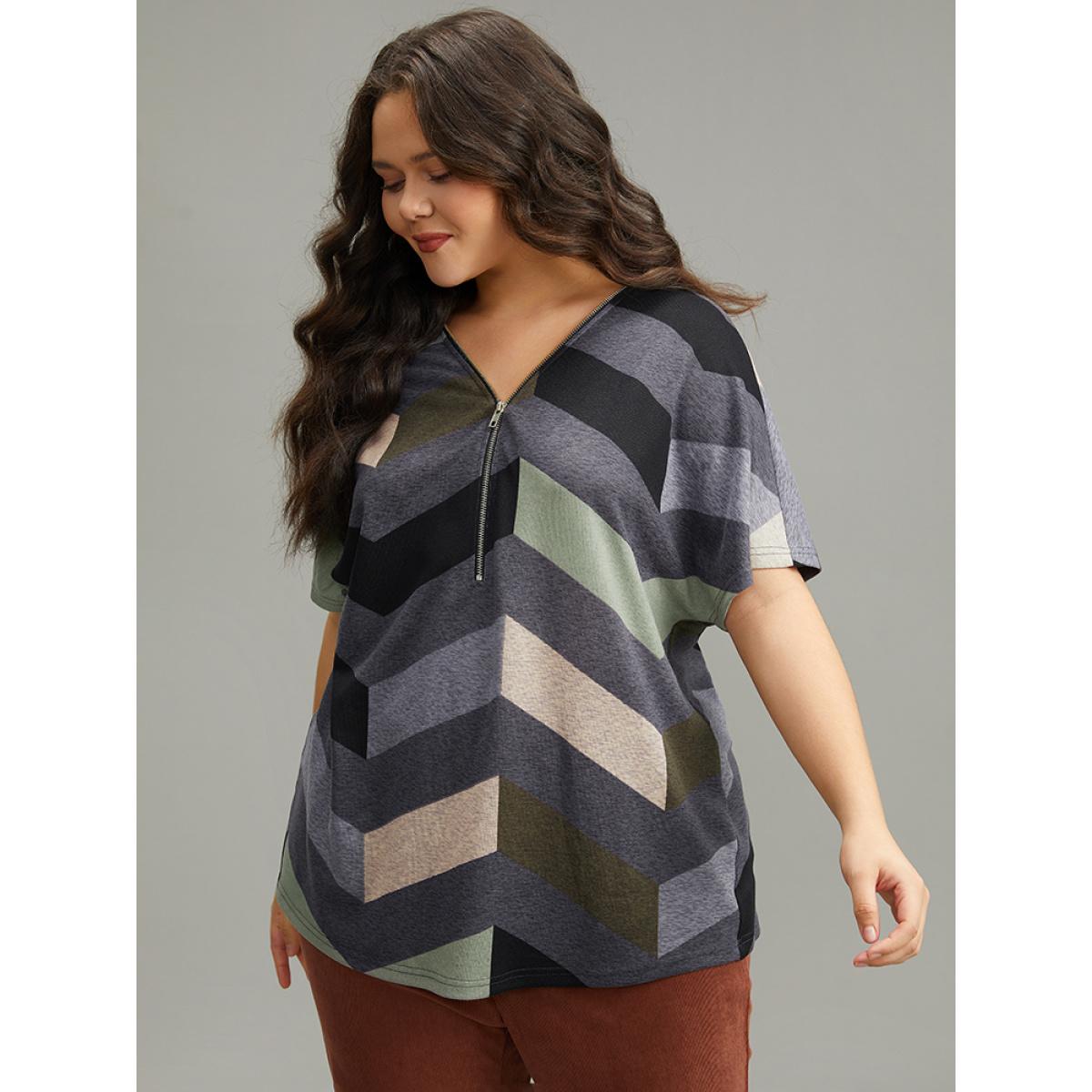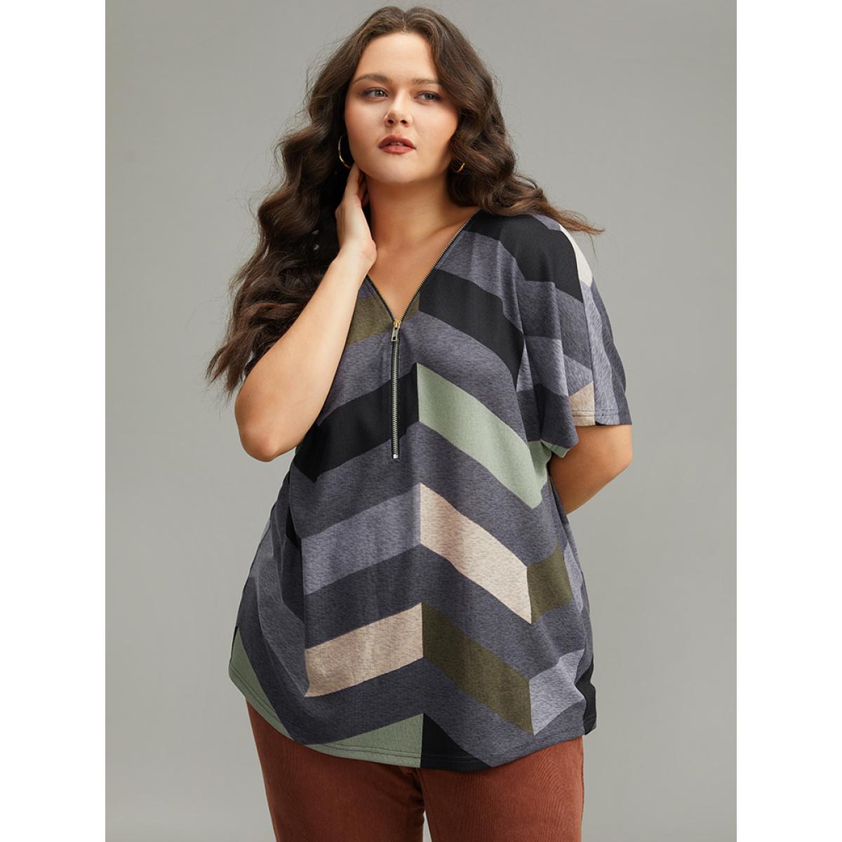 Plus Size Striped Zipper Batwing Sleeve T-shirt Gray Women Casual Zipper Striped V-neck Dailywear T-shirts BloomChic 12/L Product Image