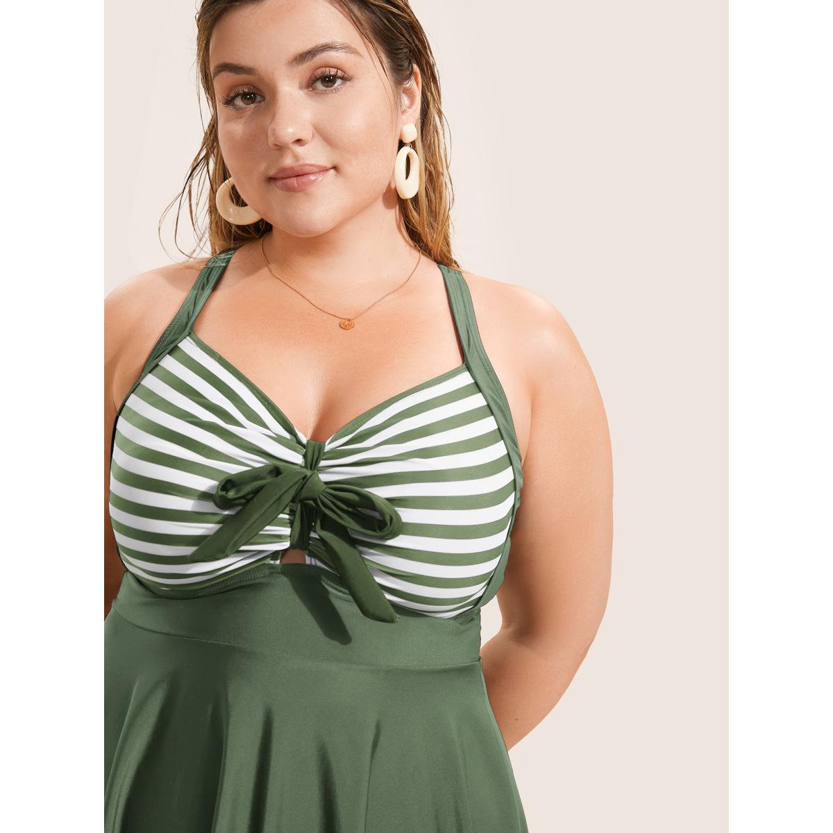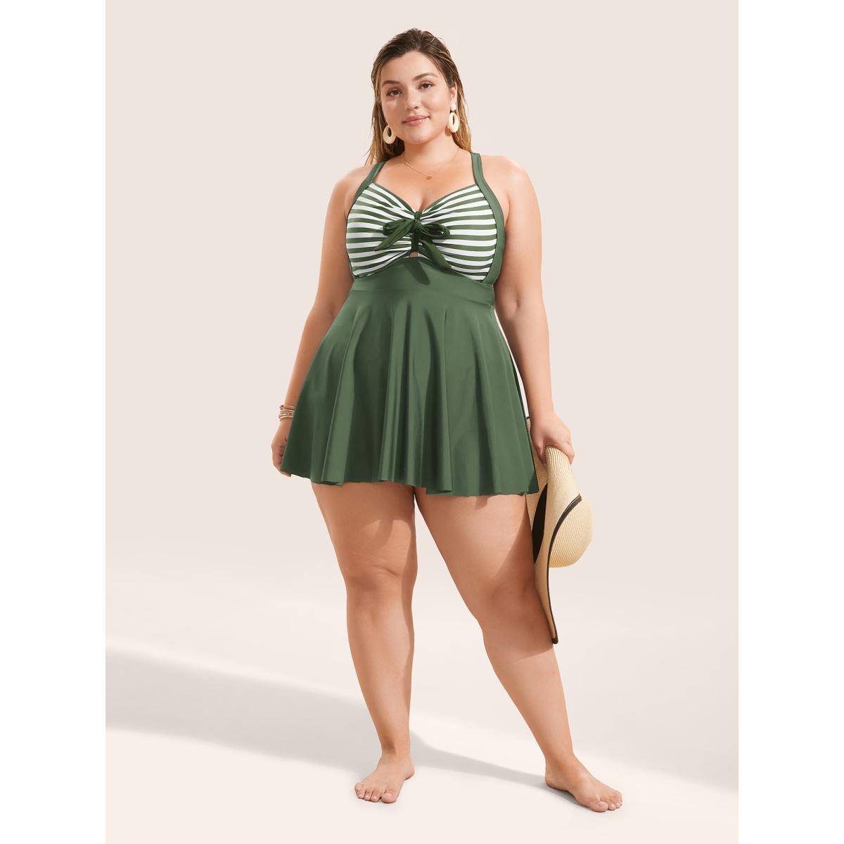 Plus Size Stripes Patchwork Tie Knot Cross Straps Swim Dress Women's Swimwear Sage Resort Bodycon Heart neckline High stretch Curve Swim Dresses BloomChic 14-16/1X