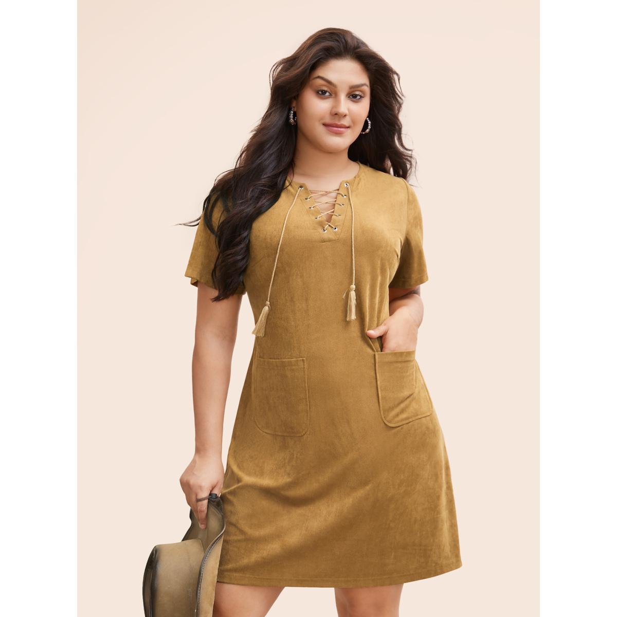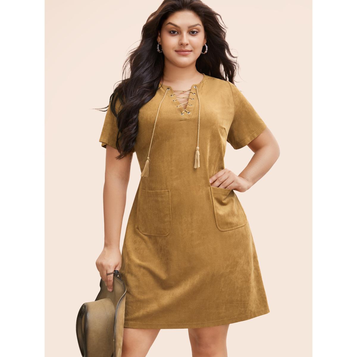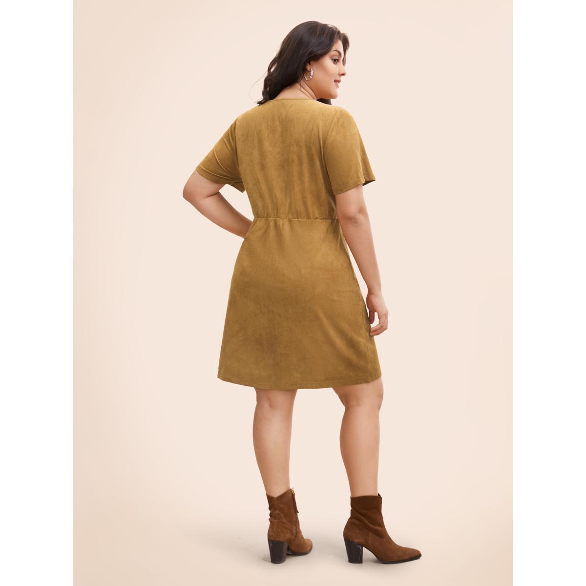 Plus Size Suede Stretchy Back-Waist Midi Dress Wheat Women Resort Eyelet Round Neck Short sleeve Curvy BloomChic 14-16/1X