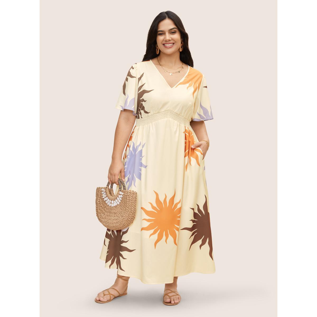 Plus Size Sun Print Shirred Ruffle Sleeve Dress WhiteSmoke Women Resort Shirred V-neck Short sleeve Curvy BloomChic 22-24/3X