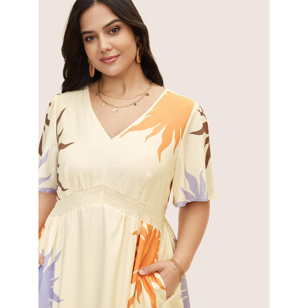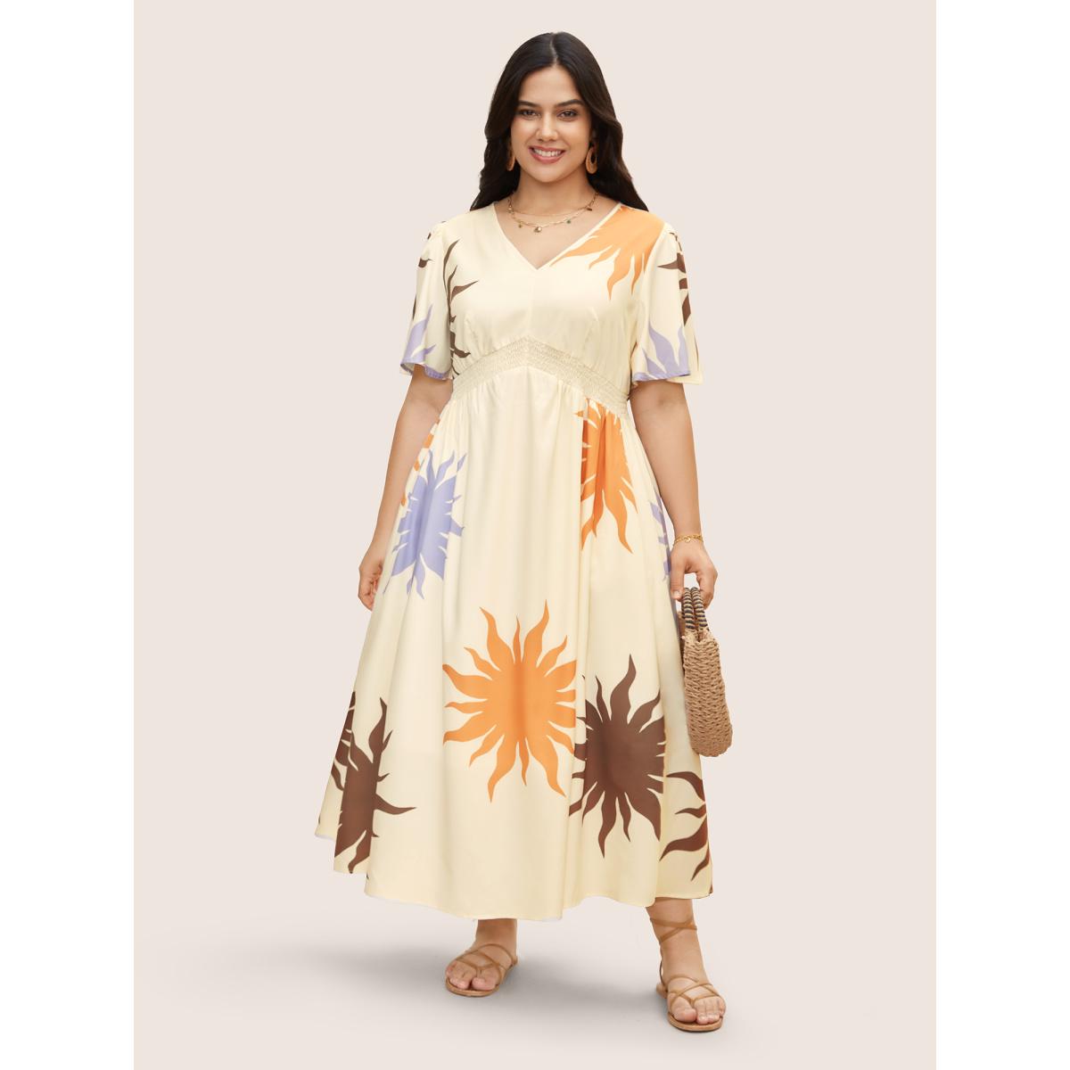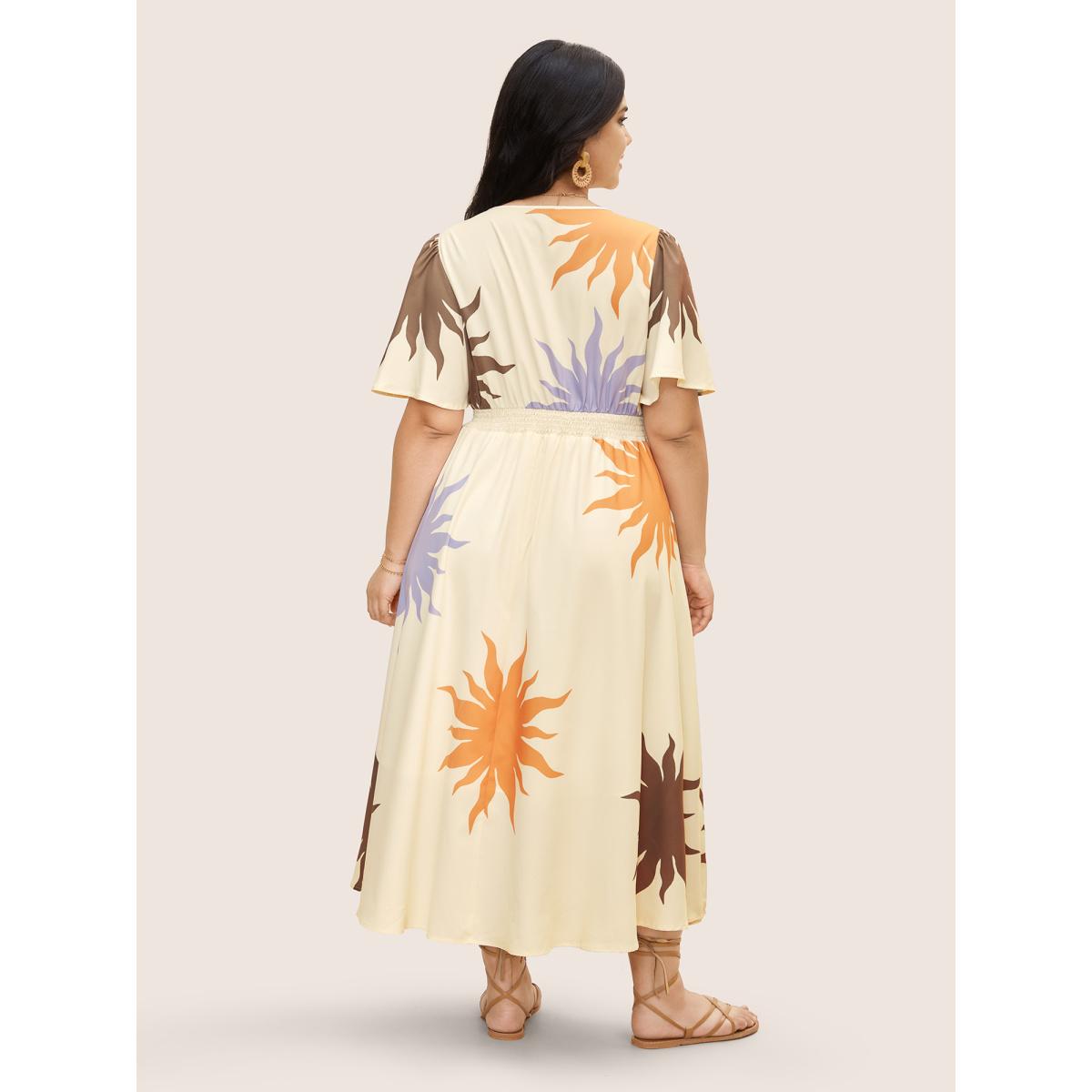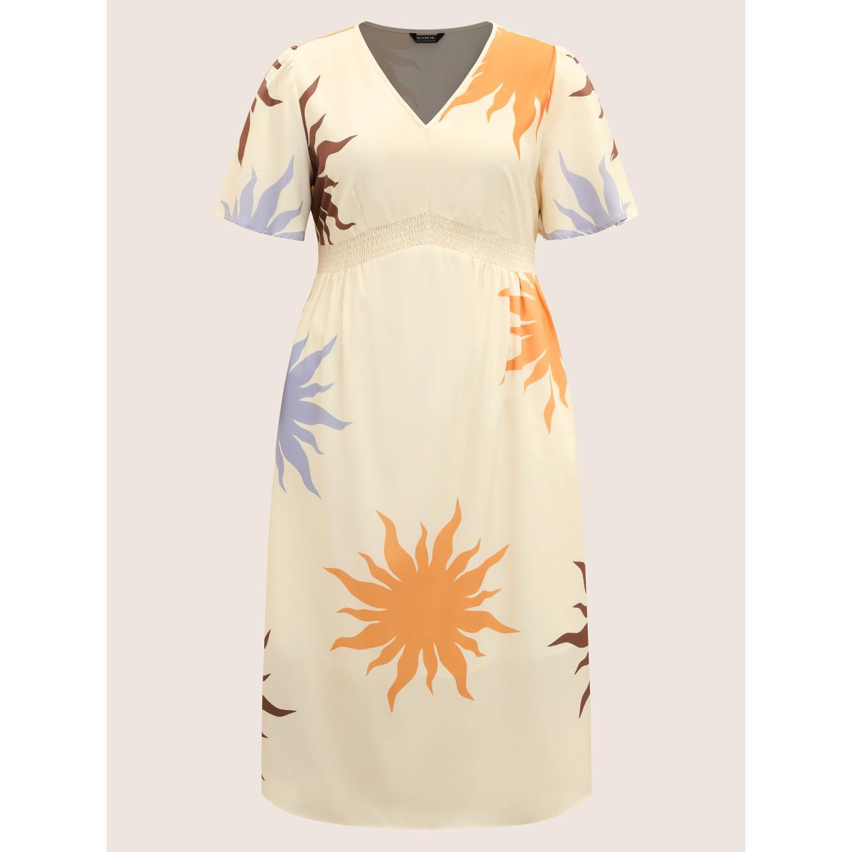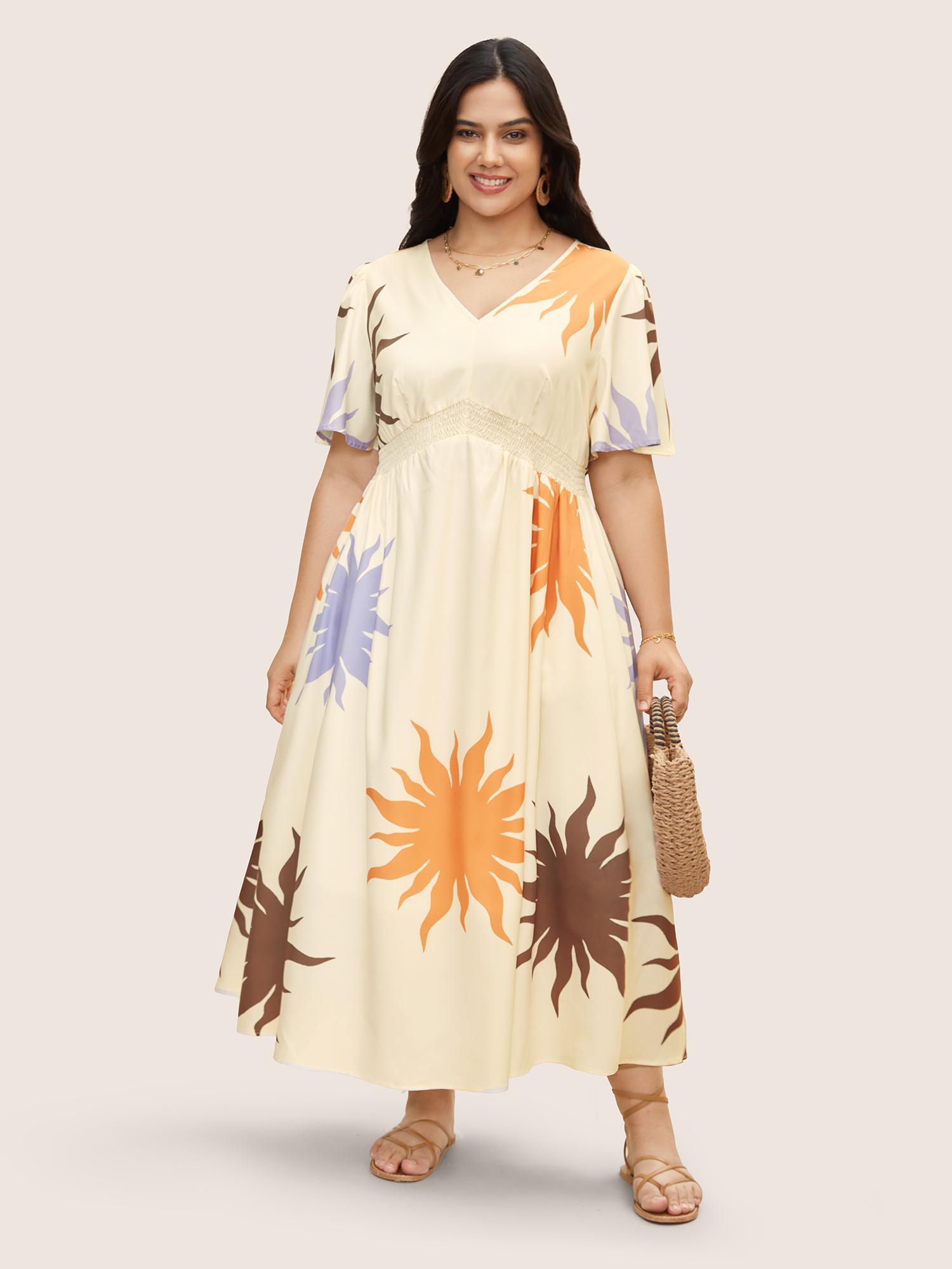 Plus Size Sun Print Shirred Ruffle Sleeve Dress WhiteSmoke Women Resort Shirred V-neck Short sleeve Curvy BloomChic 22-24/3X Product Image