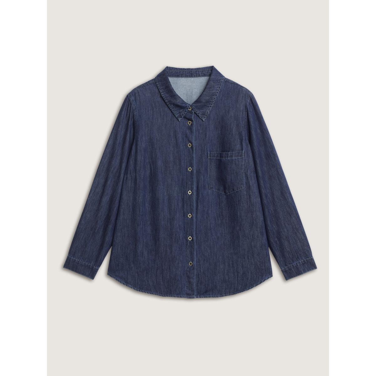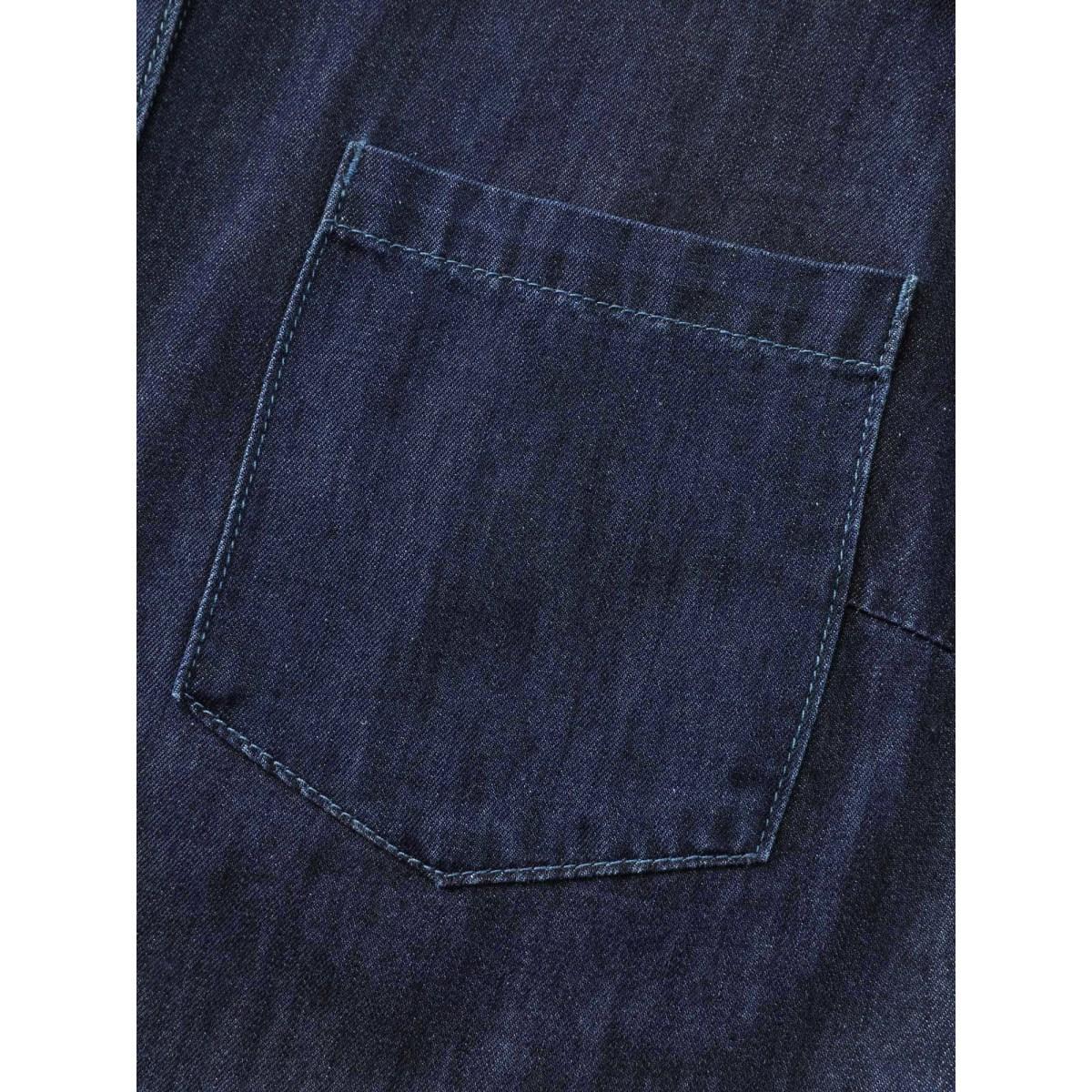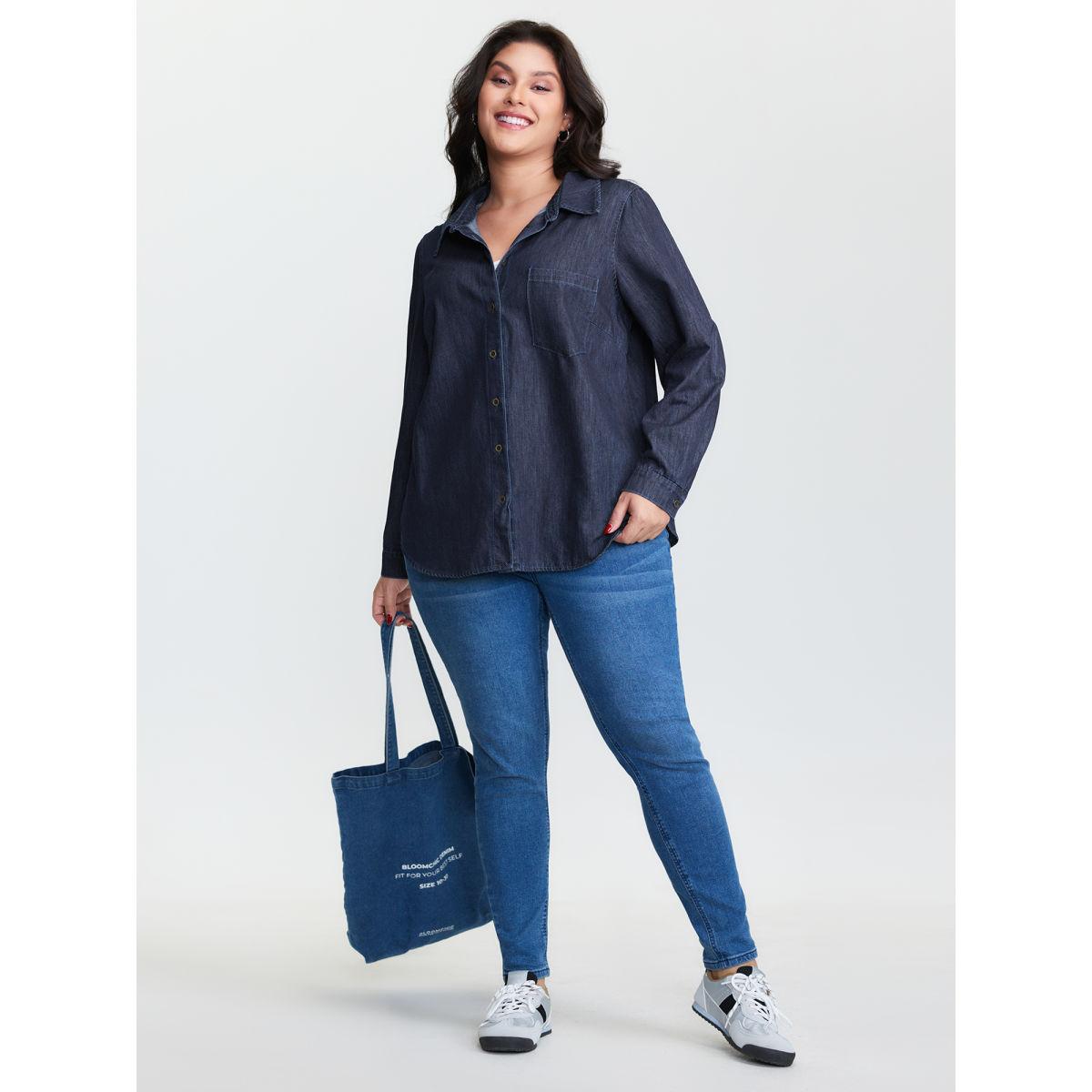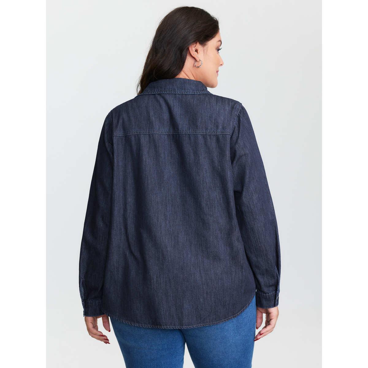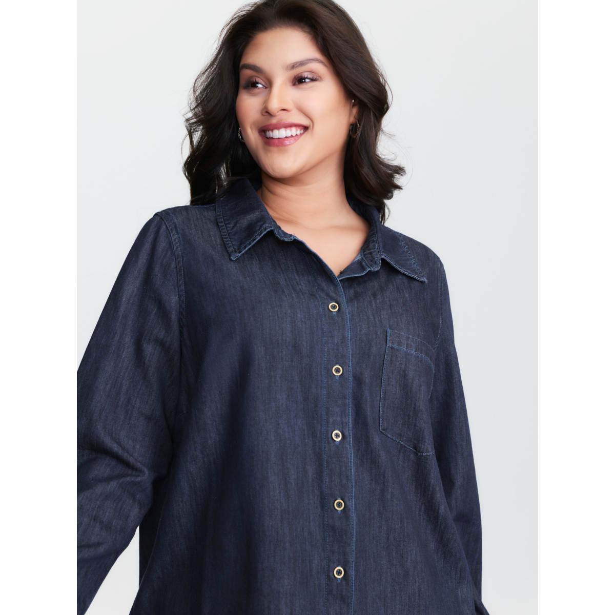 Plus Size Supersoft Button-Down Denim Top Darkindigo Women Low stretch Sleeveless Sleeve Casual Patch pocket Leisure Denim Tops BloomChic 12/L