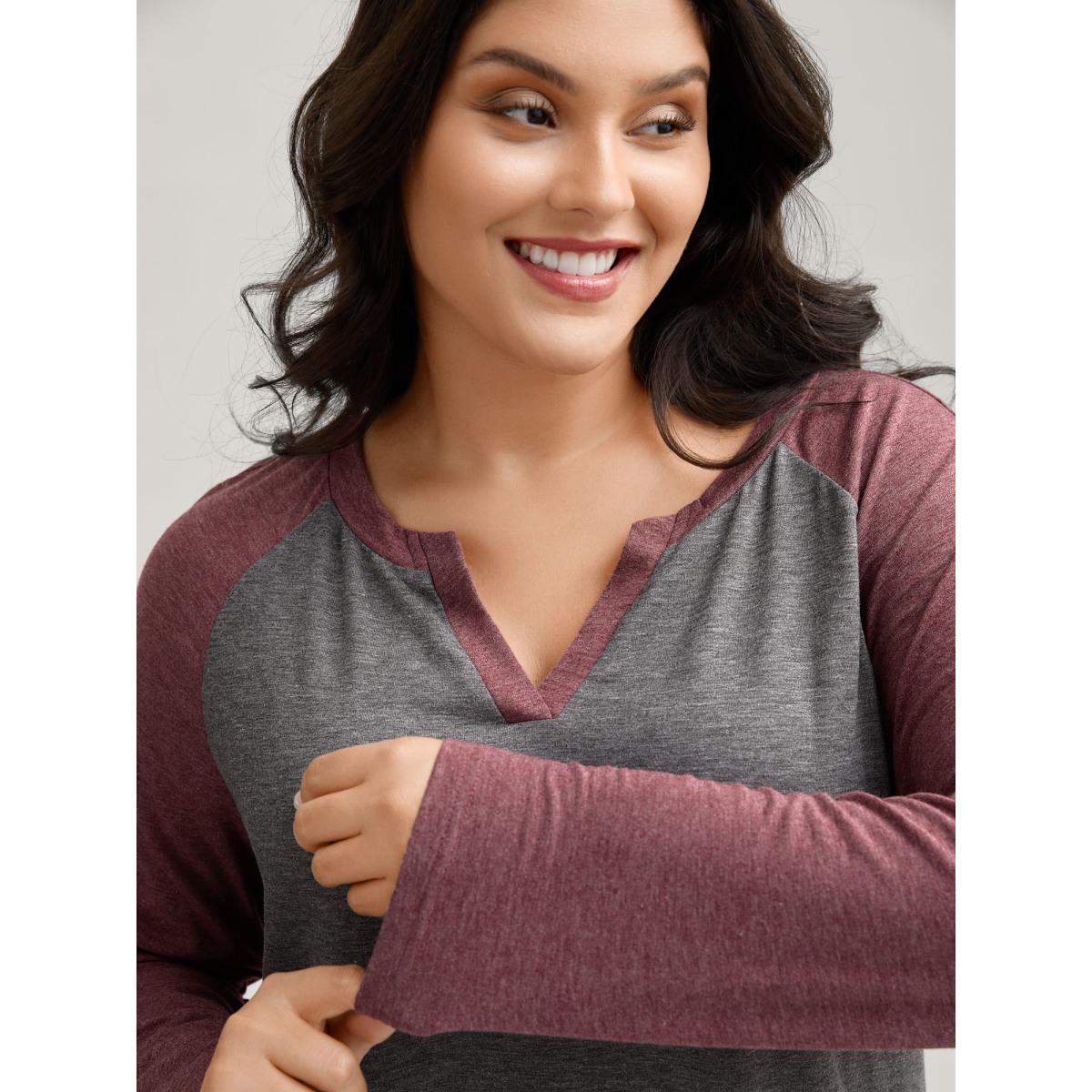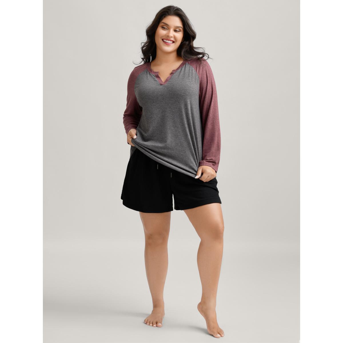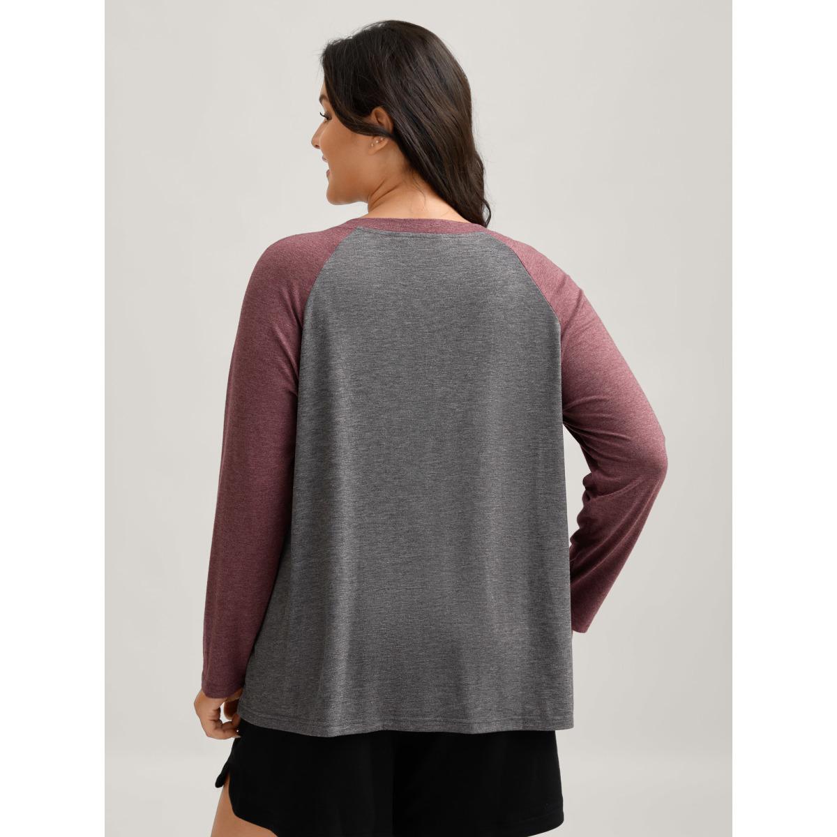 Plus Size Supersoft Color Contrast Raglan Sleeve Lounge Top Women Burgundy Contrast Flat collar with V-notch Loungewear BloomChic 18-20/2X