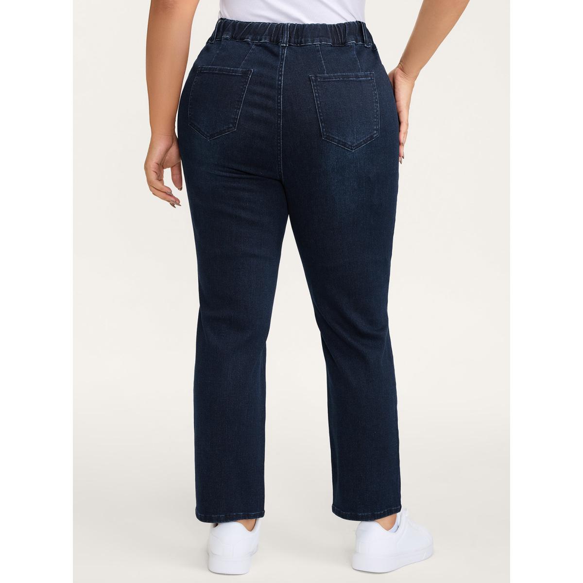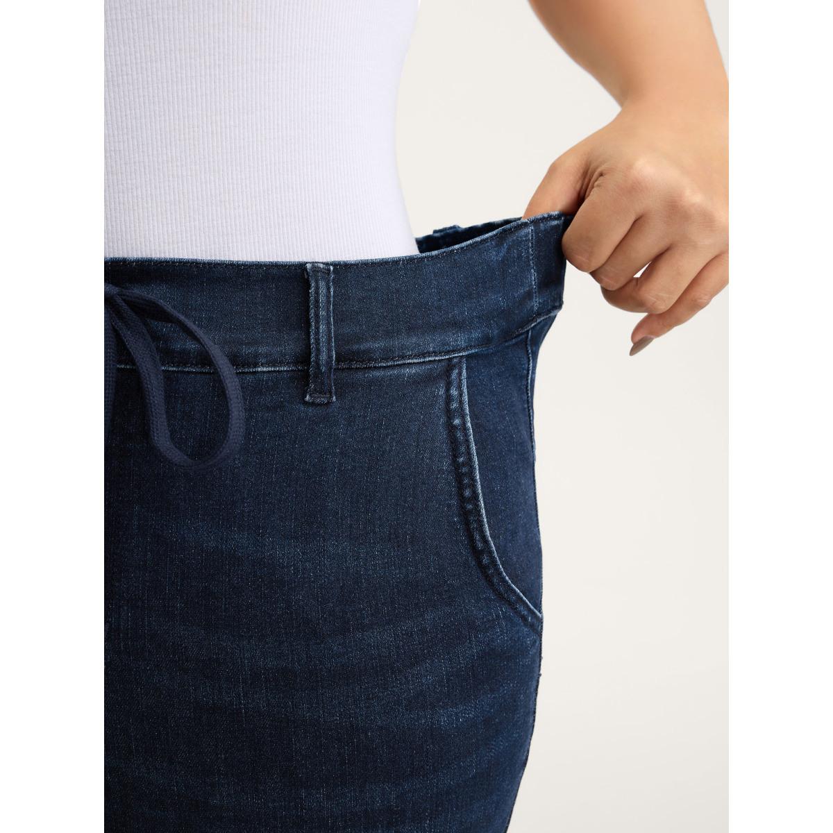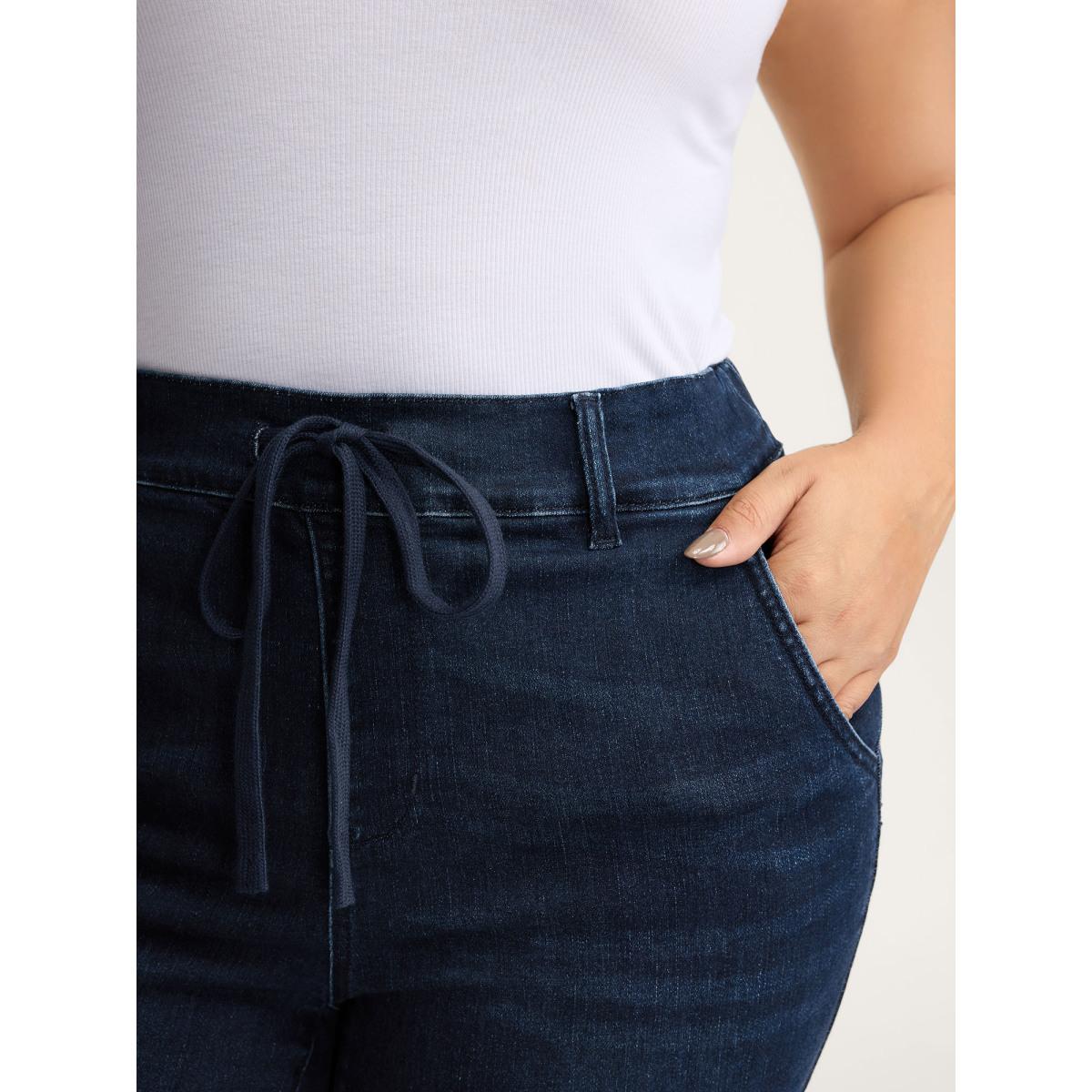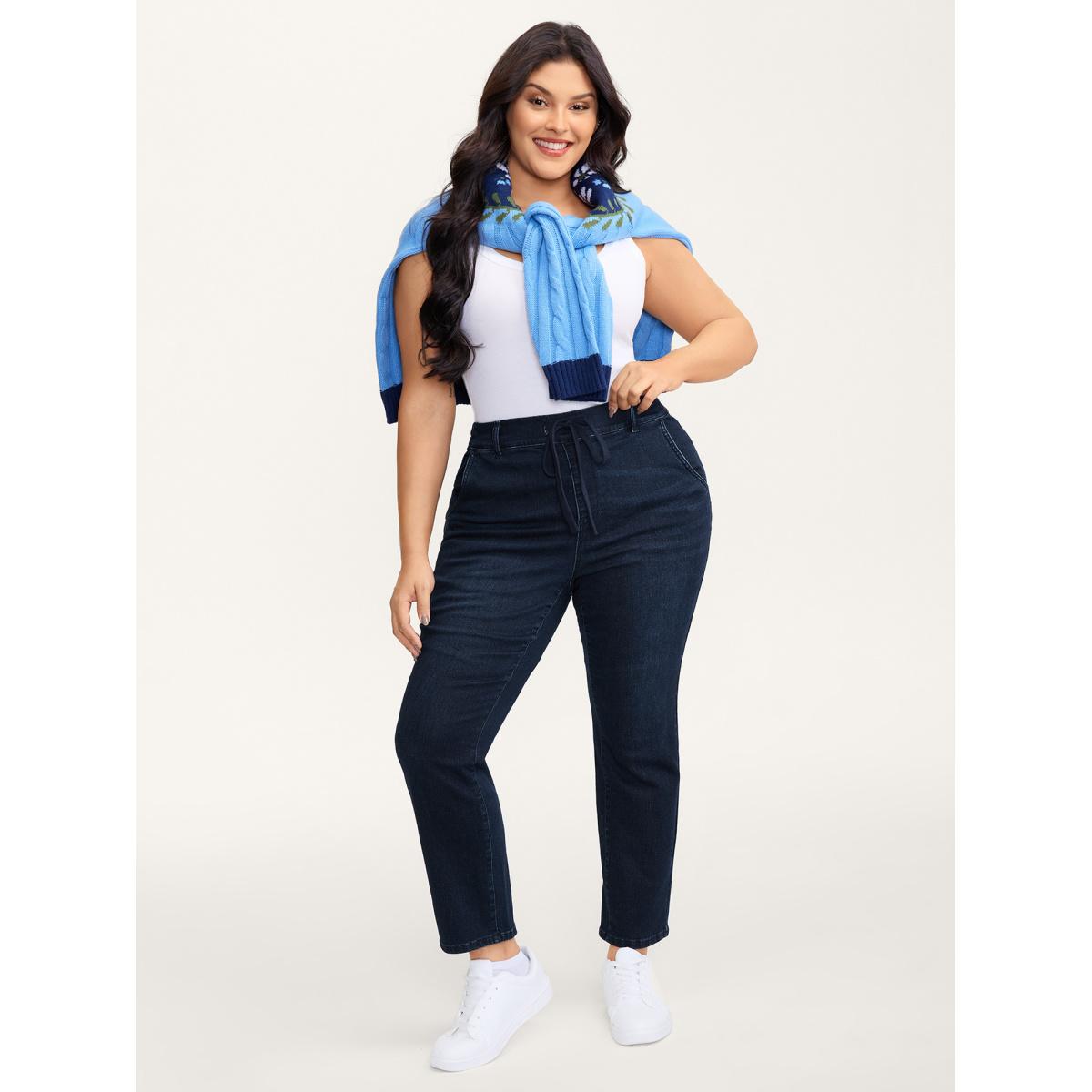 Plus Size Supersoft Elastic Waistband Drawstring Straight Leg Jeans Women Darkindigo Leisure Elastic Waist High stretch Slanted pocket Jeans BloomChic 30/6X