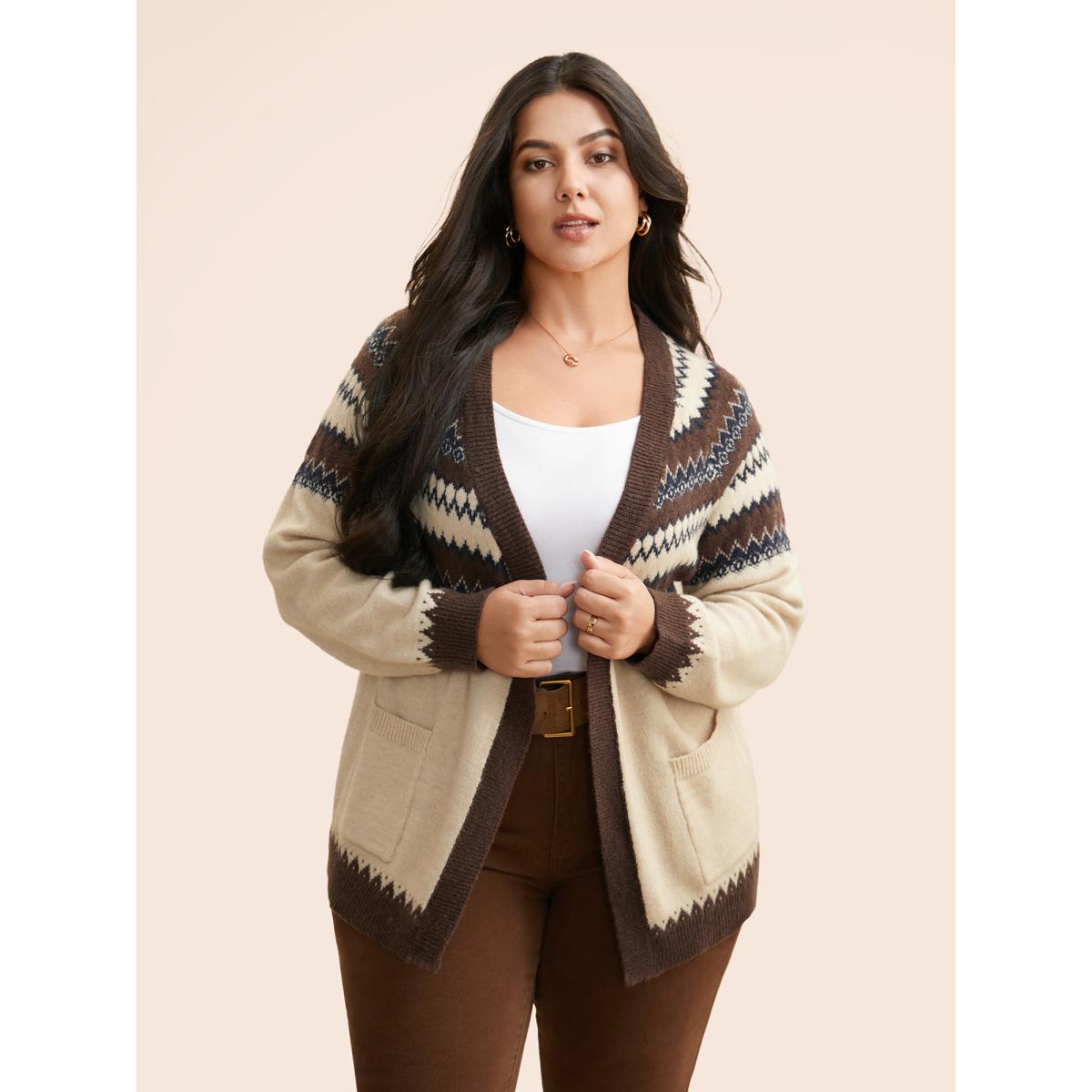 Plus Size Supersoft Essentials Bandana Jacquard Pocket Cardigan DarkBrown Women Leisure Loose Long Sleeve Casual Cardigans BloomChic 26/4X