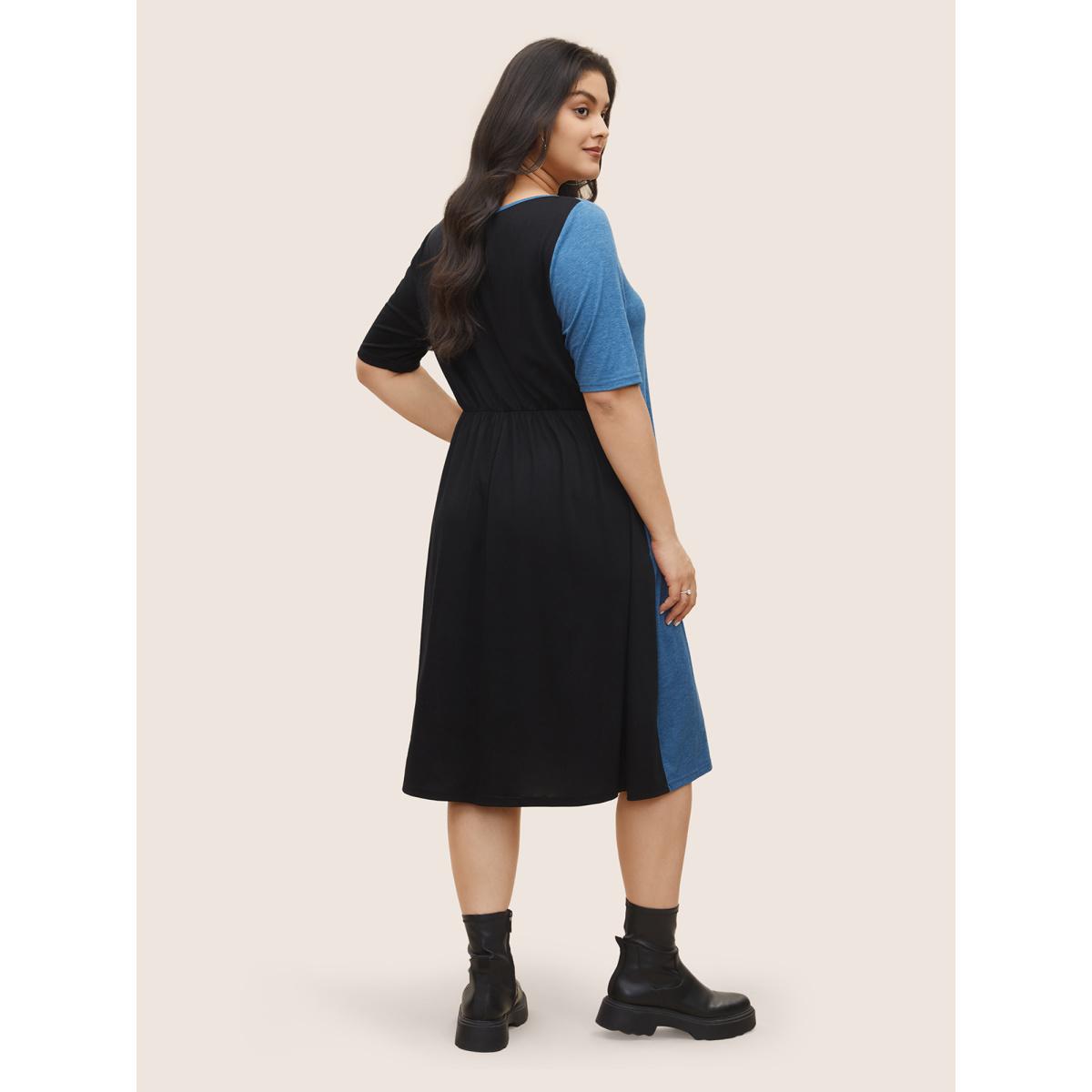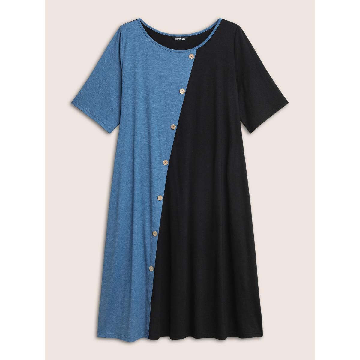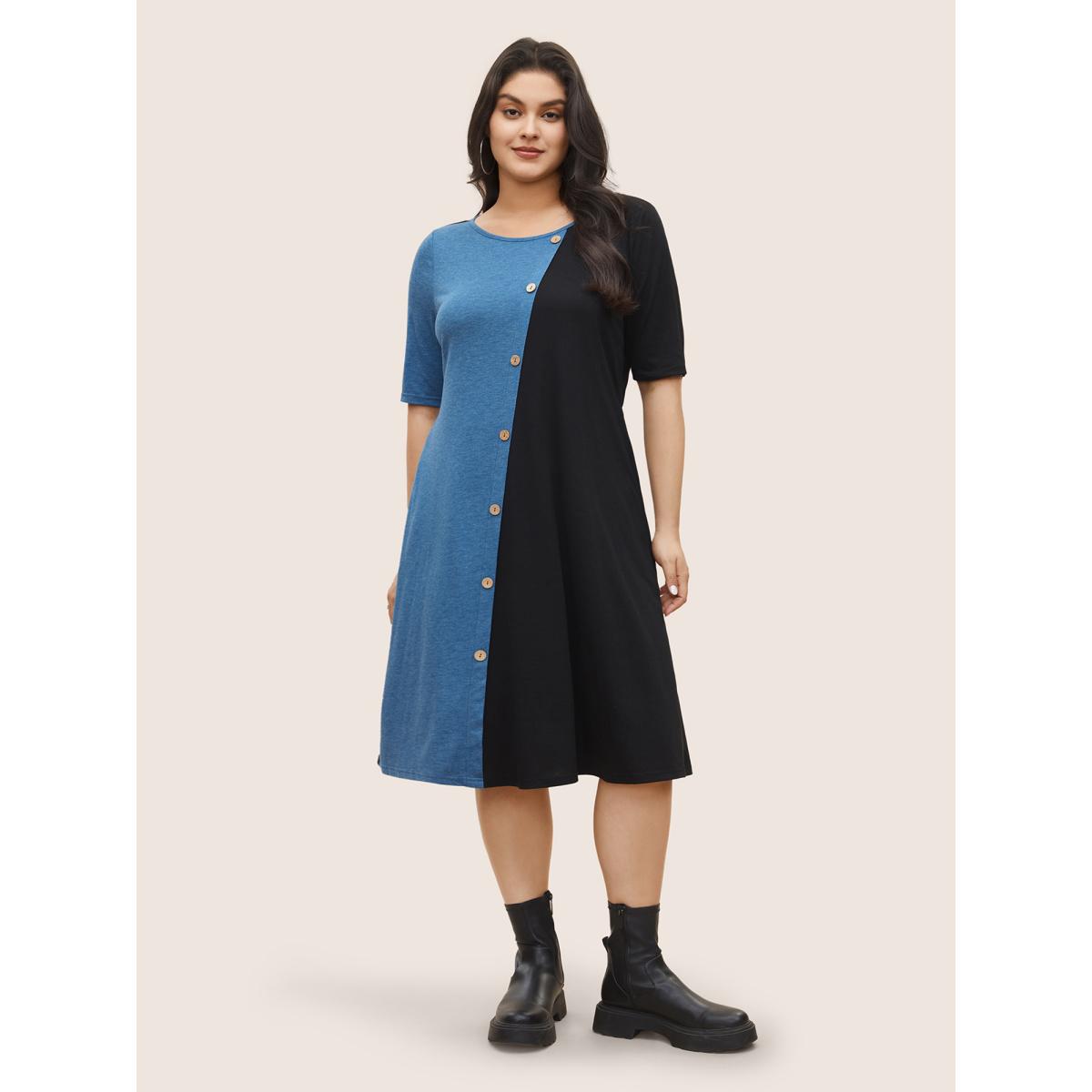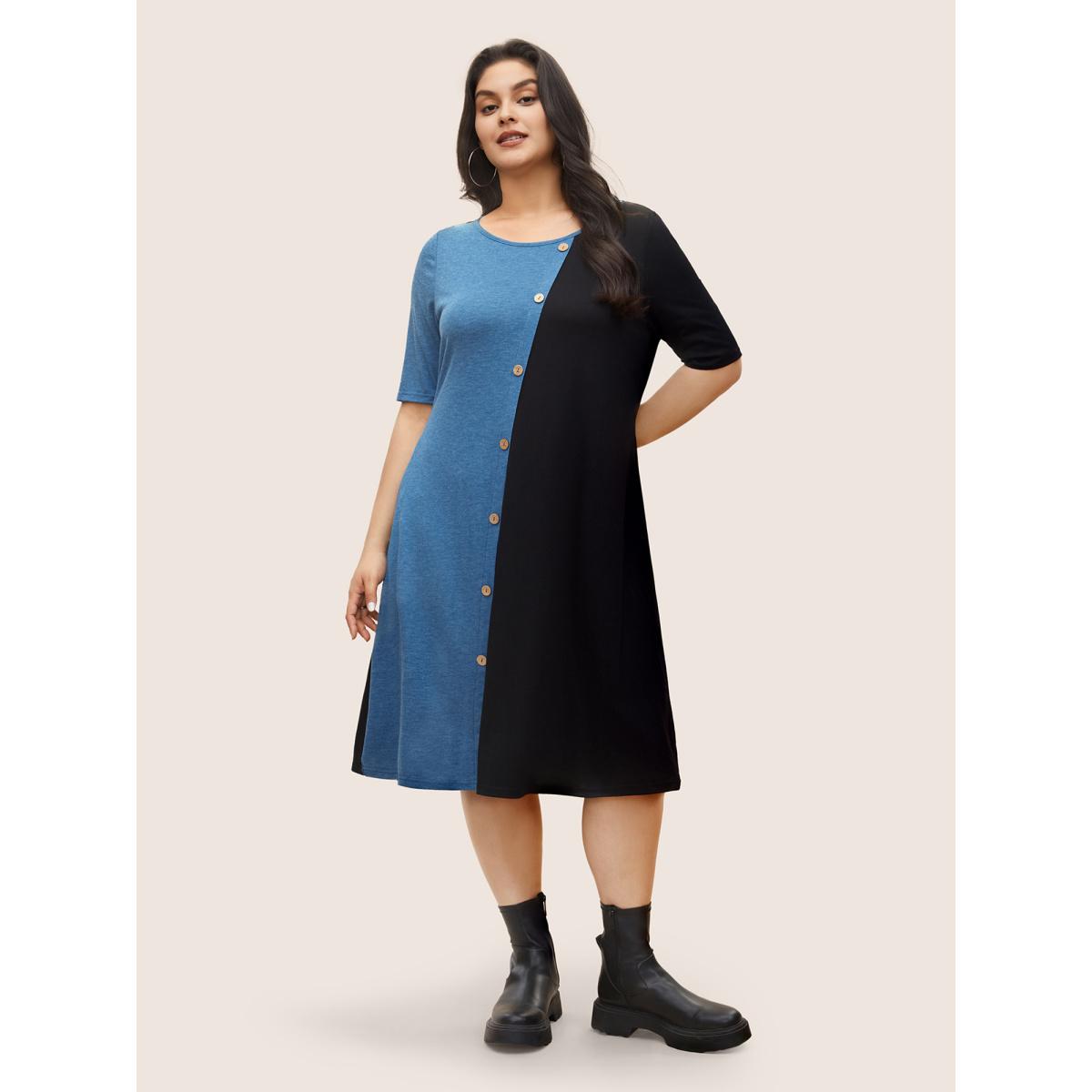 Plus Size Supersoft Essentials Colorblock Button Detail Patchwork Dress Blue Women Casual Non Round Neck Short sleeve Curvy Midi Dress BloomChic 22-24/3X