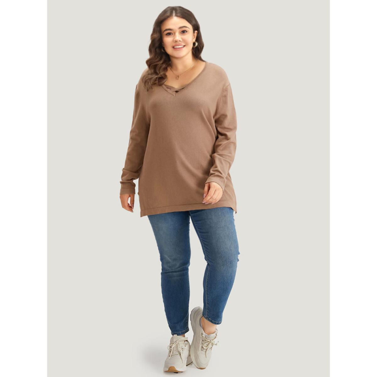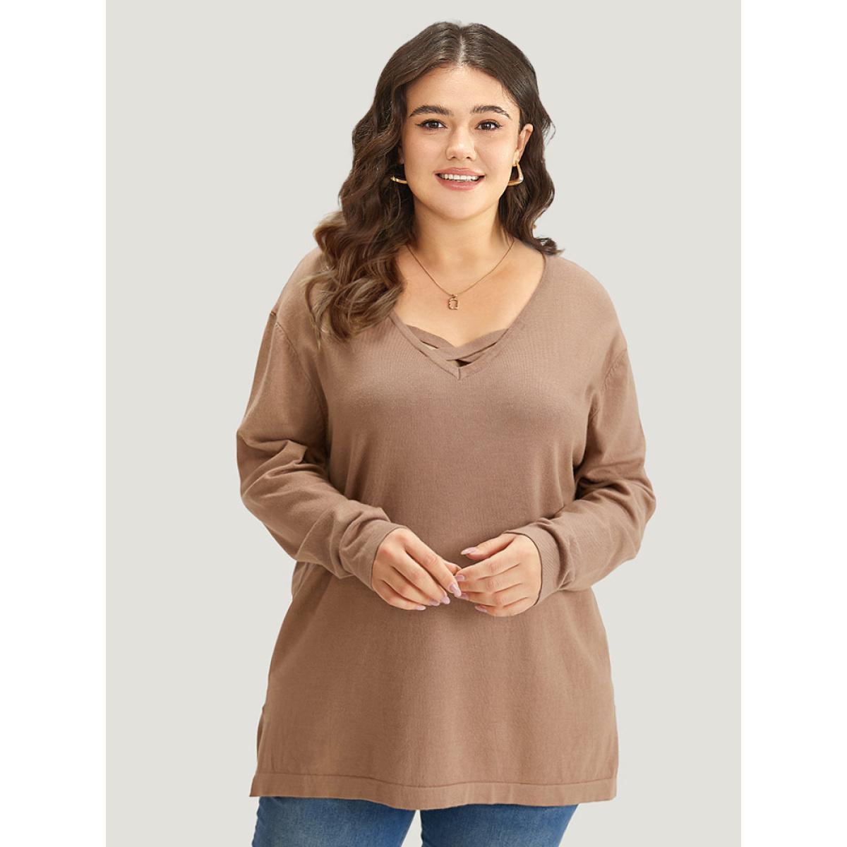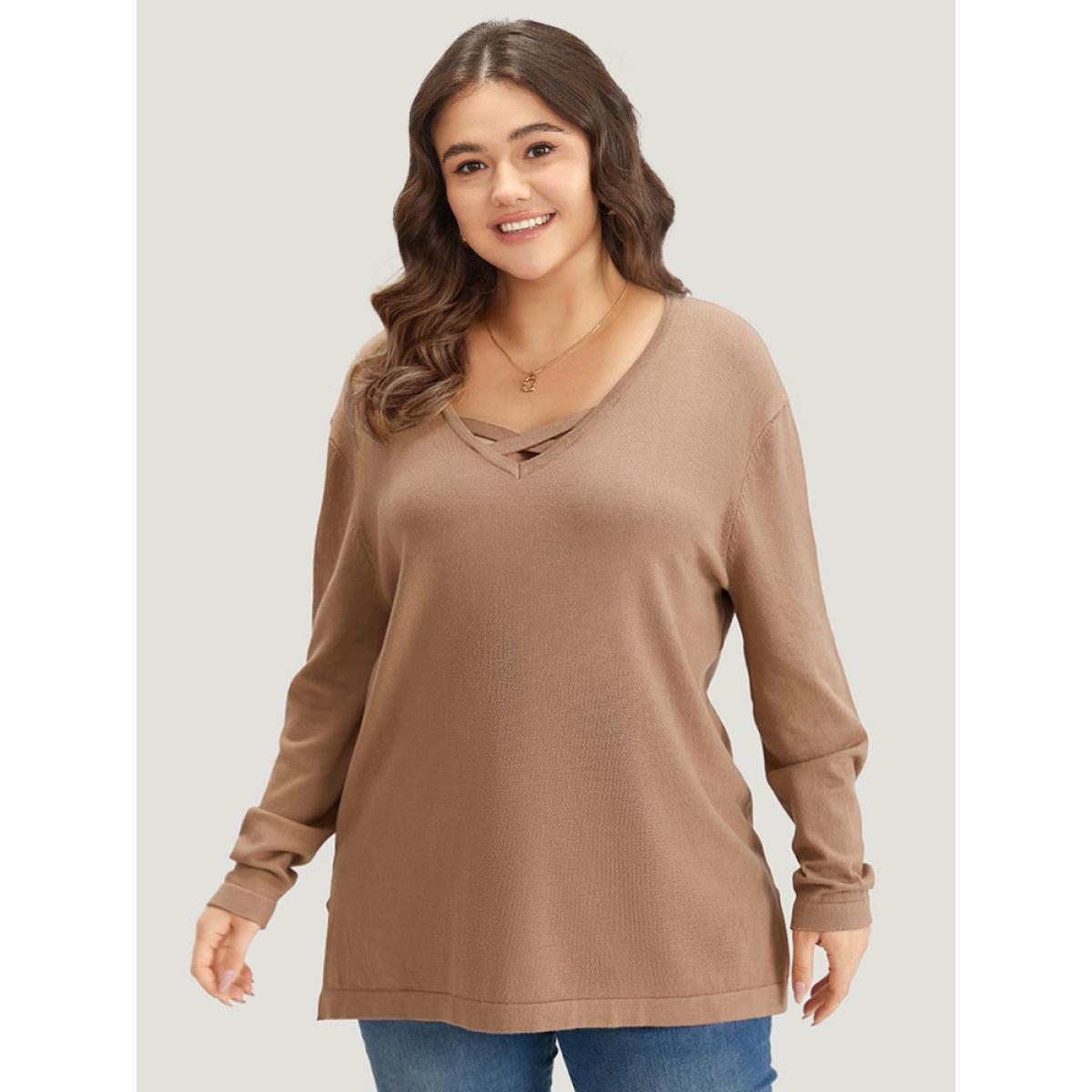 Plus Size Supersoft Essentials Crisscross Neck Split Side Pullover Tan Women Casual Loose Long Sleeve V-neck Dailywear Pullovers BloomChic 26/4X