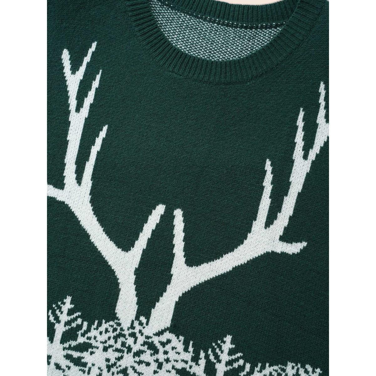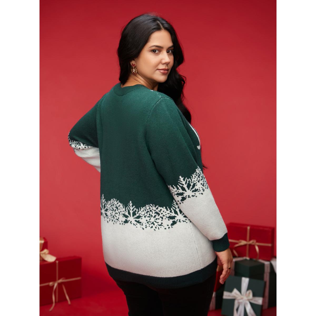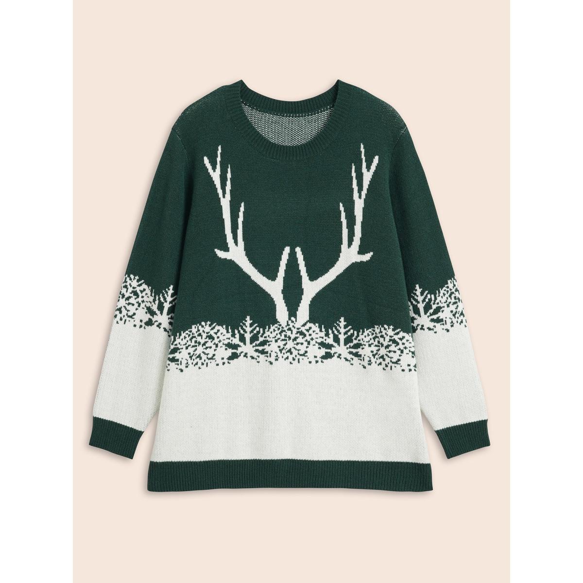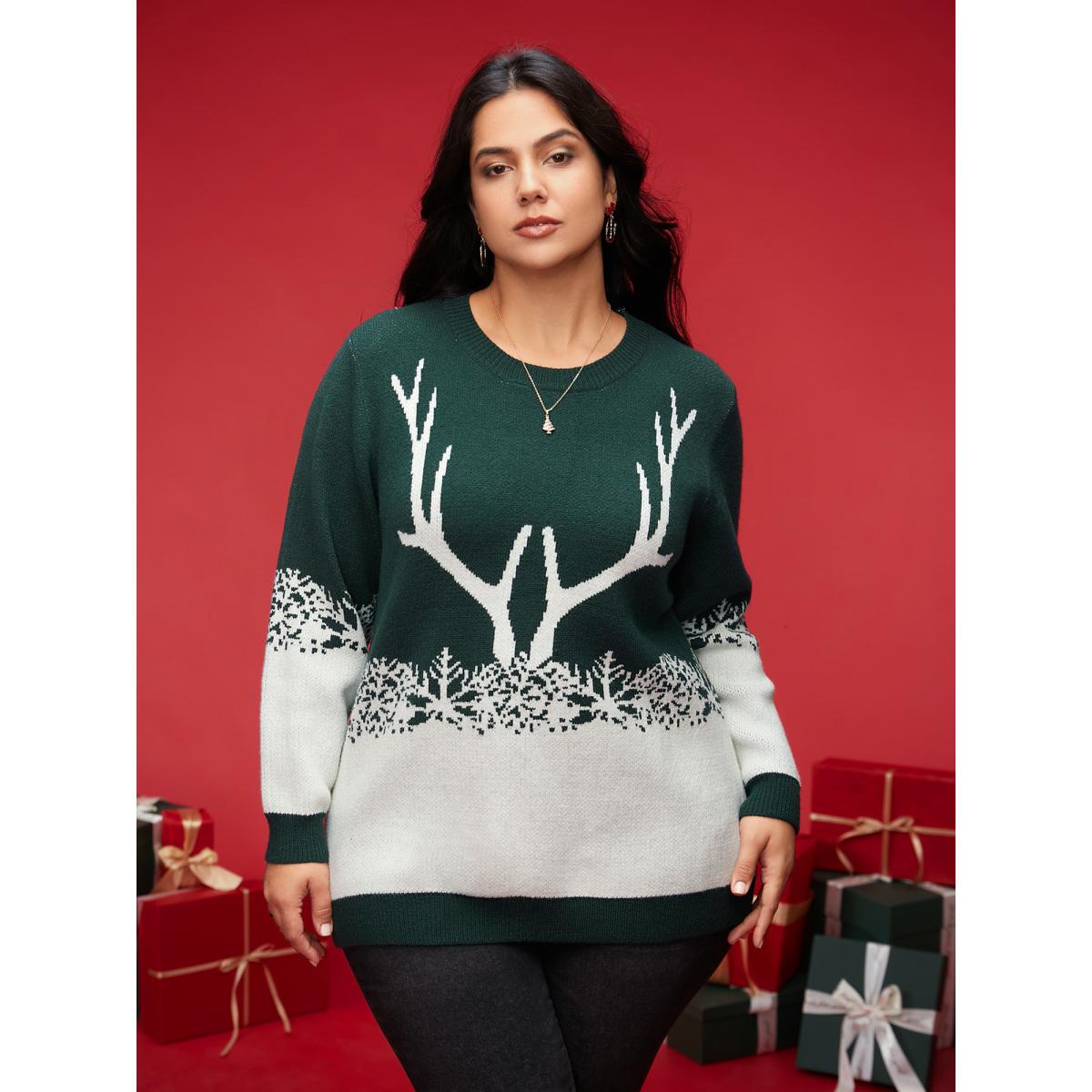 Plus Size Supersoft Essentials Frosty Deer Pattern Contrast Color Pullover Emerald Women Casual Loose Long Sleeve Round Neck Everyday Pullovers BloomChic 18-20/2X