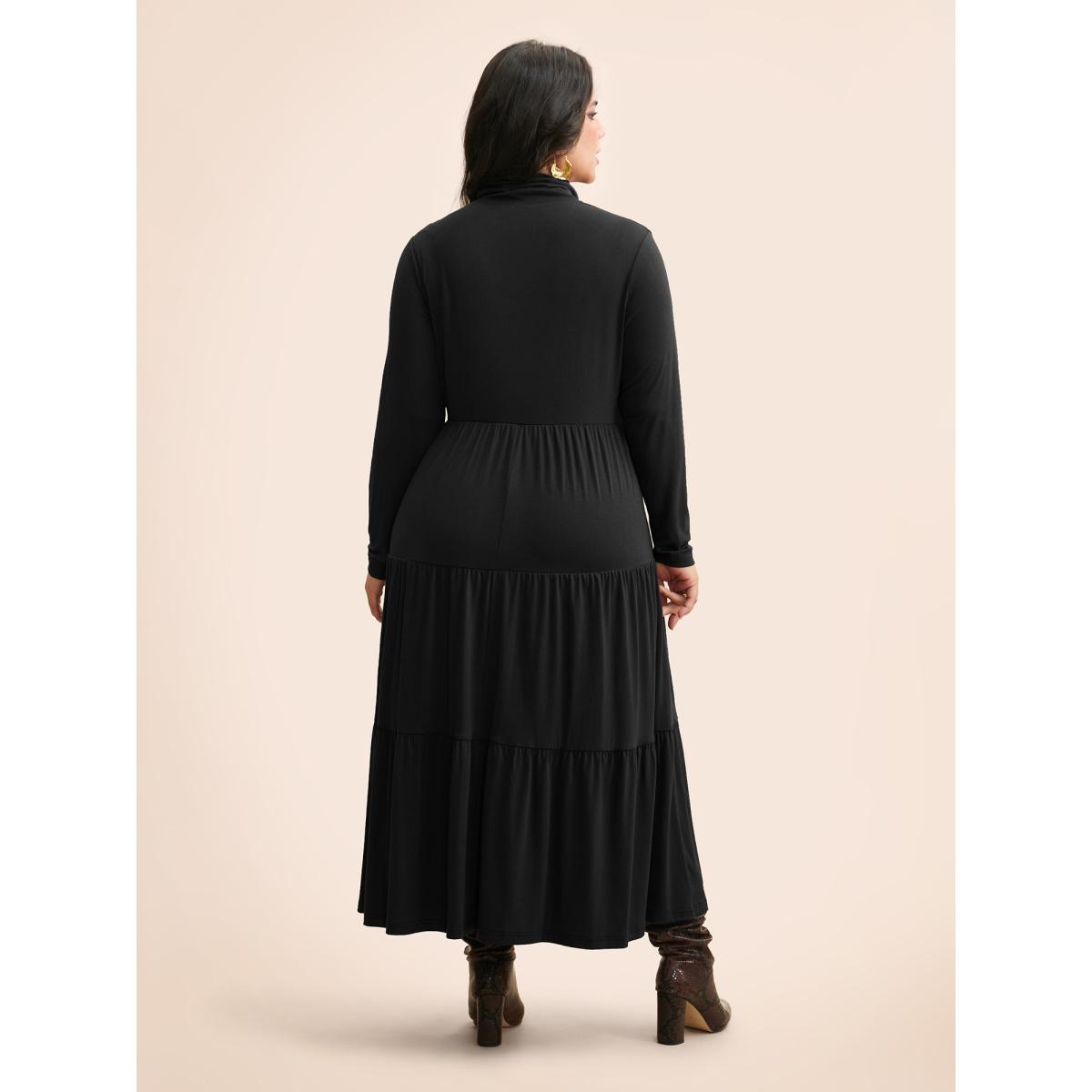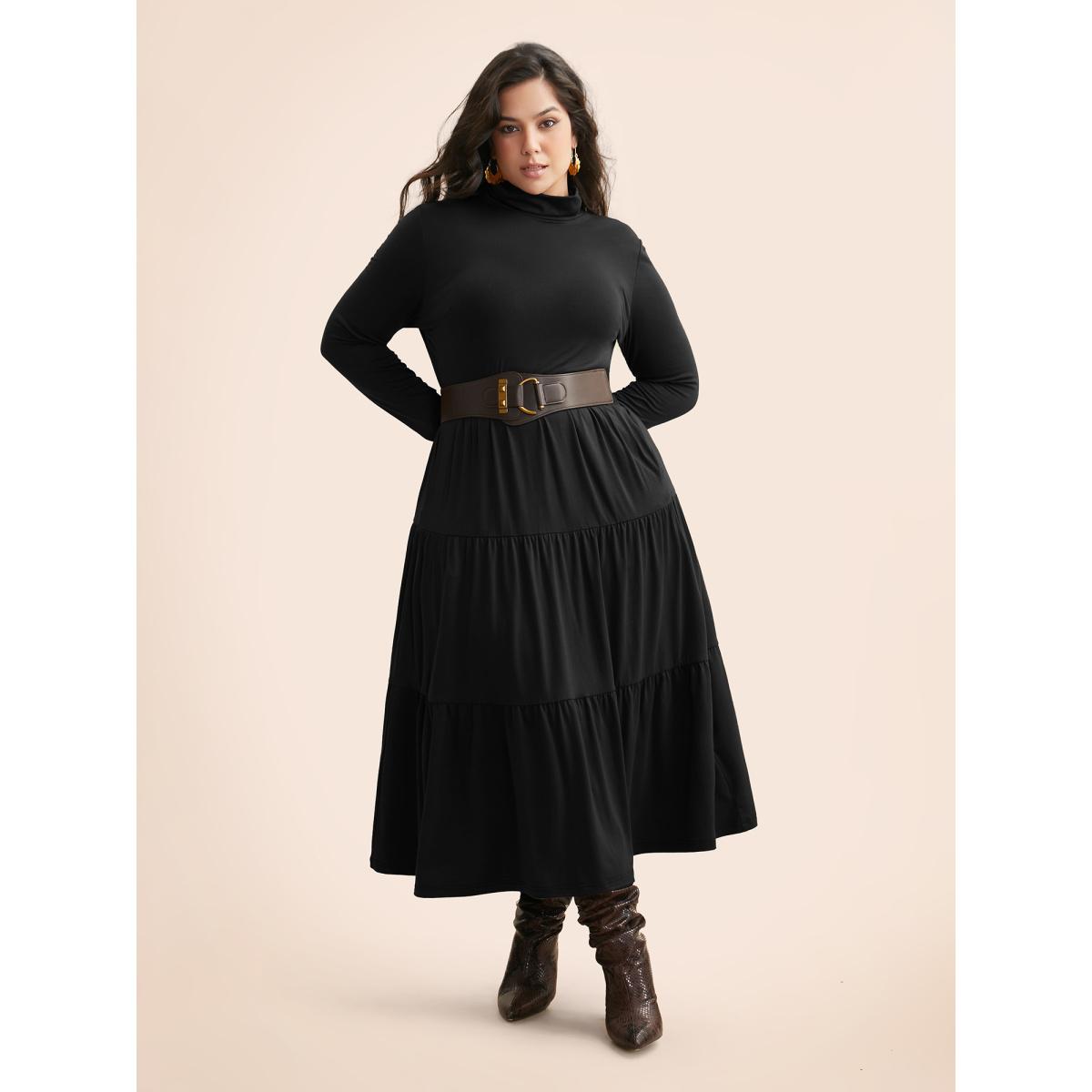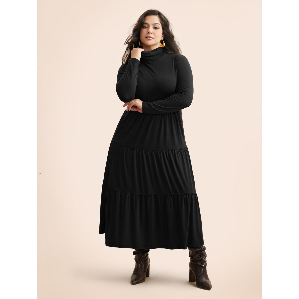 Plus Size Supersoft Essentials Funnel Neck Tiered Midi Dress Pureblack Women Casual Ruffles Mock Neck Long Sleeve Curvy BloomChic 28/5X