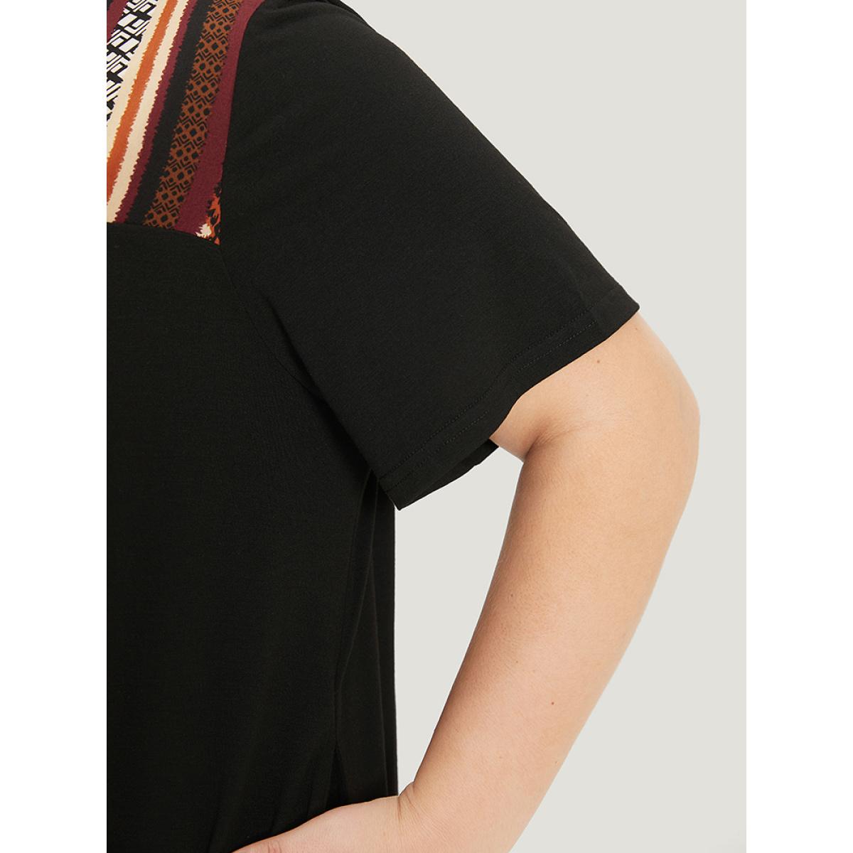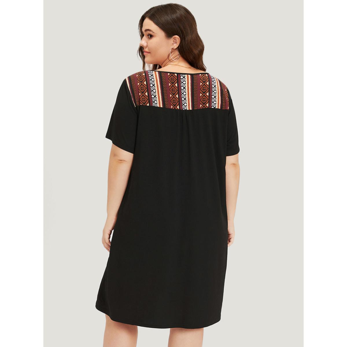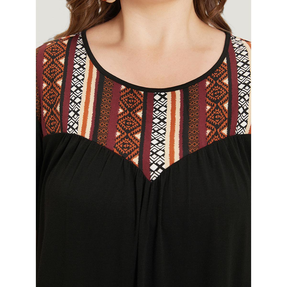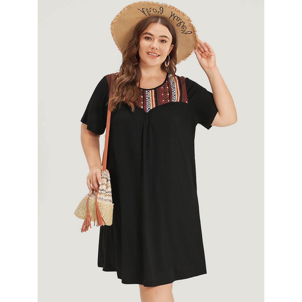 Plus Size Supersoft Essentials Geometric Print Patchwork Gathered Ruffle Sleeve Dress Maroon Women Vacation Gathered Round Neck Short sleeve Curvy Knee Dress BloomChic 30/6X