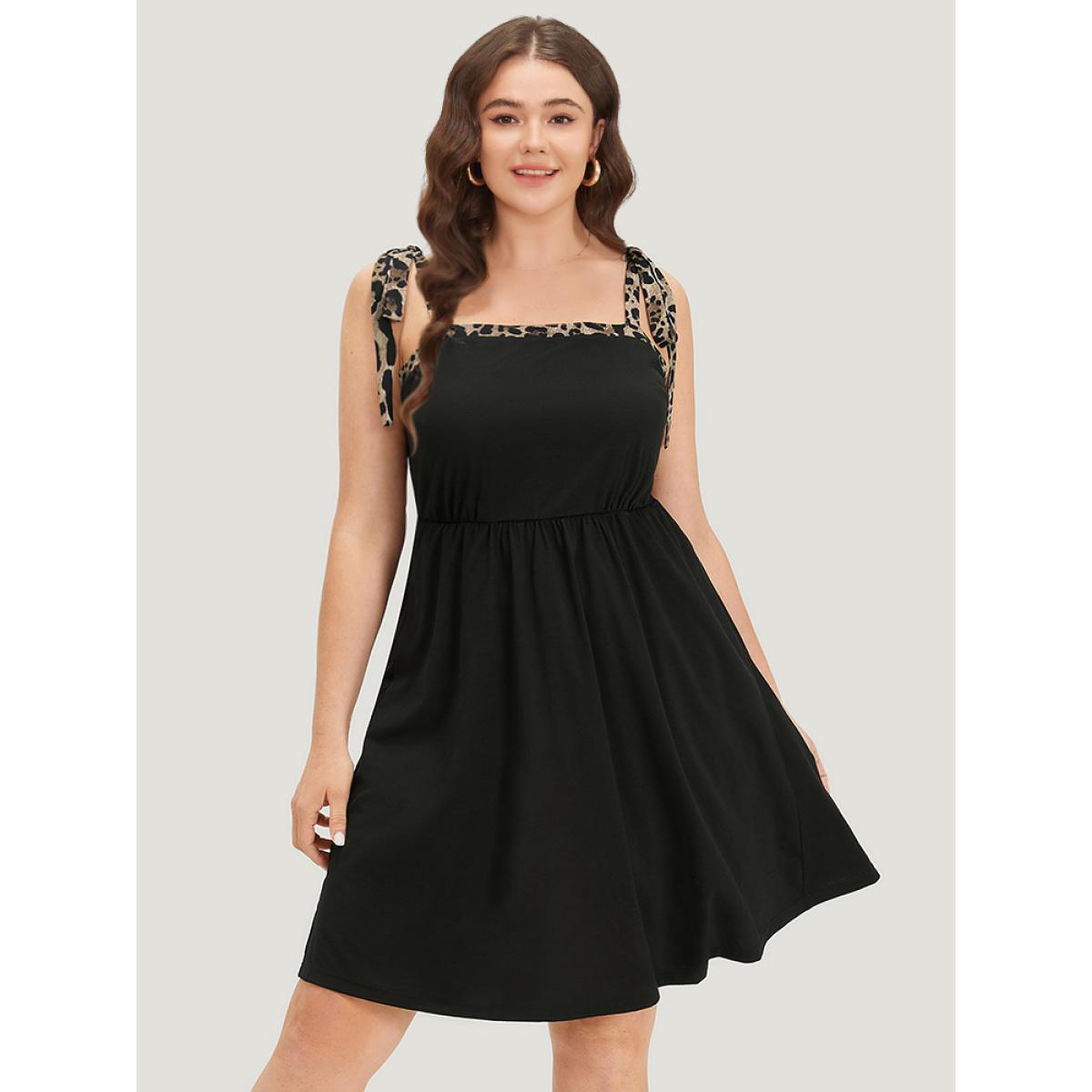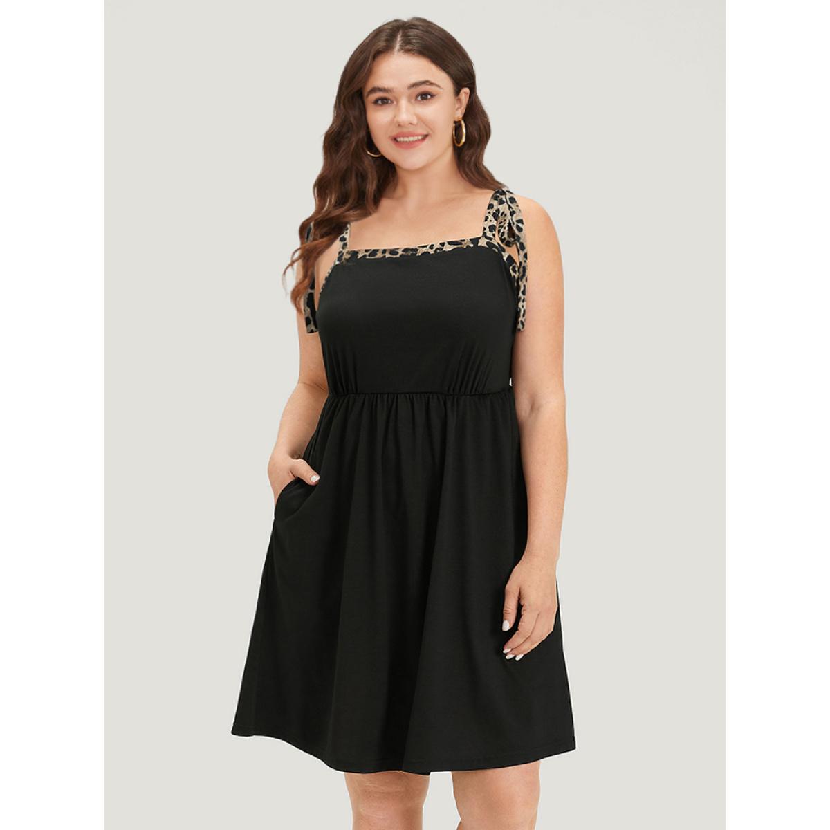 Plus Size Supersoft Essentials Leopard Patchwork Elastic Waist Pocket Cami Dress Black Women Casual Adjustable Straps Spaghetti Strap Sleeveless Curvy Knee Dress BloomChic 30/6X