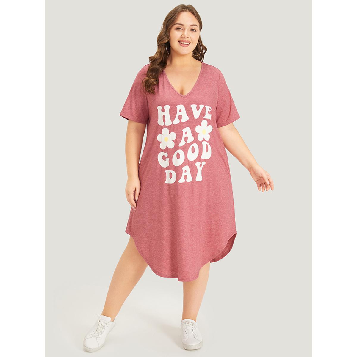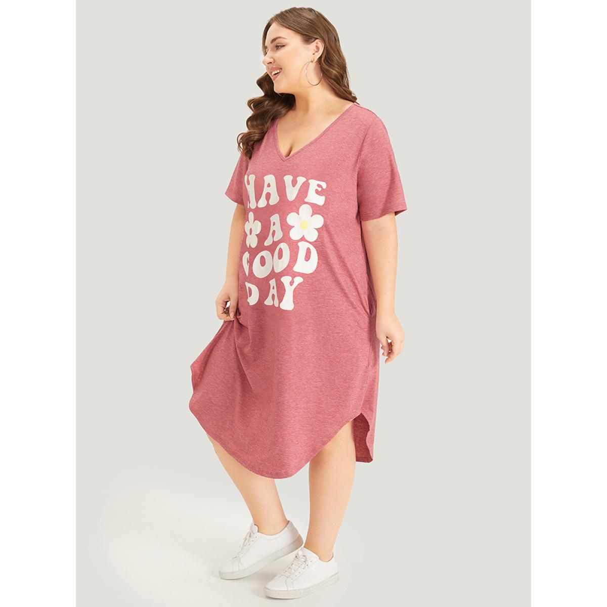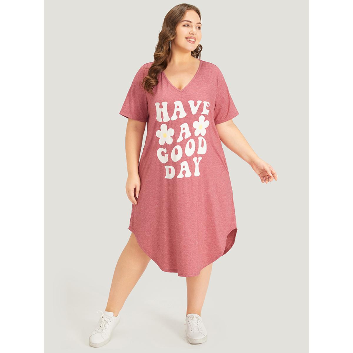 Plus Size Supersoft Essentials Letter & Floral Print V Neck Curved Hem Dress DustyPink Women Casual Plain Curvy Midi Dress BloomChic 28/5X