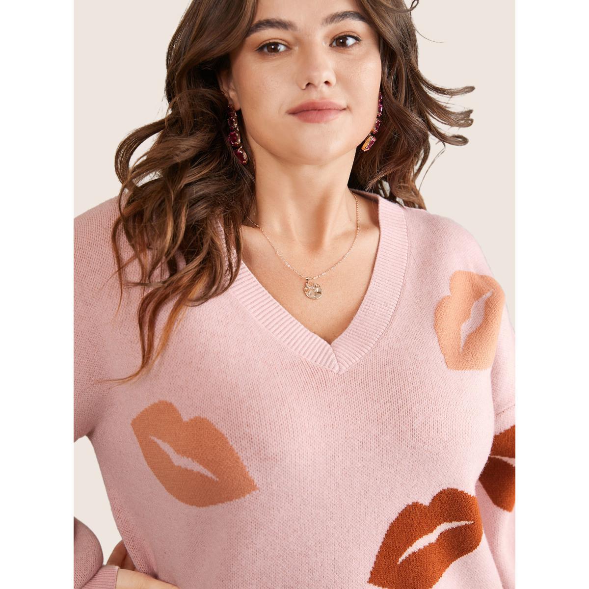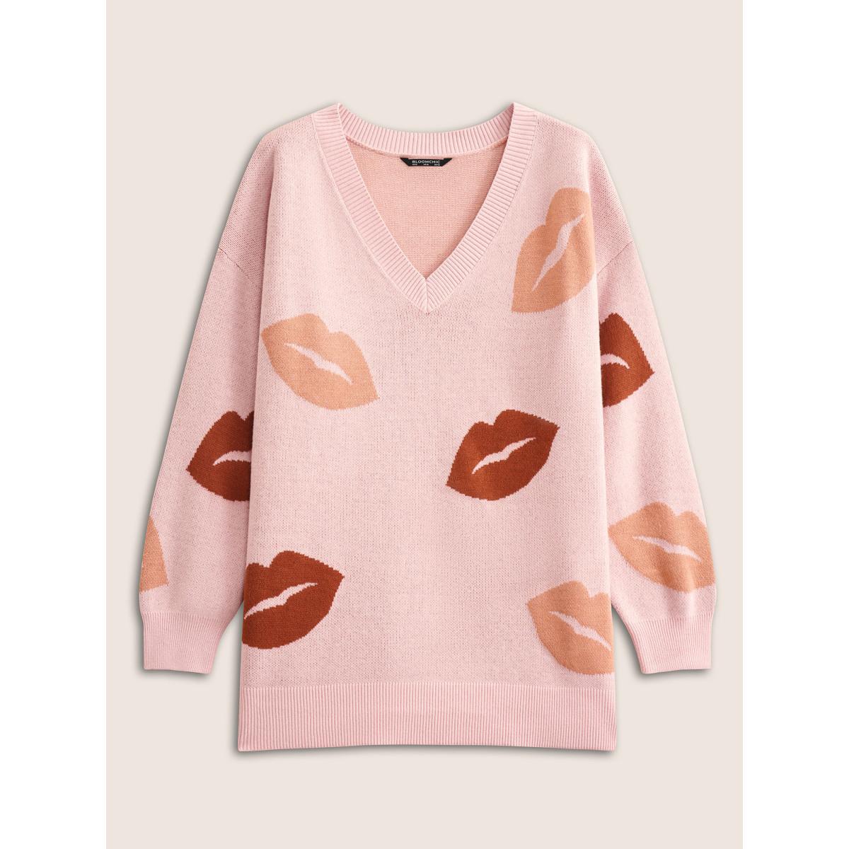 Plus Size Supersoft Essentials Lip Print Split Side Pullover Crepe Women Casual Long Sleeve V-neck Everyday Pullovers BloomChic 30/6X