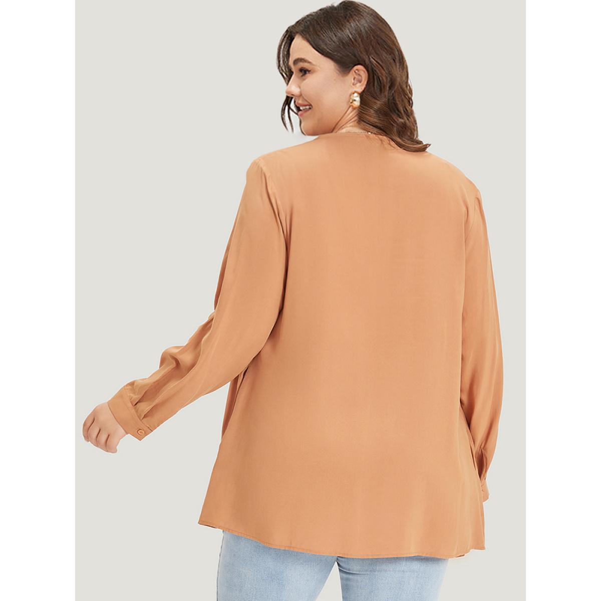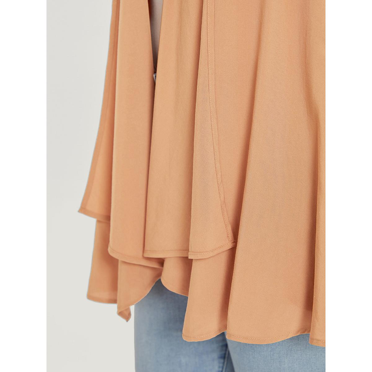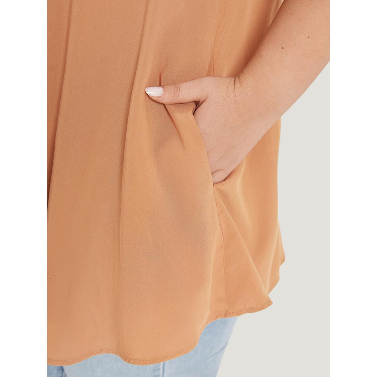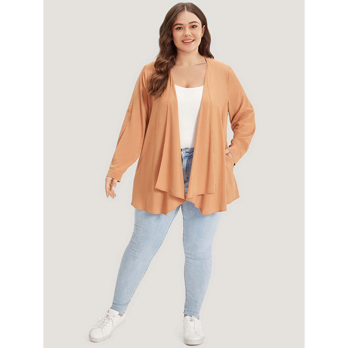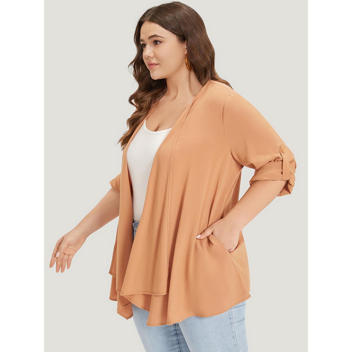 Plus Size Supersoft Essentials Plain Pocket Button Asymmetrical Hem Kimono Women Tan Casual Asymmetrical Pocket Dailywear Kimonos BloomChic 10/M