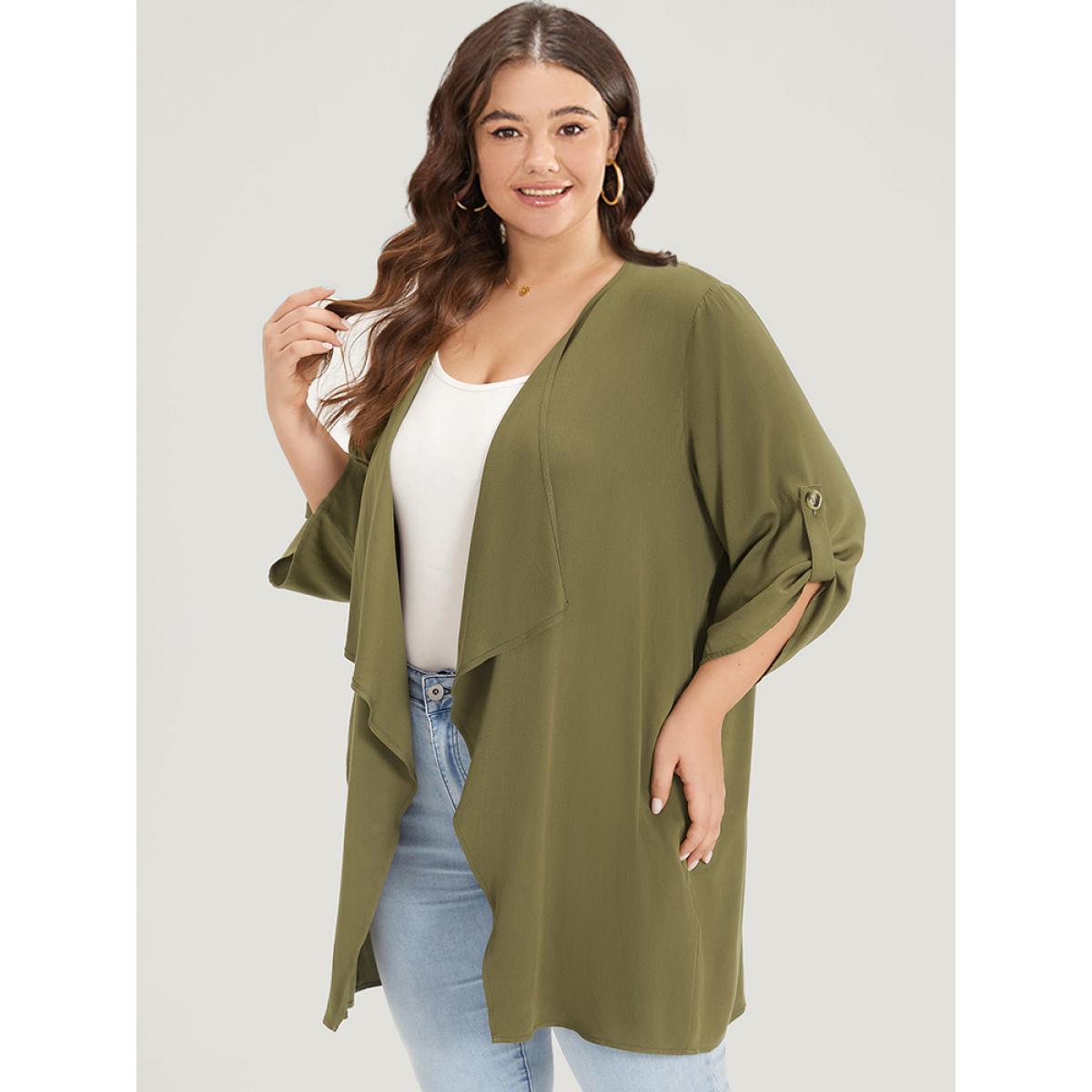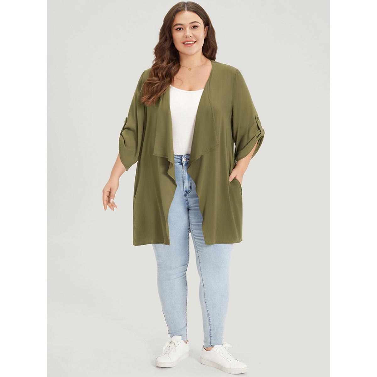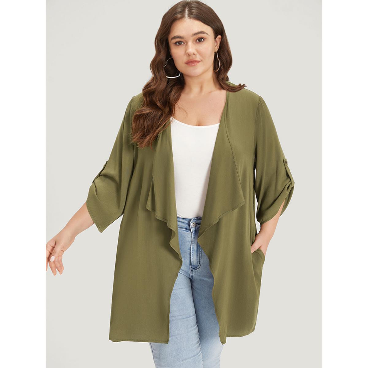 Plus Size Supersoft Essentials Plain Pocket Button Ruffle Open Front Kimono Women ArmyGreen Casual Plain Loose Pocket Dailywear Kimonos BloomChic 22-24/3X