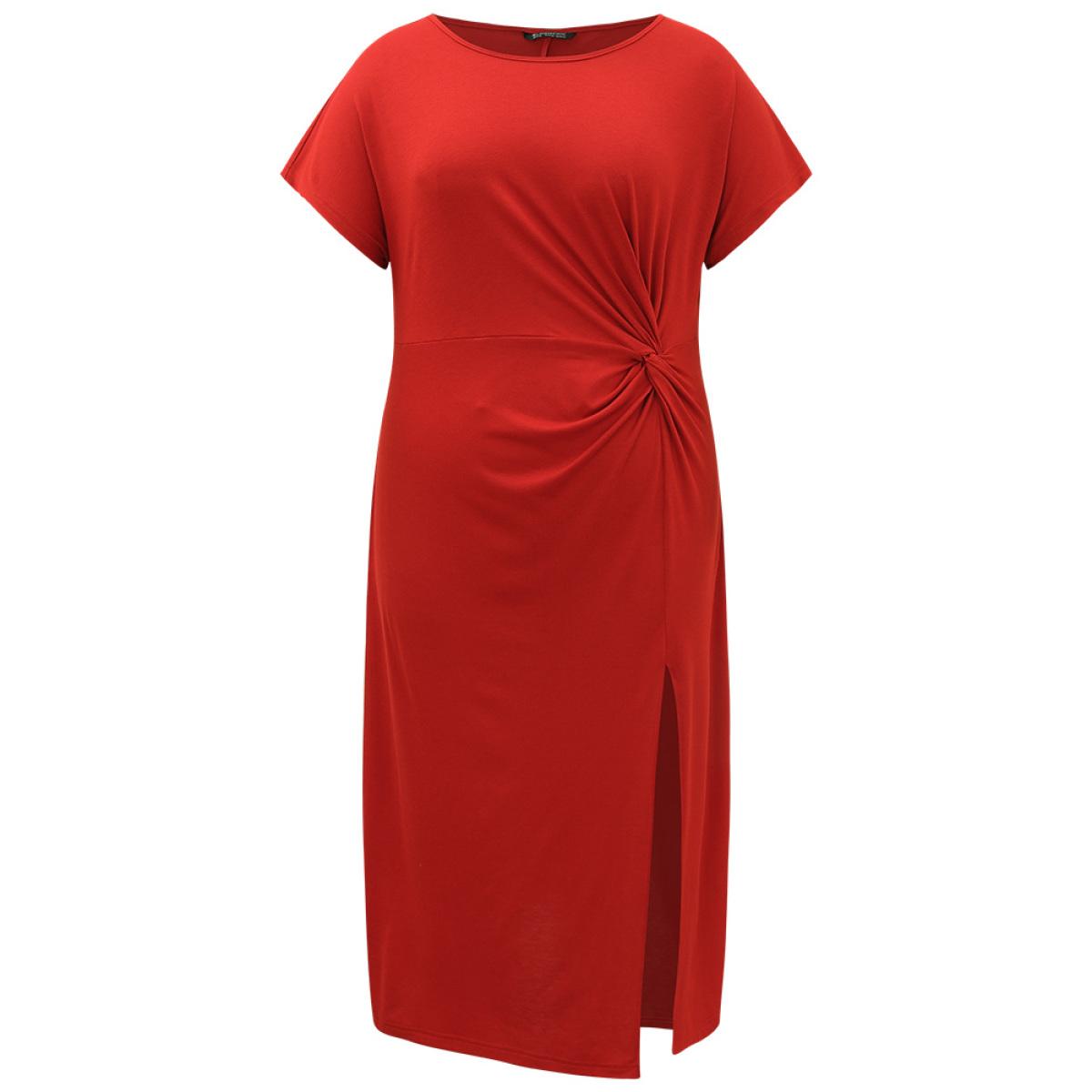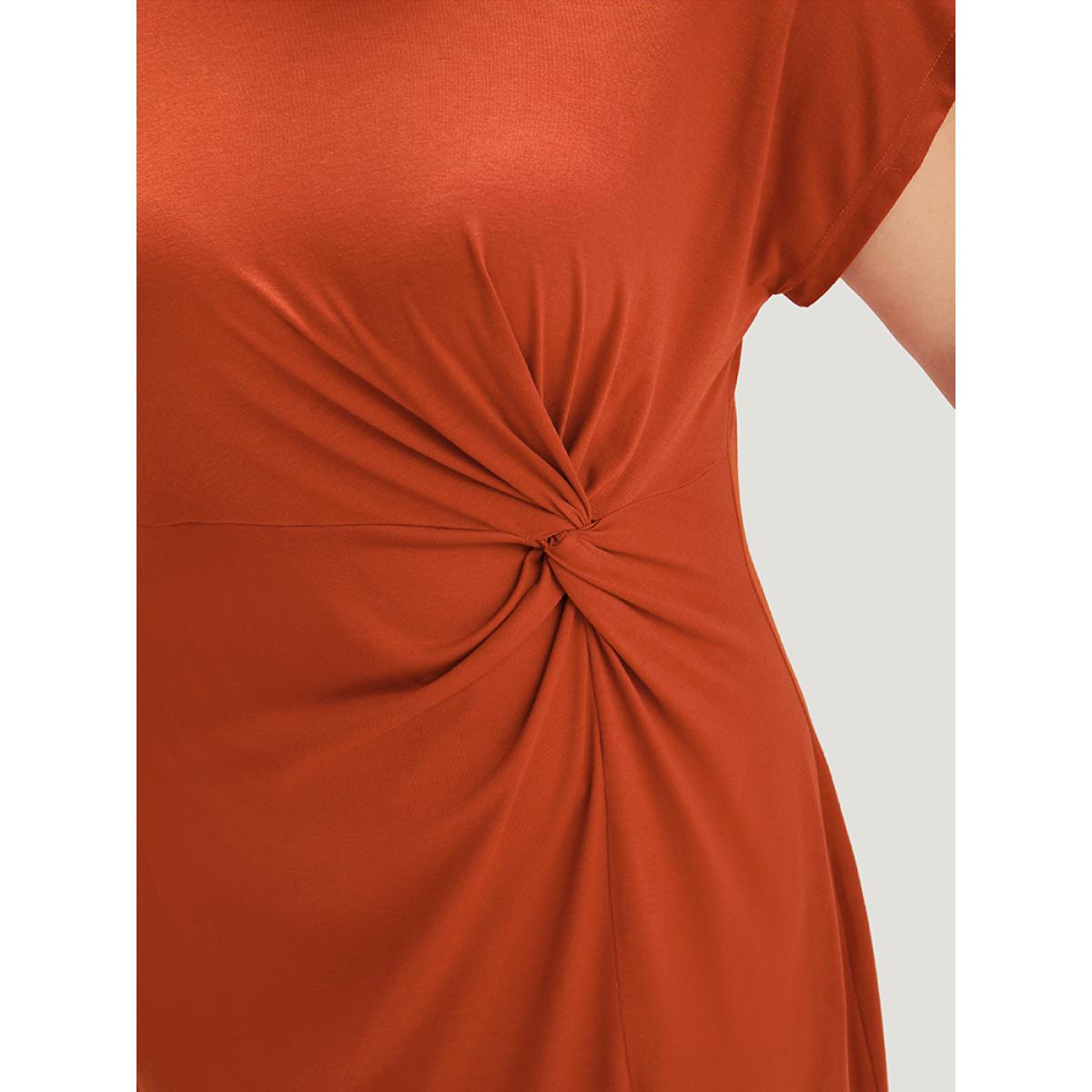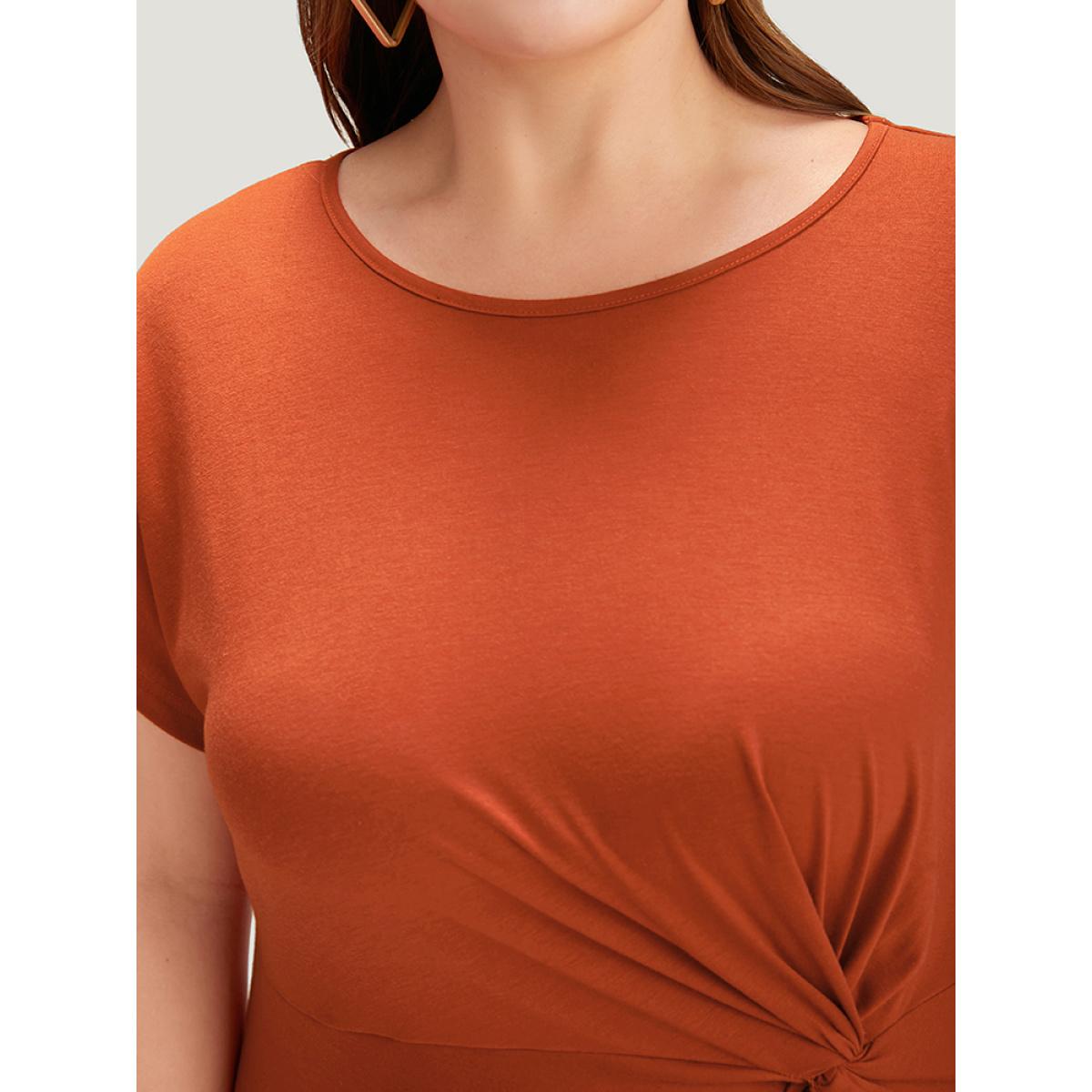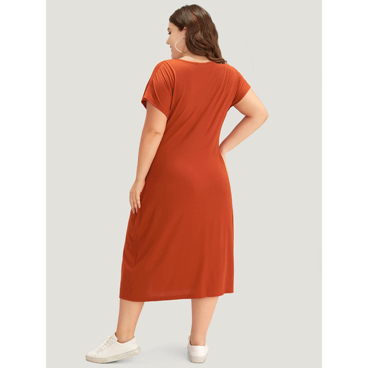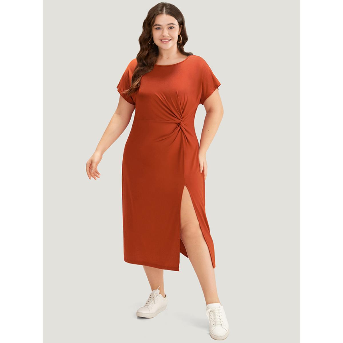 Plus Size Supersoft Essentials Solid Twist Front Split Hem Dress Rust Women Casual Plain Round Neck Short sleeve Curvy Midi Dress BloomChic 30/6X