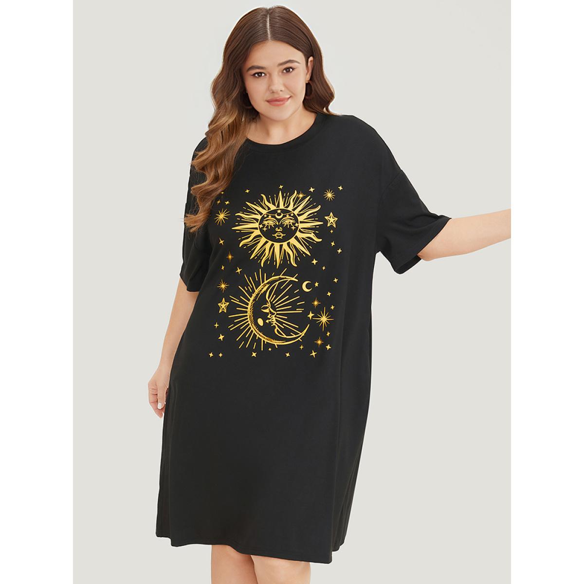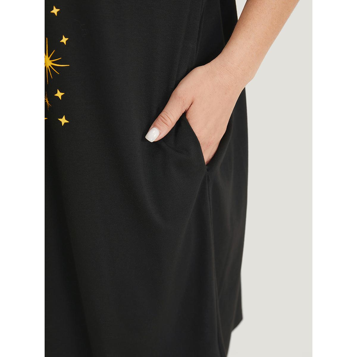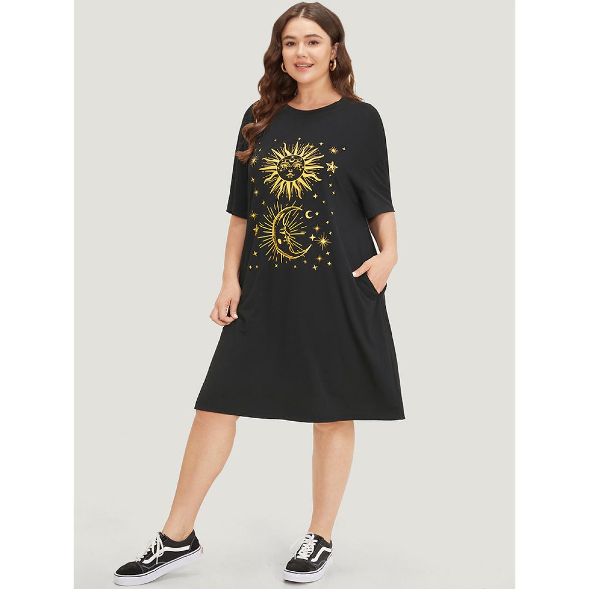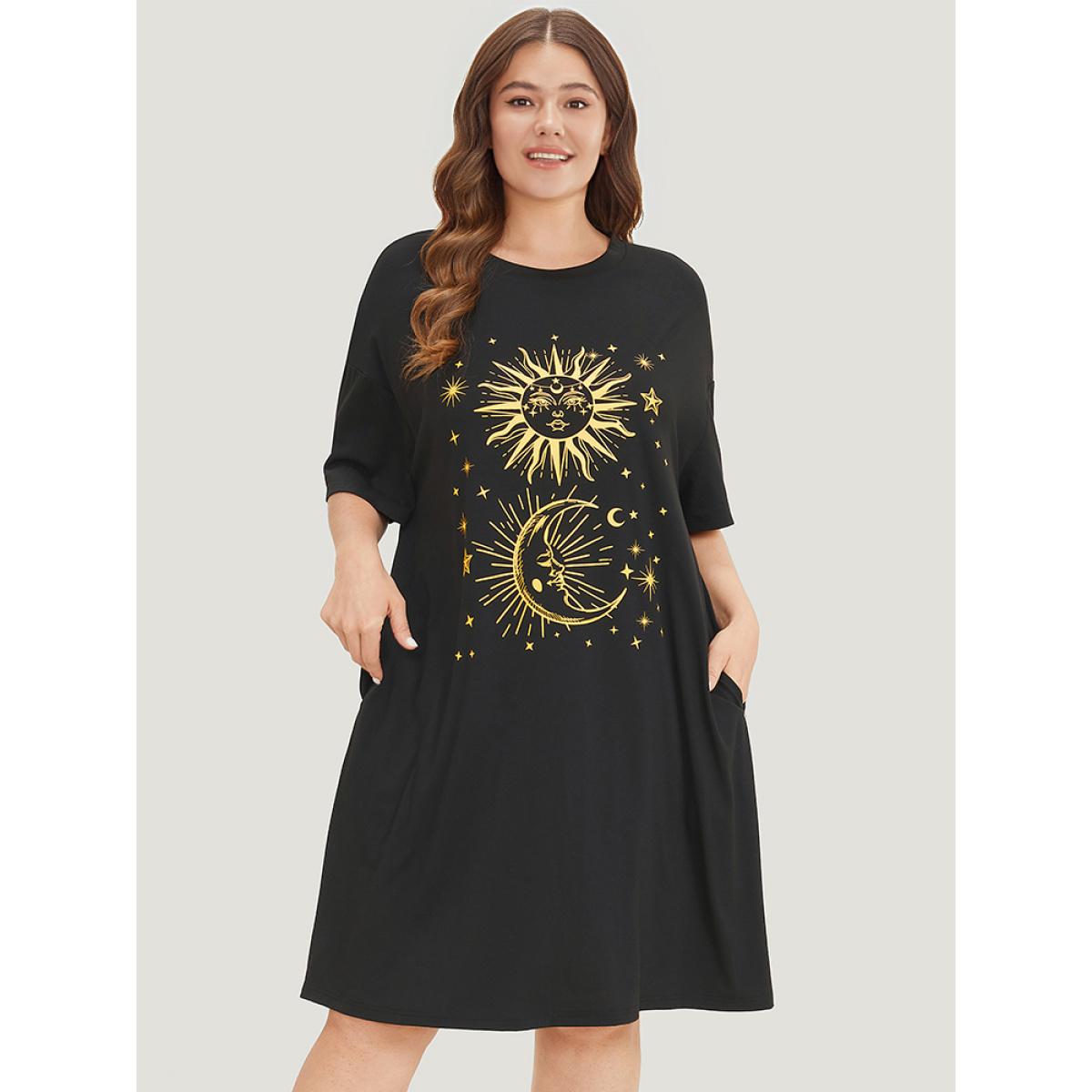 Plus Size Supersoft Essentials Star & Moon Print Pocket Crew Neck Dress Black Women Casual Plain Curvy Knee Dress BloomChic 12/L