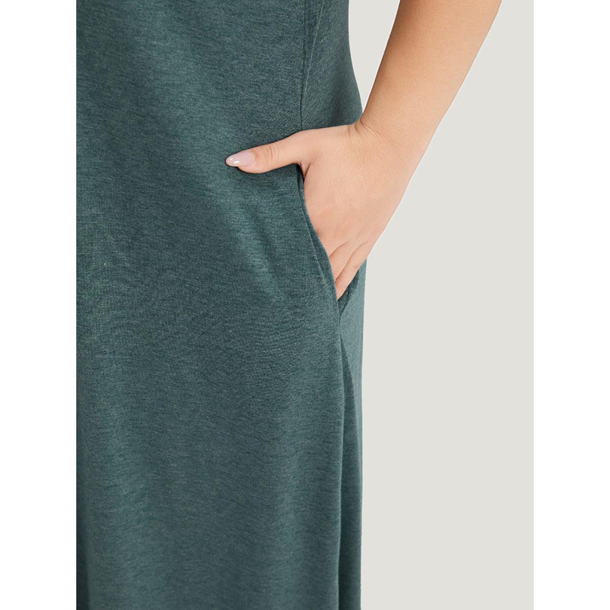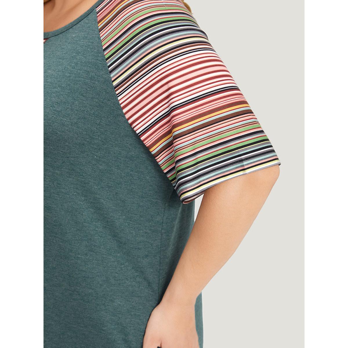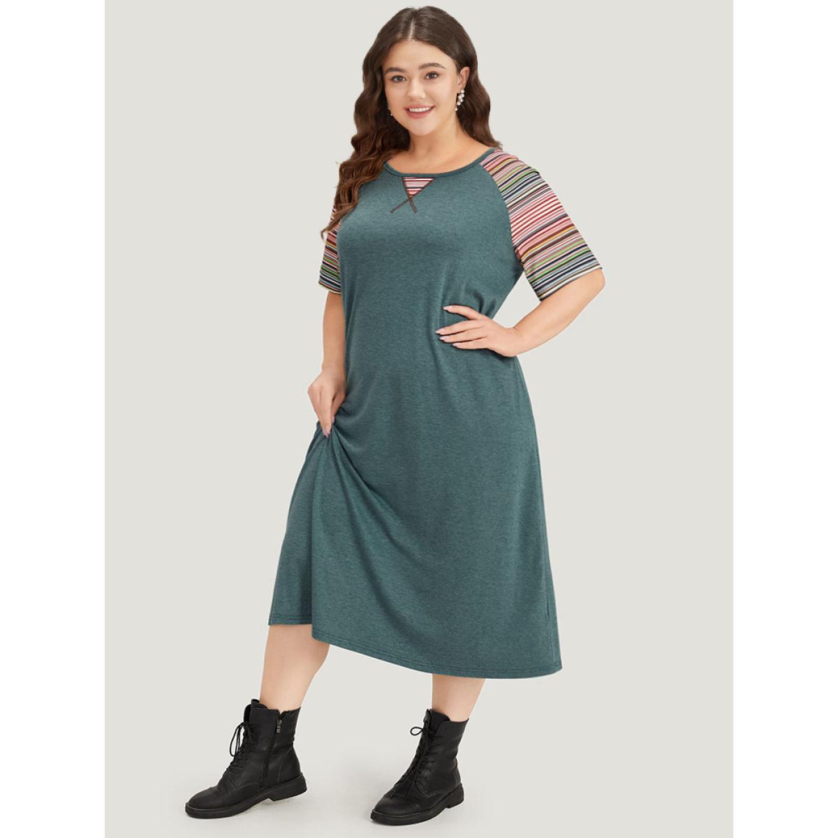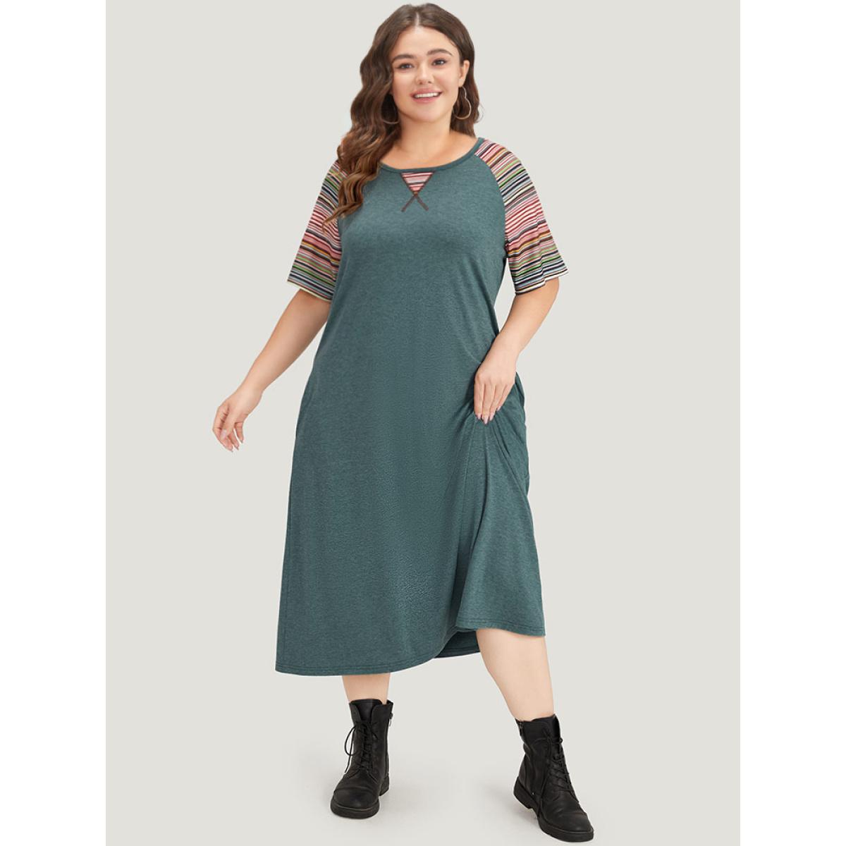 Plus Size Supersoft Essentials Striped Patchwork Pocket Stitch Raglan Sleeve Dress DarkGreen Women Casual Patchwork Round Neck Short sleeve Curvy Midi Dress BloomChic 10/M