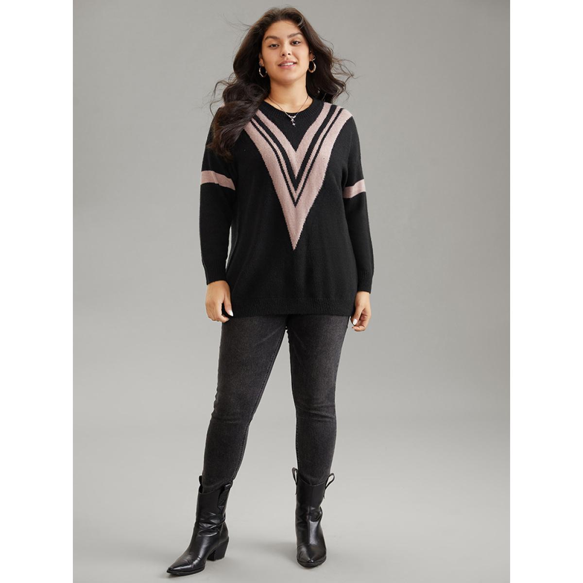 Plus Size Supersoft Essentials Geometric Jacquard Crew Neck Pullover Black Women Casual Loose Long Sleeve Round Neck Dailywear Pullovers BloomChic 14-16/1X