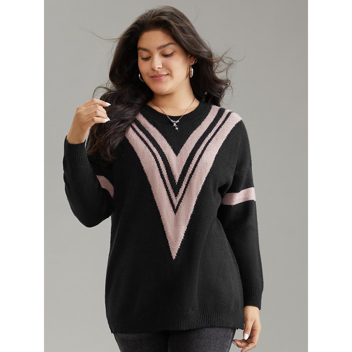 Plus Size Supersoft Essentials Colorblock Two Tone Patchwork V Neck Pullover Black Women Casual Loose Long Sleeve V-neck Dailywear Pullovers BloomChic 18-20/2X
