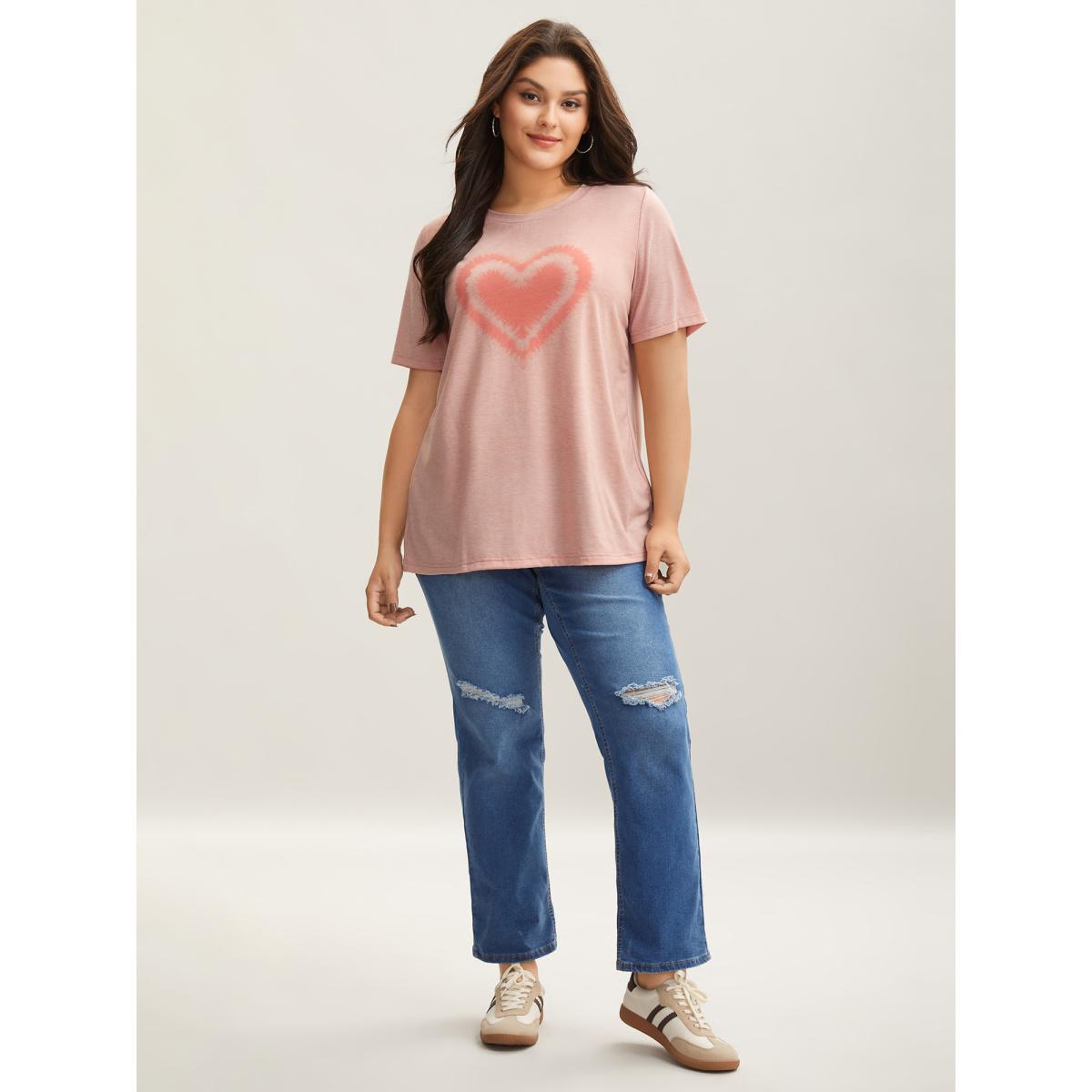 Plus Size Supersoft Heart Motif Tie-Dye Stretchy T-Shirt Lightpink Women Playful Non Round Neck Casual T-shirts BloomChic 10/M